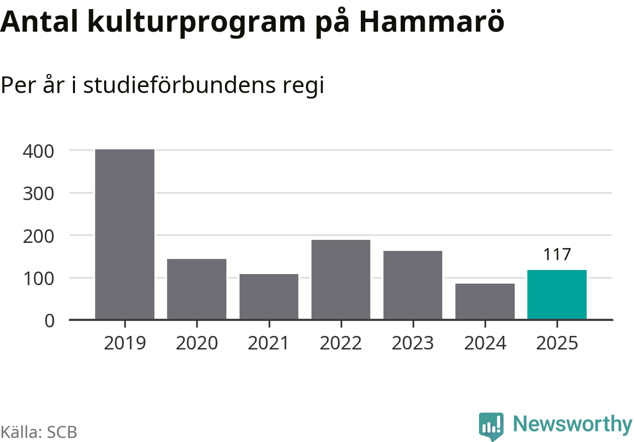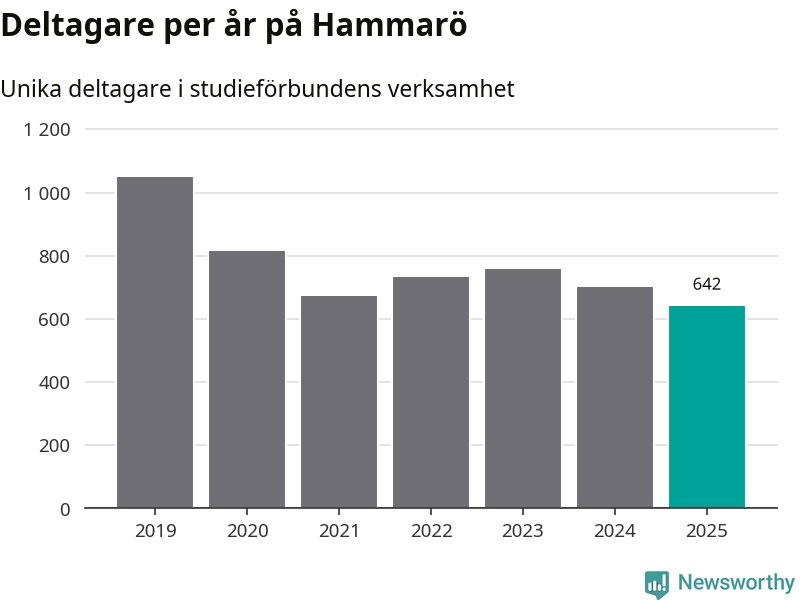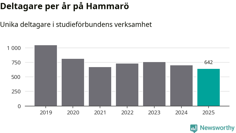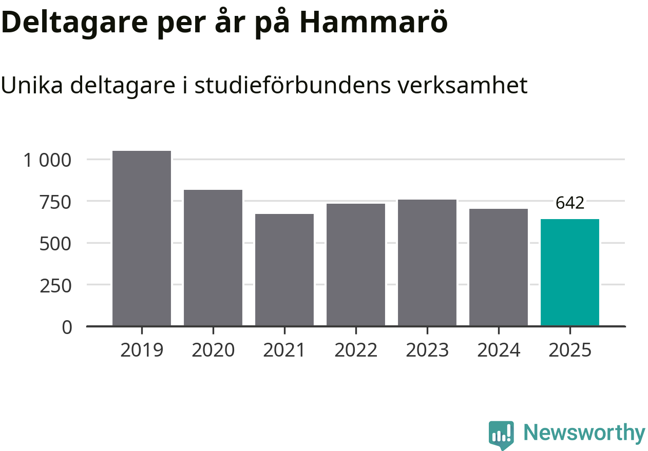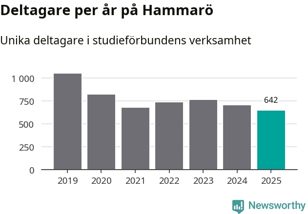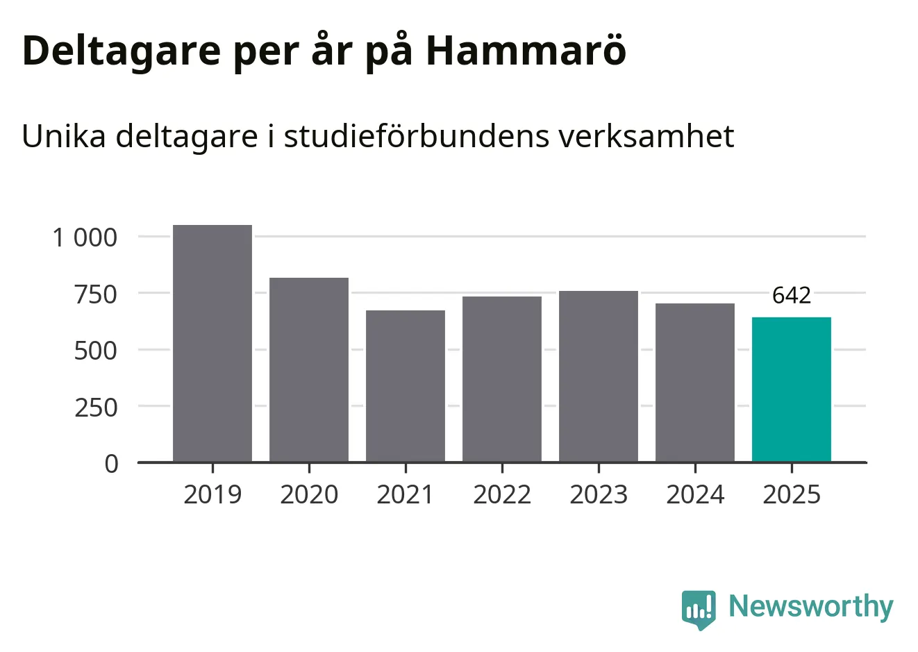 Även sett till unika deltagare är folkbildningen på tillbakagång på Hammarö. 2025 deltog 642 personer i studieförbundens verksamhet, vilket är en minskning med åtta procent jämfört med året innan. Det innebär att fyra procent av befolkningen i kommunen deltog i studieförbundens verksamhet under 2025, vilket är ungefär som rikssnittet.