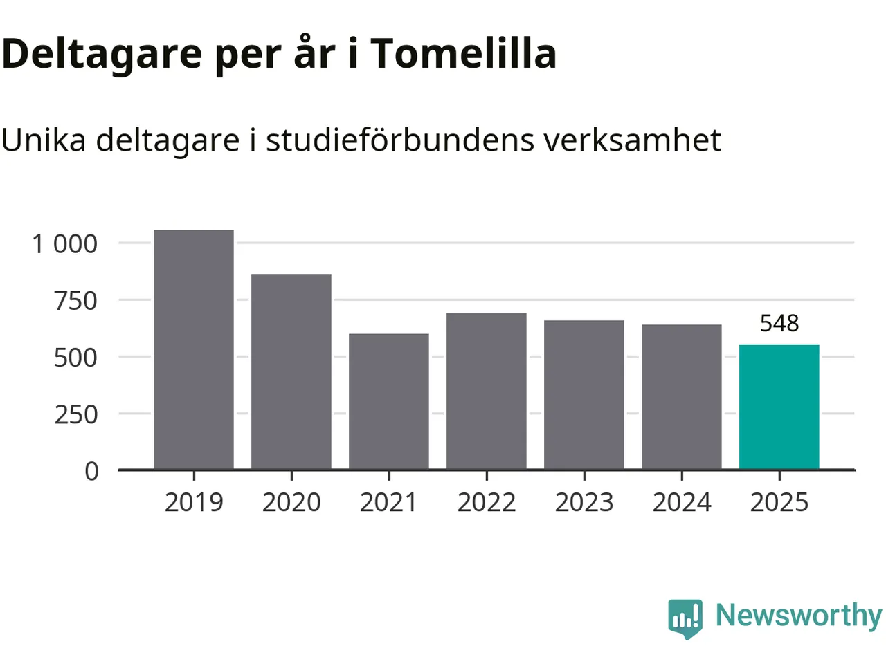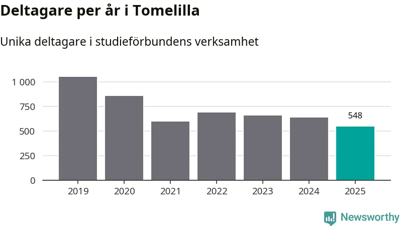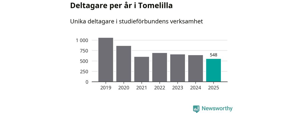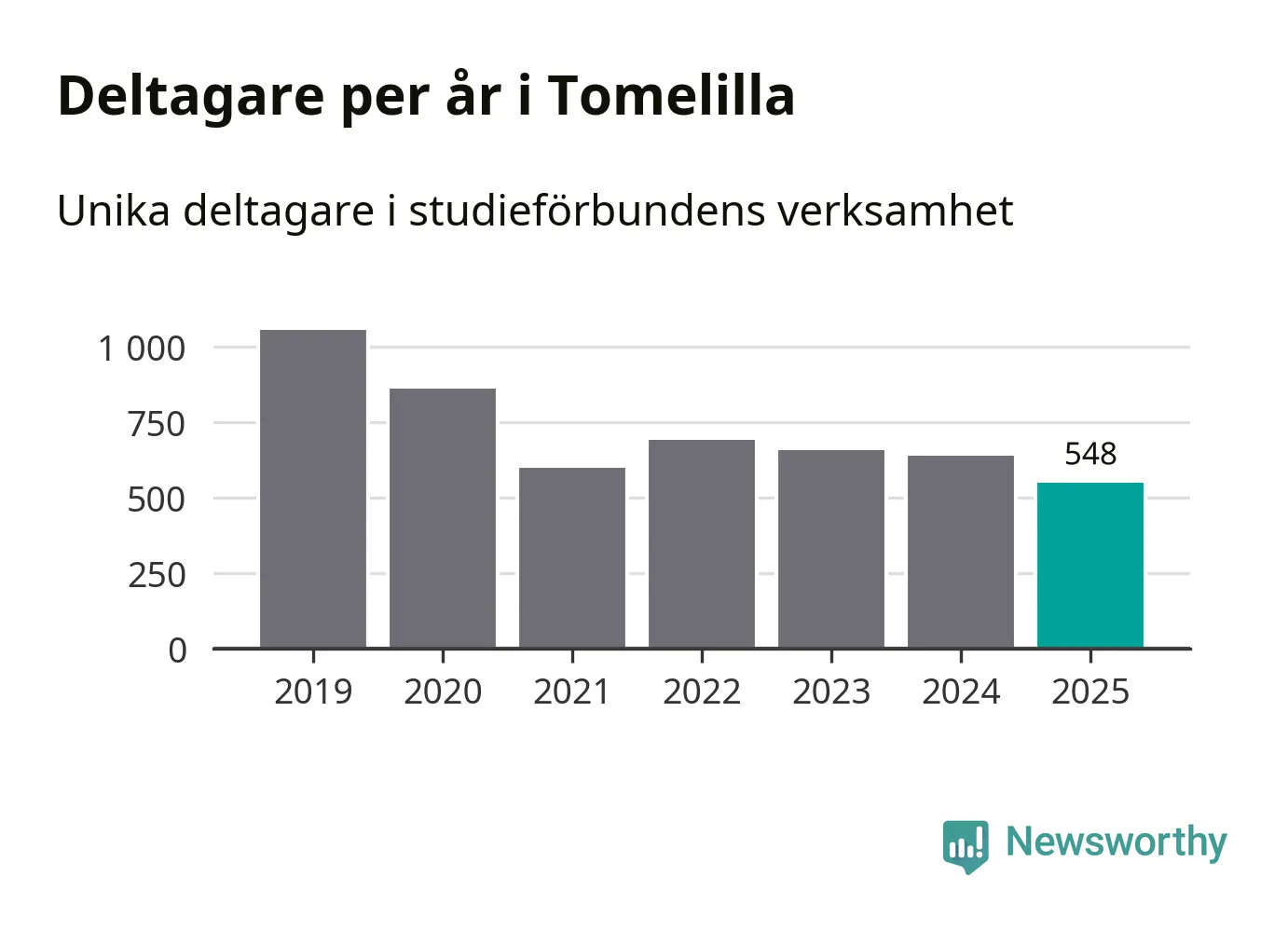 Även sett till unika deltagare är folkbildningen på tillbakagång i Tomelilla. 2025 deltog 548 personer i studieförbundens verksamhet, vilket är en minskning med 14 procent jämfört med året innan. Det innebär att fyra procent av befolkningen i kommunen deltog i studieförbundens verksamhet under 2025, vilket är ungefär som rikssnittet.