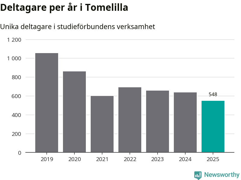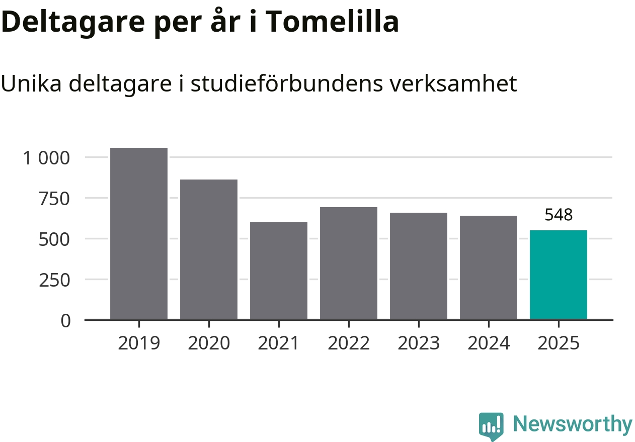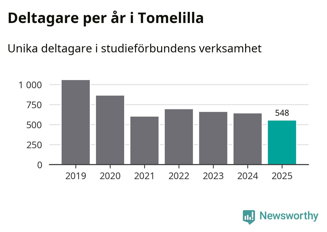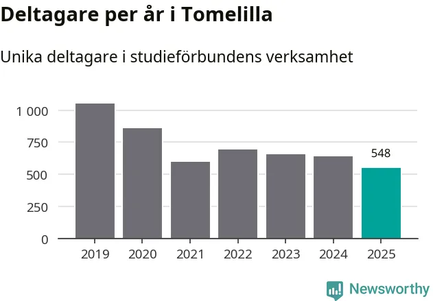 Även sett till unika deltagare är folkbildningen på tillbakagång i Tomelilla. 2025 deltog 548 personer i studieförbundens verksamhet, vilket är en minskning med 14 procent jämfört med året innan. Det innebär att fyra procent av befolkningen i kommunen deltog i studieförbundens verksamhet under 2025, vilket är ungefär som rikssnittet.