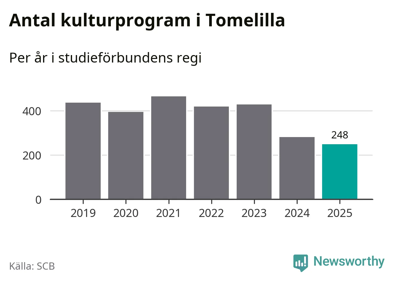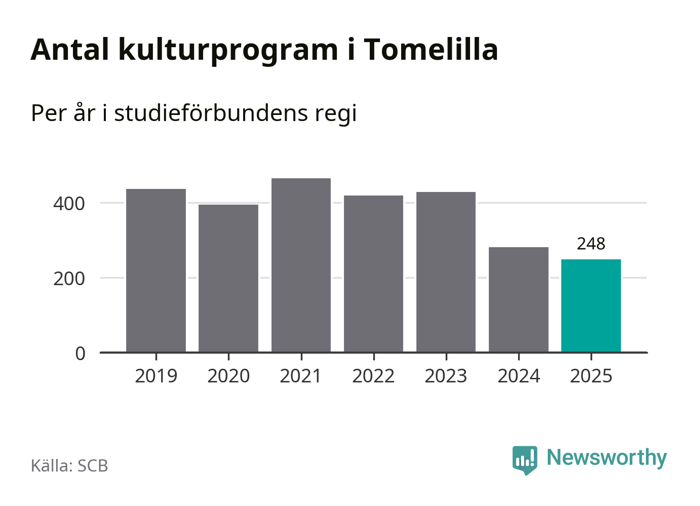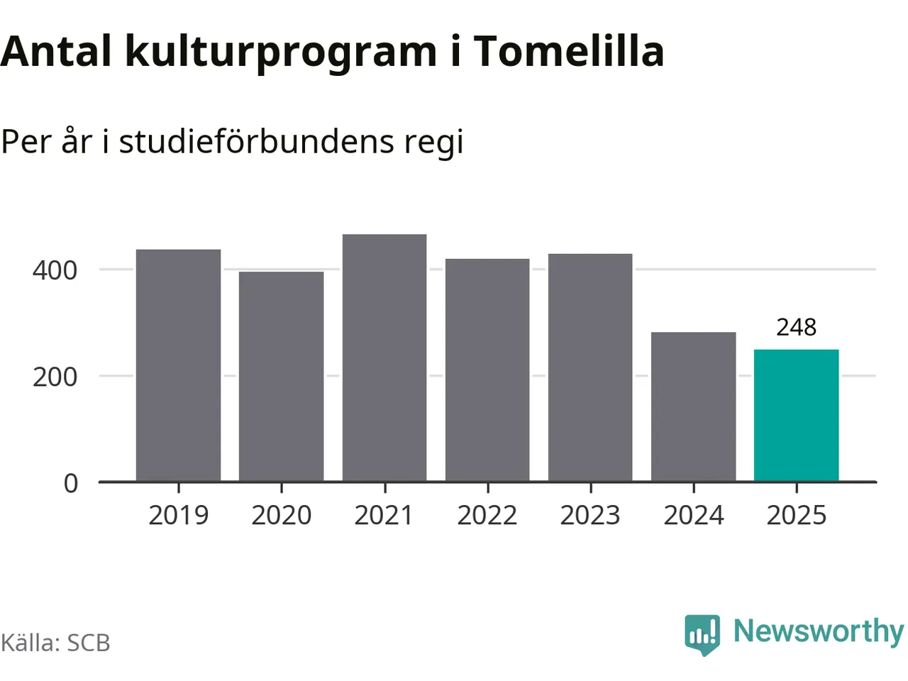 I Tomelilla är minskningen ännu större: förra året hade studieförbunden drygt 2 900 studietimmar i kommunen, vilket är mer än en halvering jämfört med året innan. Även antalet kulturprogram i studieförbundens regi minskade, från 281 till 248 stycken.