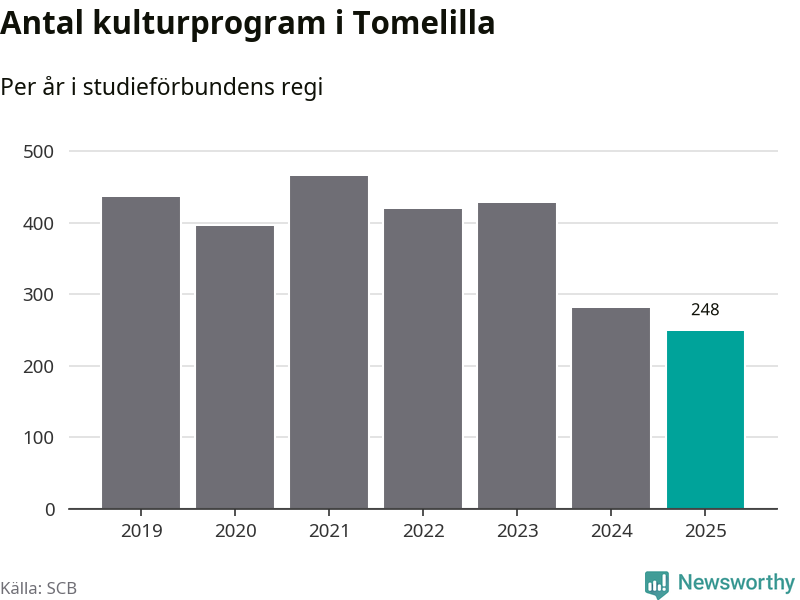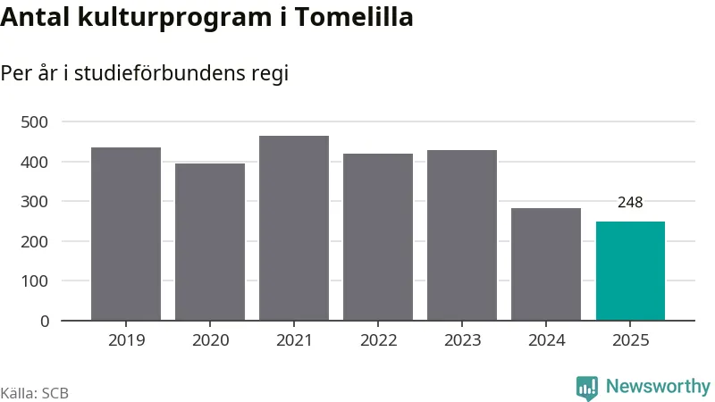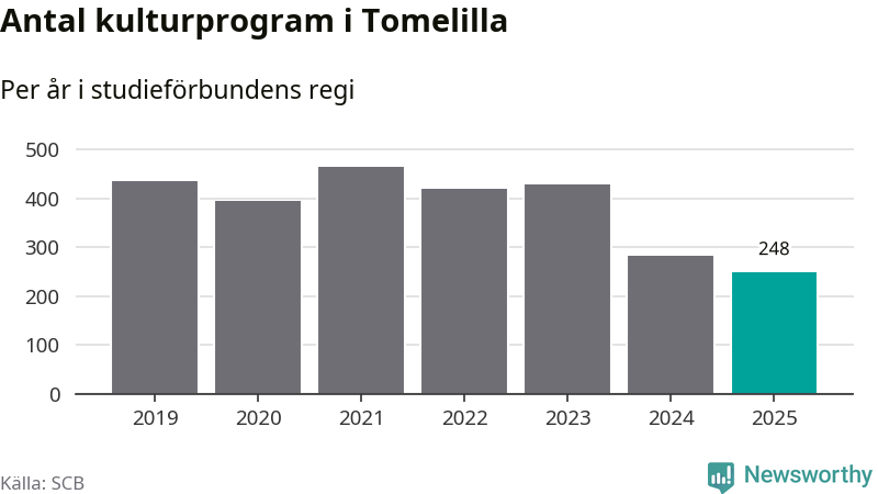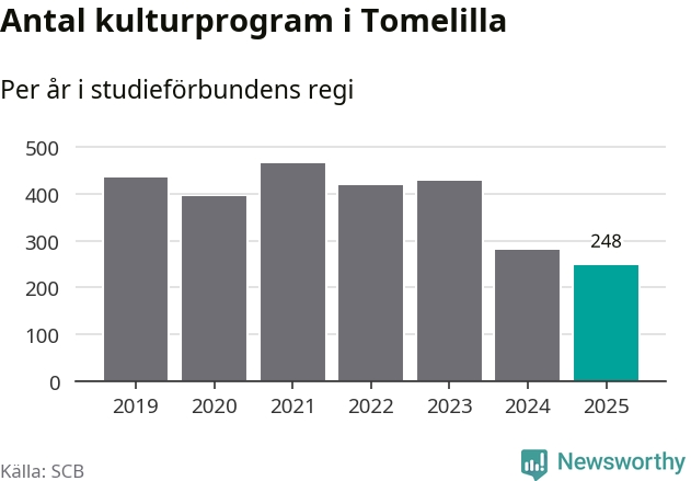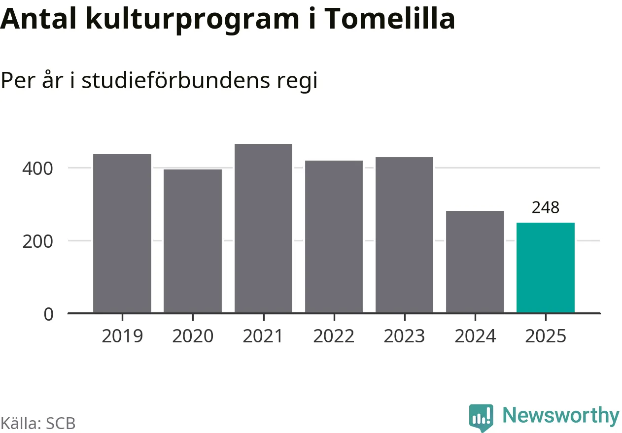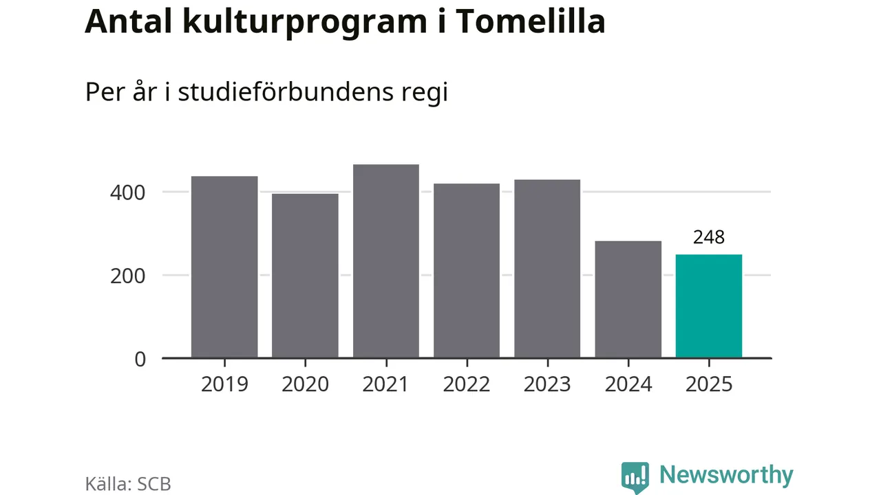 I Tomelilla är minskningen ännu större: förra året hade studieförbunden drygt 2 900 studietimmar i kommunen, vilket är mer än en halvering jämfört med året innan. Även antalet kulturprogram i studieförbundens regi minskade, från 281 till 248 stycken.
