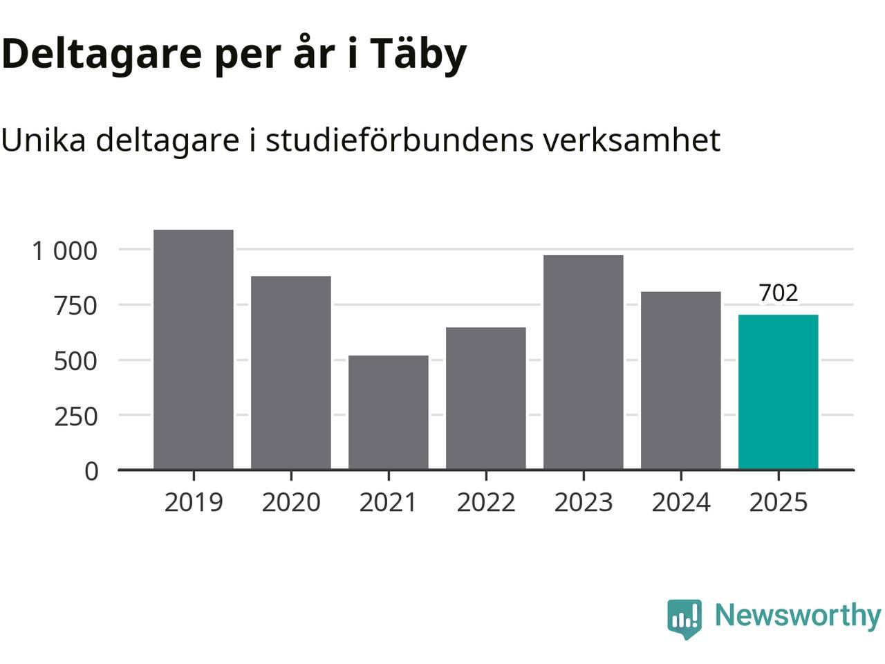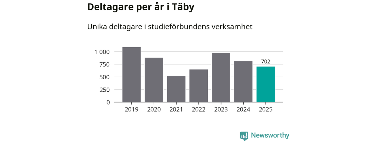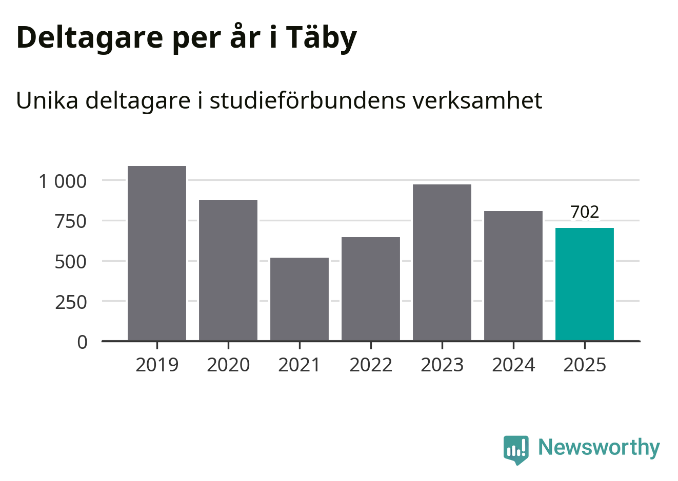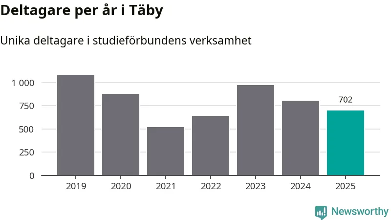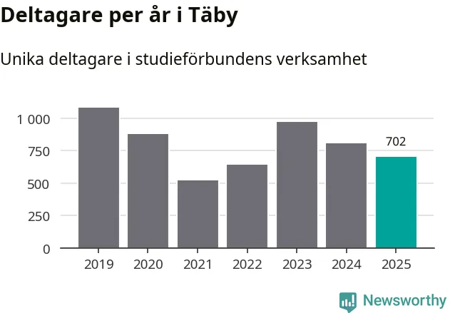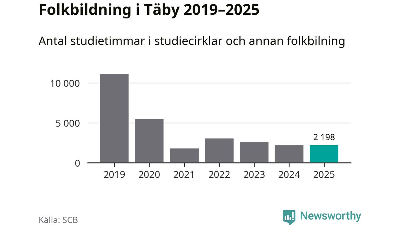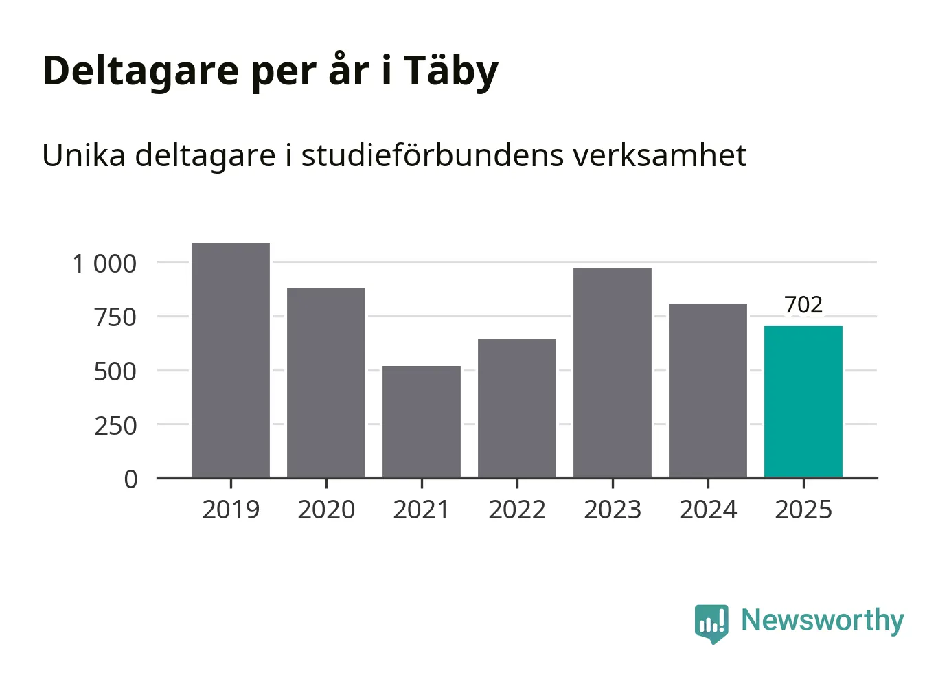Sett till unika deltagare är folkbildningen på tillbakagång i Täby. 2025 deltog 702 personer i studieförbundens verksamhet, vilket är en minskning med 13 procent jämfört med året innan. Det innebär att en procent av befolkningen i kommunen deltog i studieförbundens verksamhet under 2025 och det är den tredje lägsta andelen i landet.
