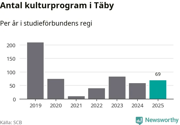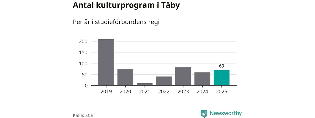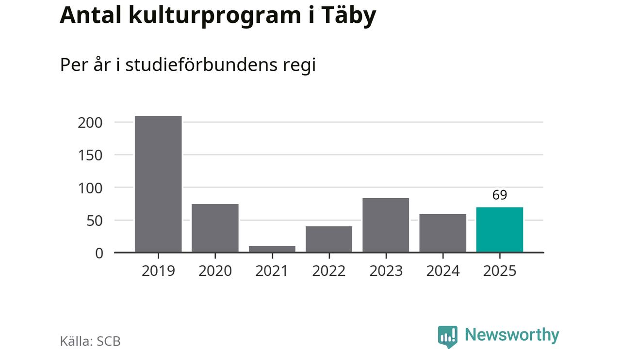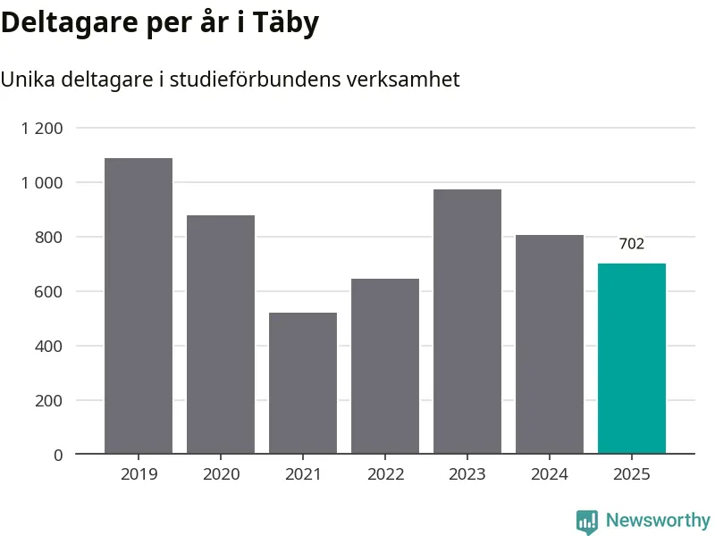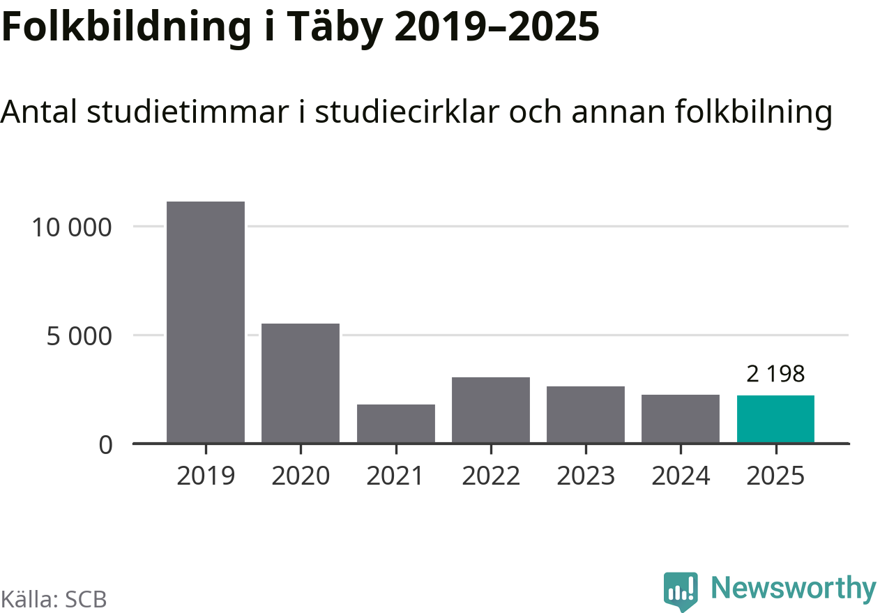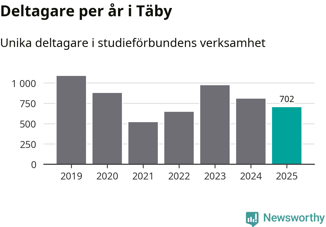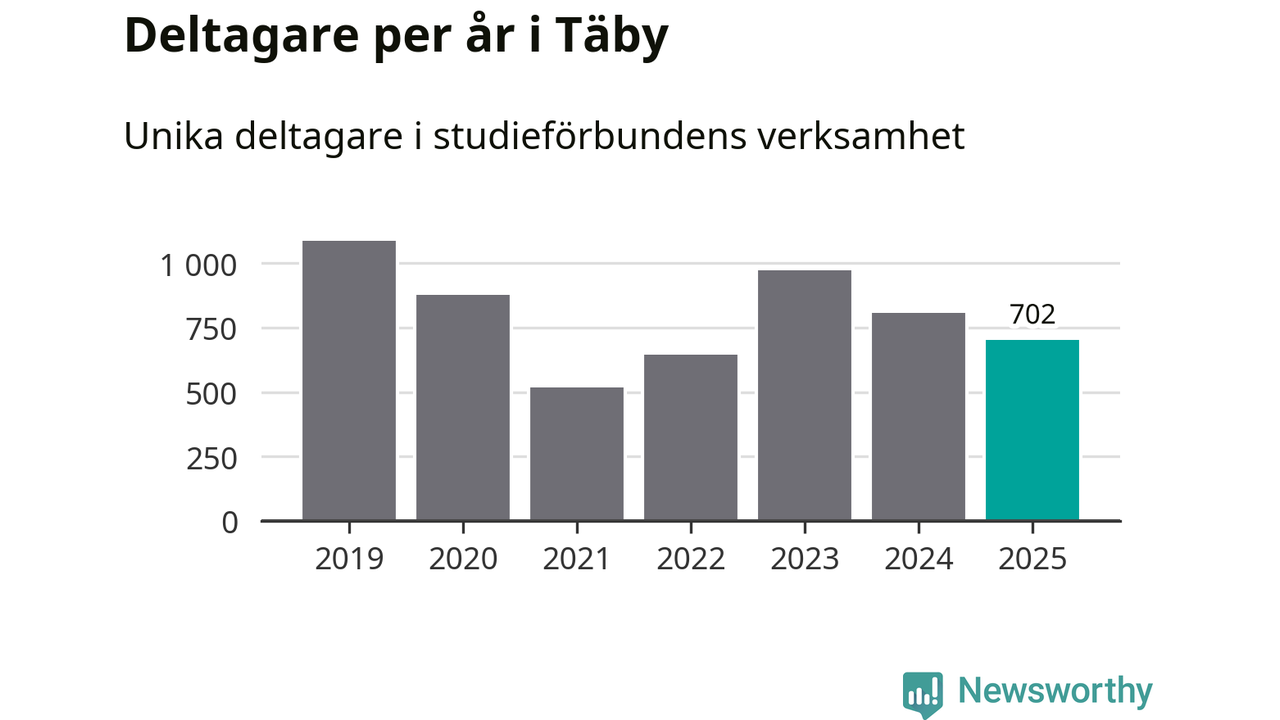 Sett till unika deltagare är folkbildningen på tillbakagång i Täby. 2025 deltog 702 personer i studieförbundens verksamhet, vilket är en minskning med 13 procent jämfört med året innan. Det innebär att en procent av befolkningen i kommunen deltog i studieförbundens verksamhet under 2025 och det är den tredje lägsta andelen i landet.