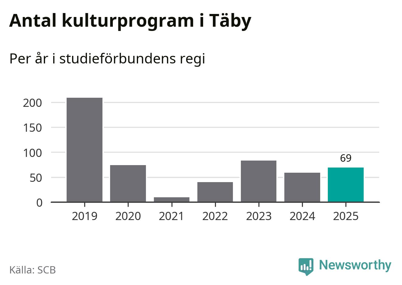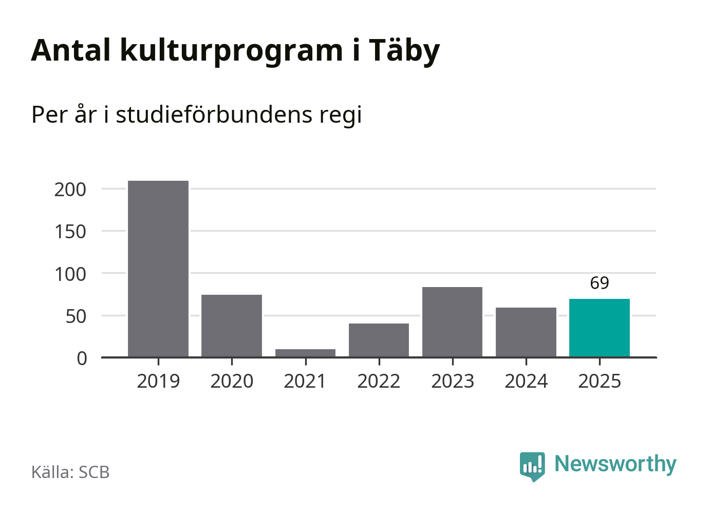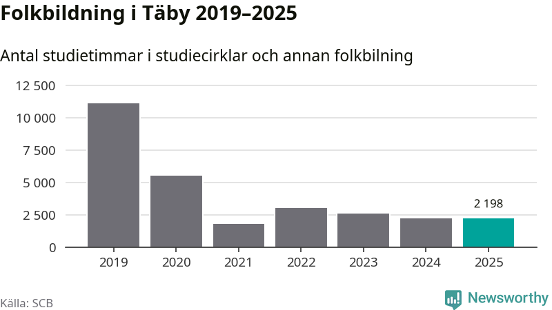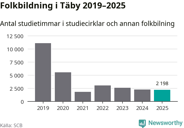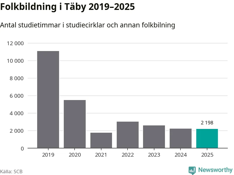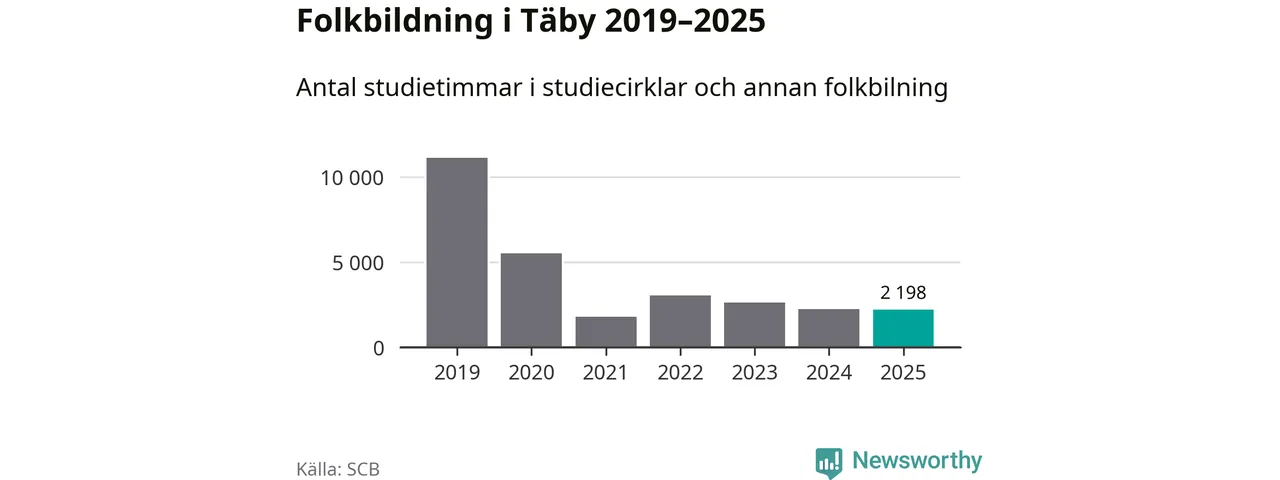 Studieförbunden drabbades hårt av pandemin. Även i Täby noterades det lägsta antalet studietimmar under 2021, som då var 84 procent färre än 2019. År 2024 var antalet studietimmar åter högre men de var fortfarande långt från förpandeminivåerna.