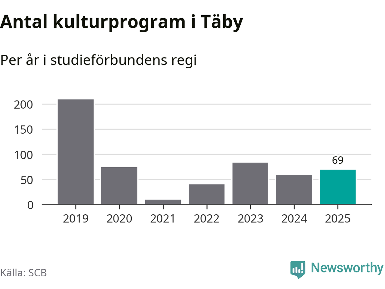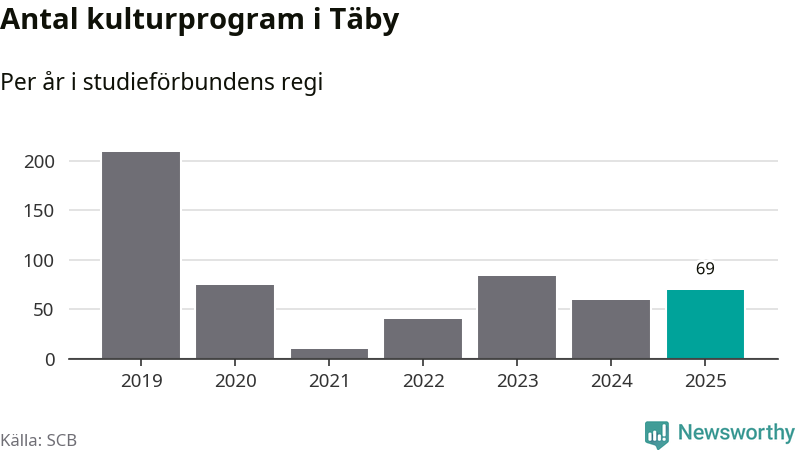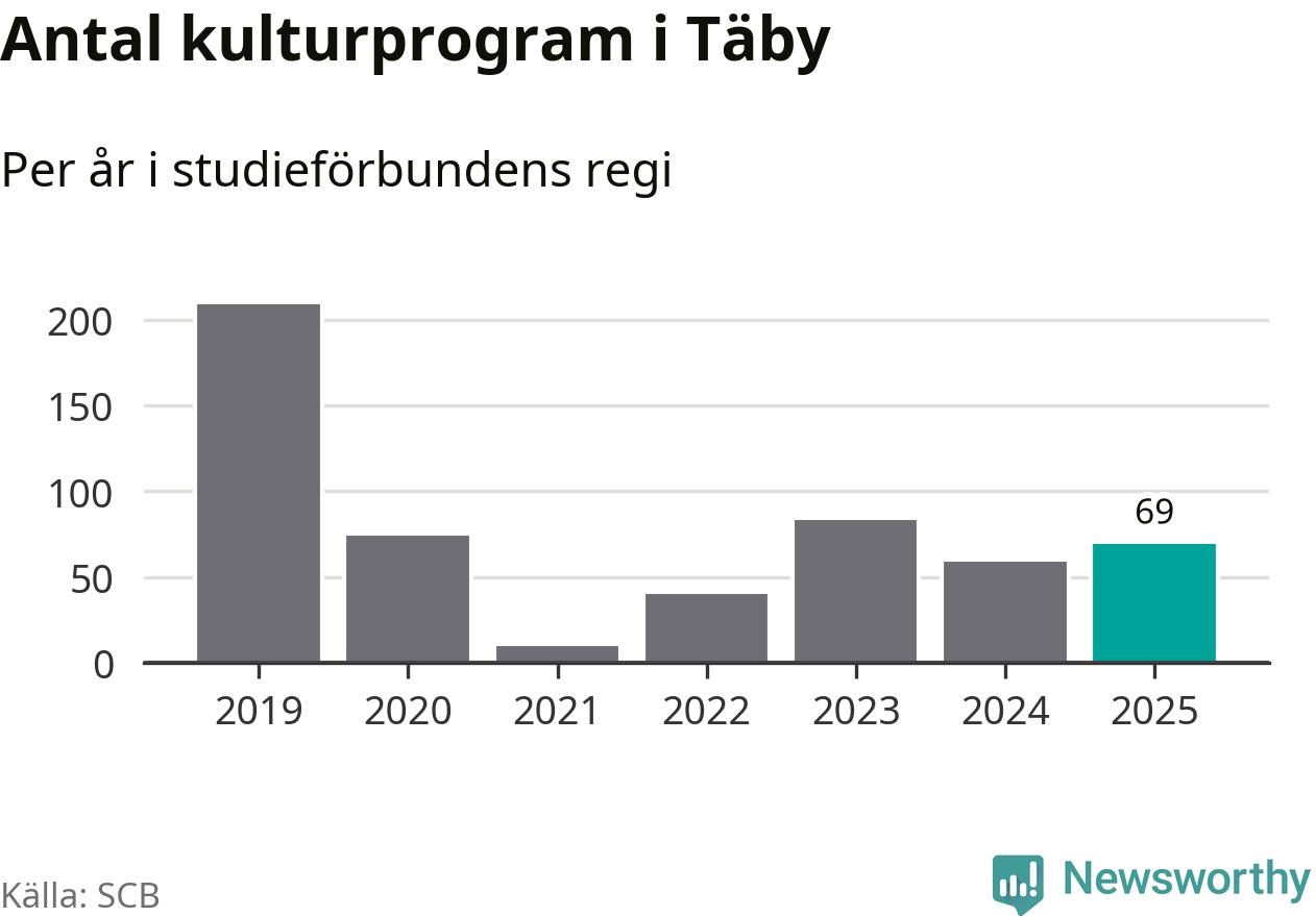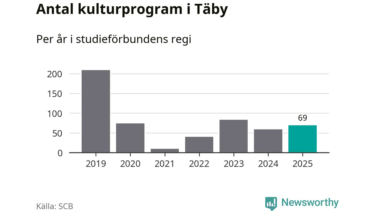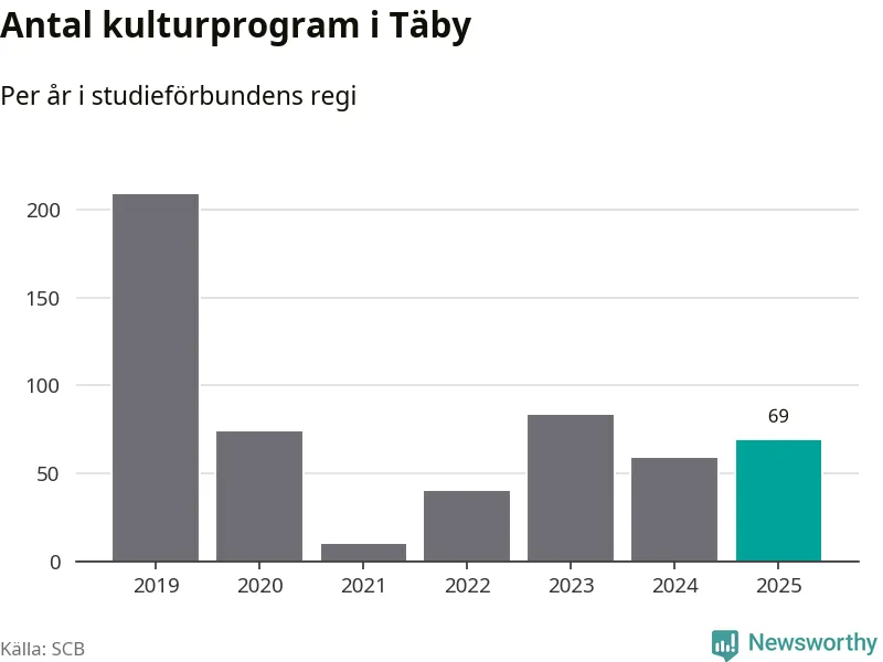 Studieförbunden drabbades hårt av pandemin. Även i Täby noterades det lägsta antalet studietimmar under 2021, som då var 84 procent färre än 2019. År 2024 var antalet studietimmar åter högre men de var fortfarande långt från förpandeminivåerna.