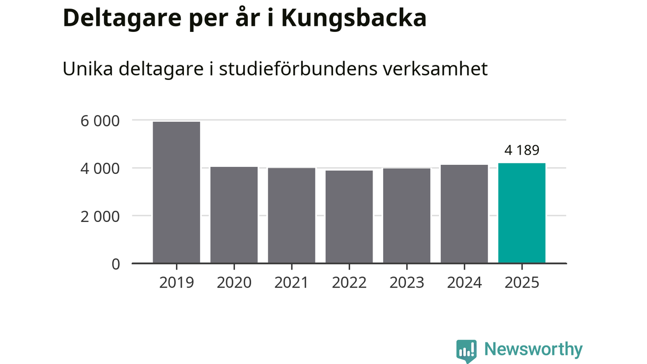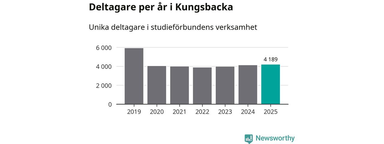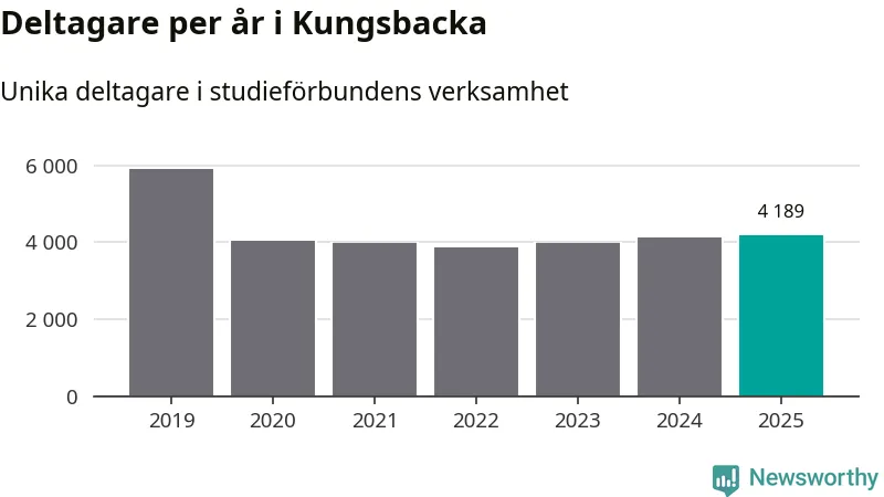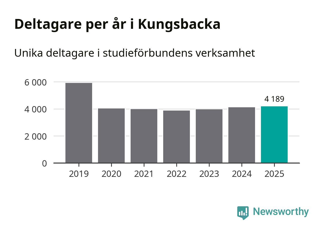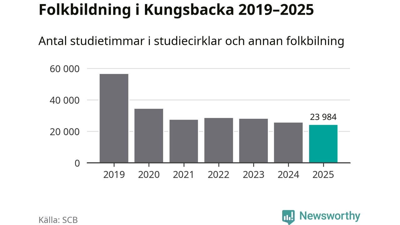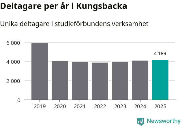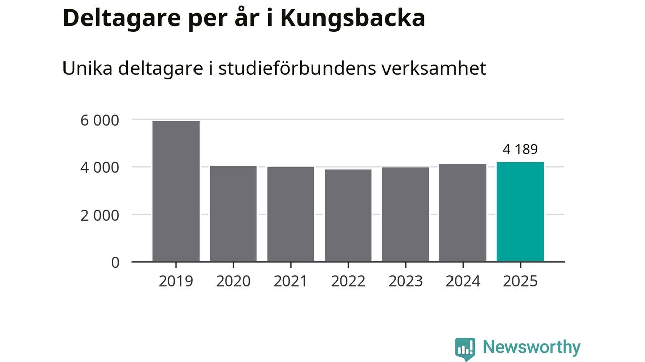 Omkring 4 200 Kungsbackabor deltog i någon form av folkbildning under 2025, vilket är ungefär lika många som året innan. Det innebär att fem procent av befolkningen i kommunen deltog i studieförbundens verksamhet under 2025, vilket är ungefär som rikssnittet.
