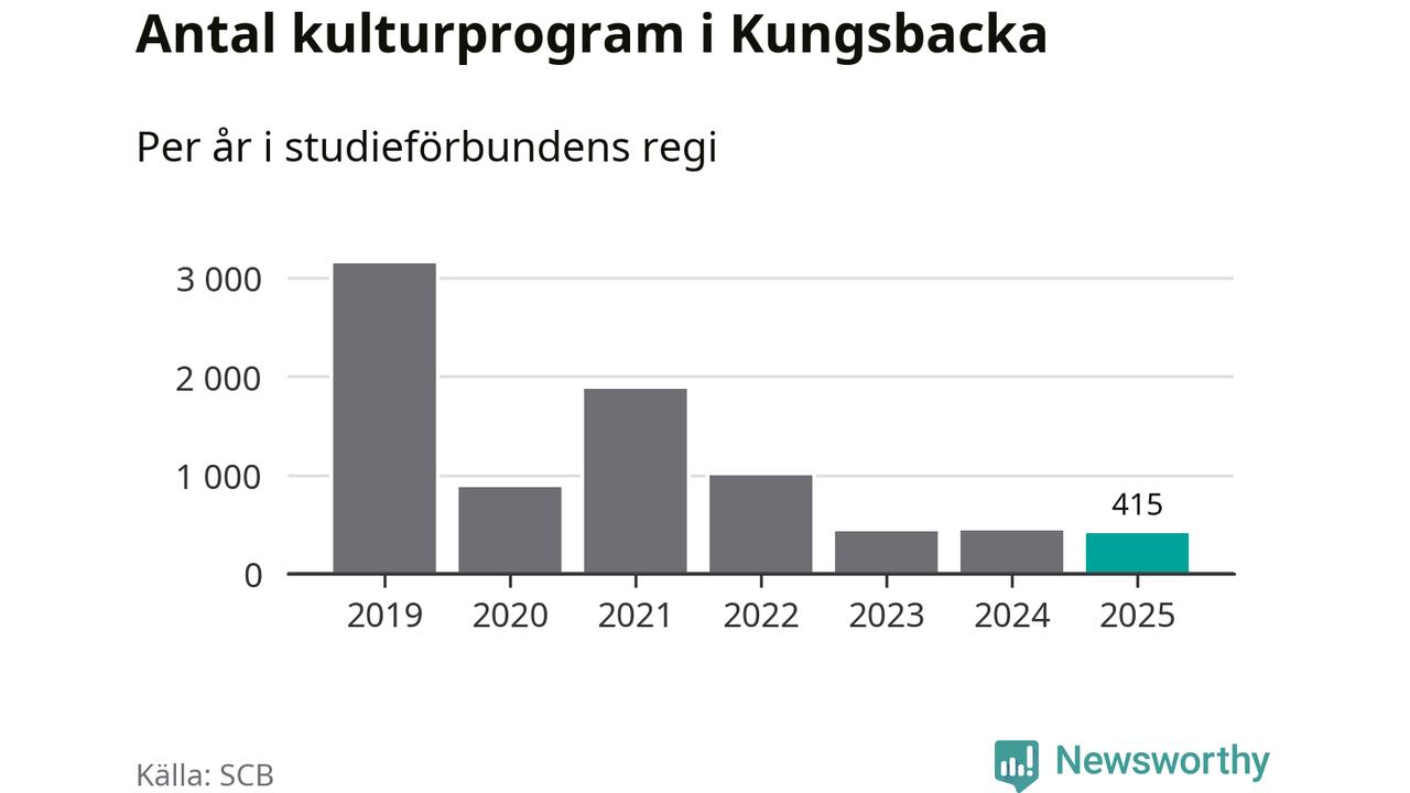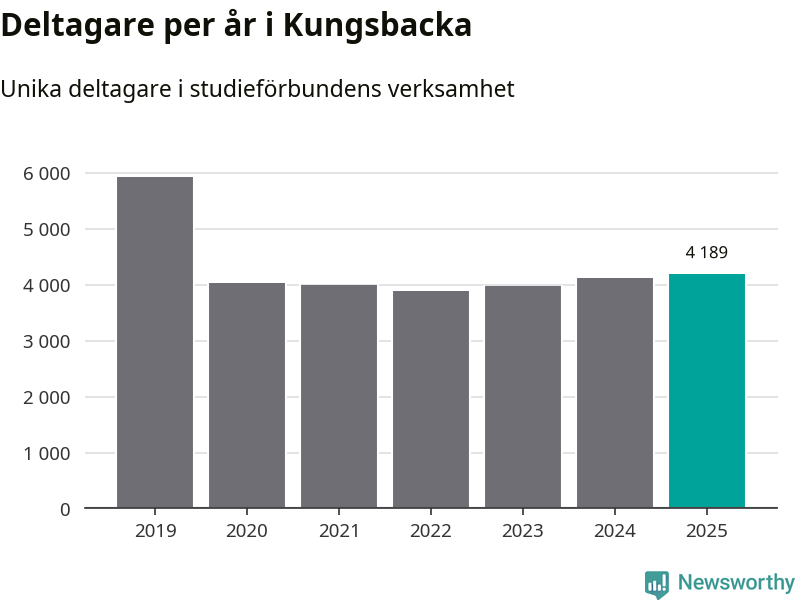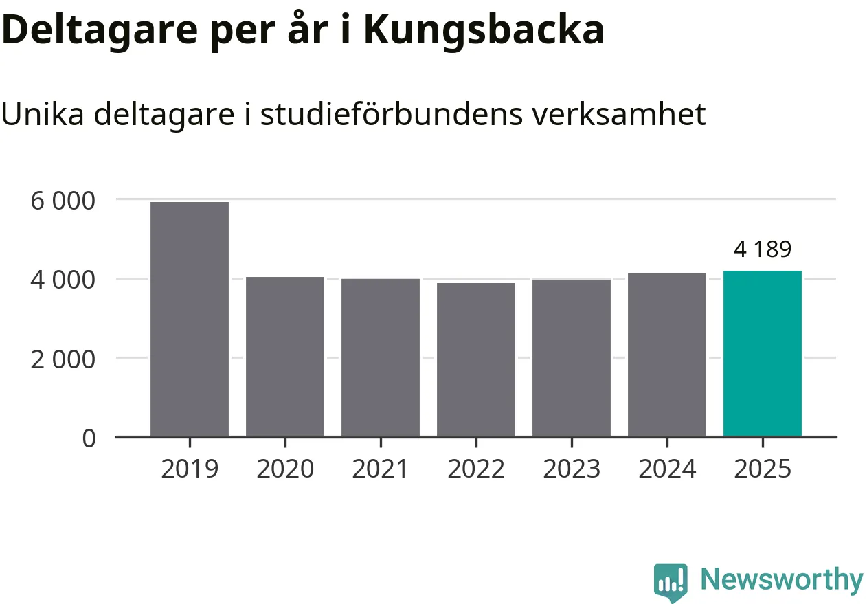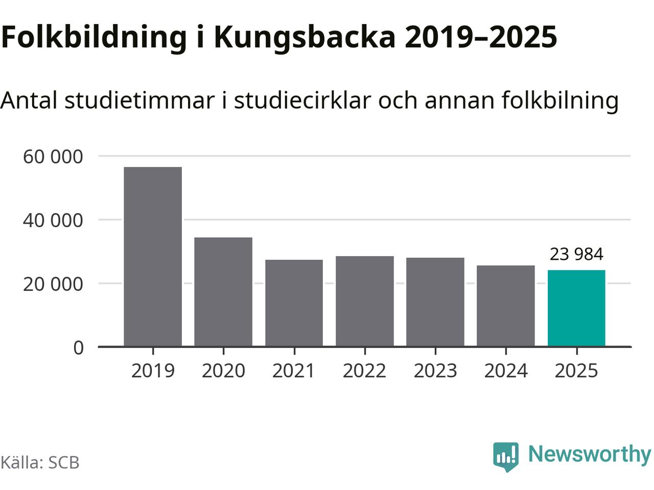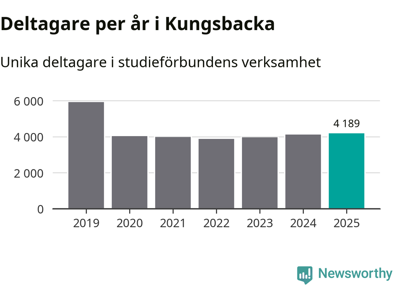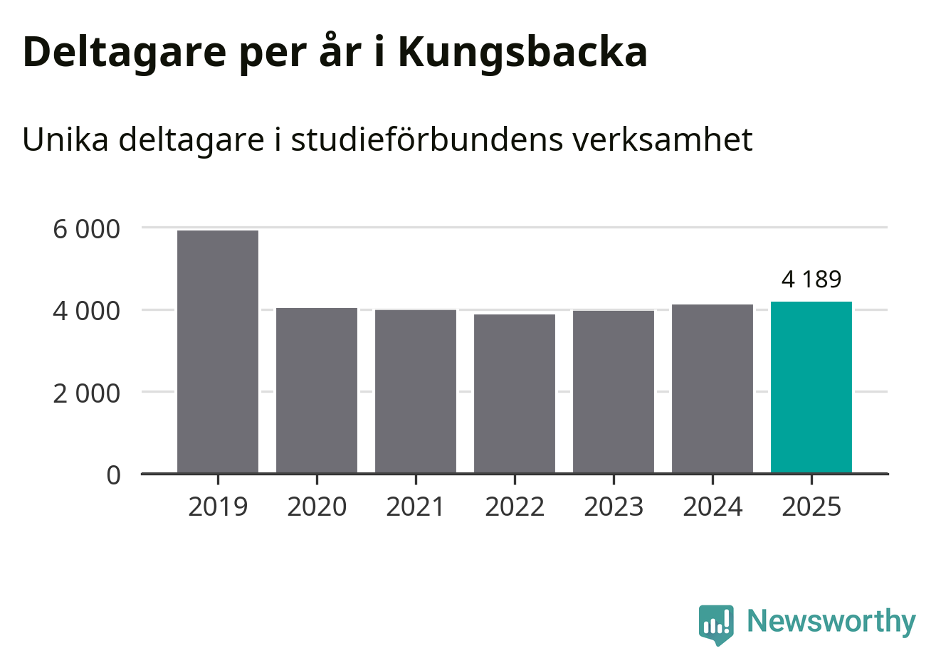 Omkring 4 200 Kungsbackabor deltog i någon form av folkbildning under 2025, vilket är ungefär lika många som året innan. Det innebär att fem procent av befolkningen i kommunen deltog i studieförbundens verksamhet under 2025, vilket är ungefär som rikssnittet.