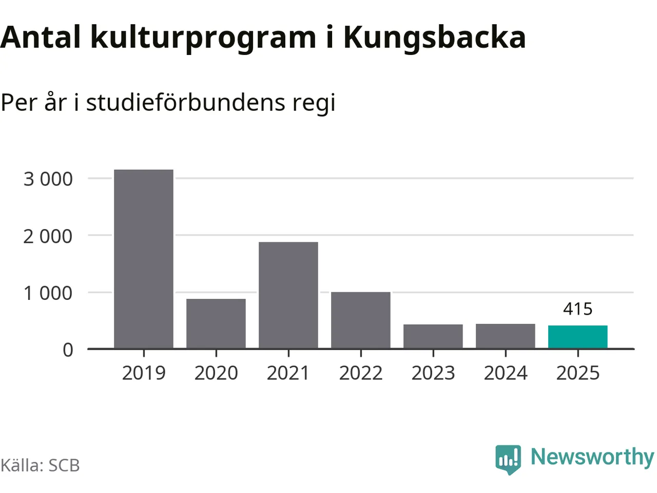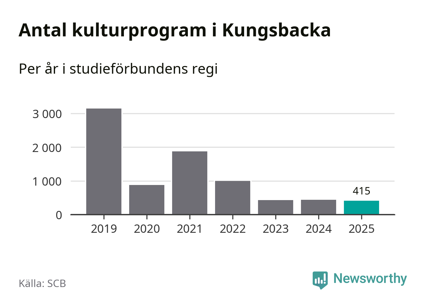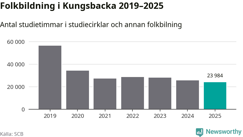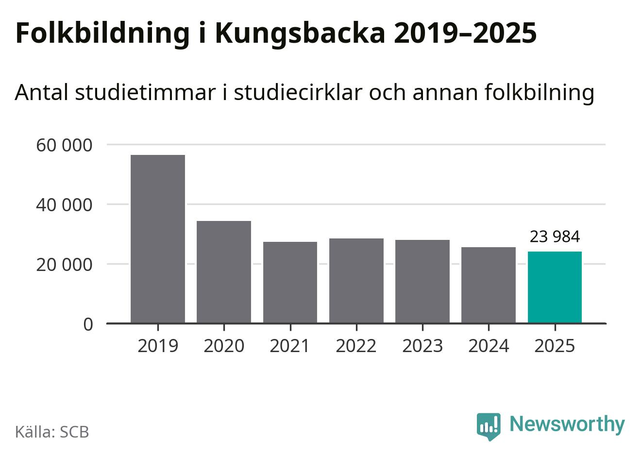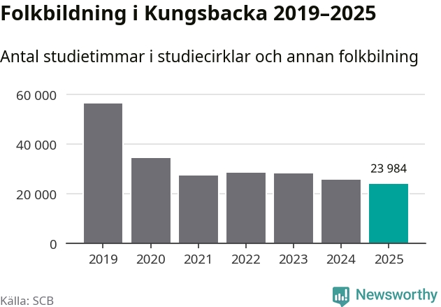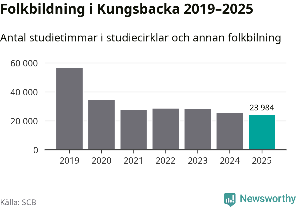 Omkring 4 200 Kungsbackabor deltog i någon form av folkbildning under 2025, vilket är ungefär lika många som året innan. Det innebär att fem procent av befolkningen i kommunen deltog i studieförbundens verksamhet under 2025, vilket är ungefär som rikssnittet.