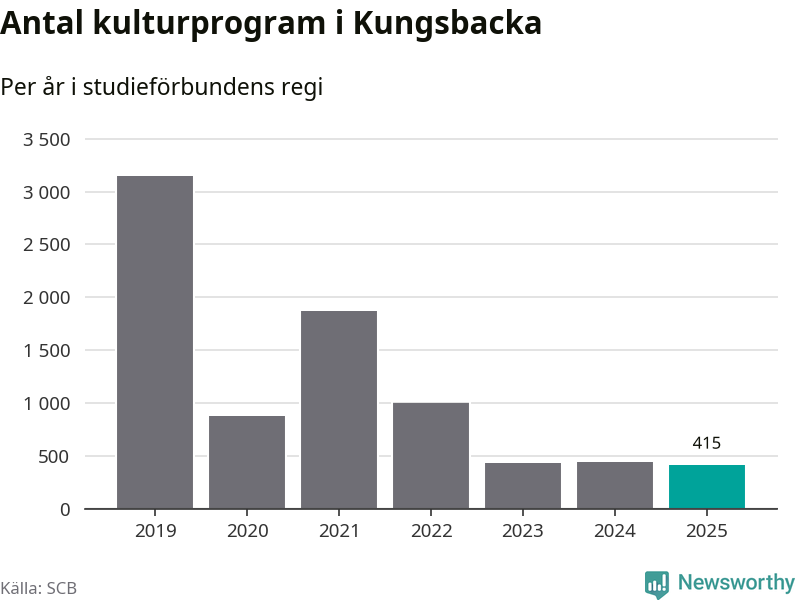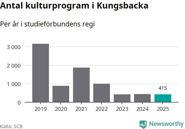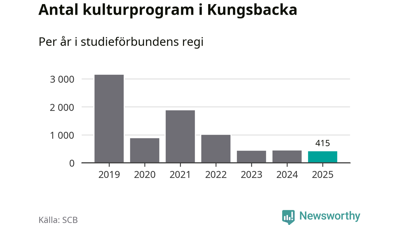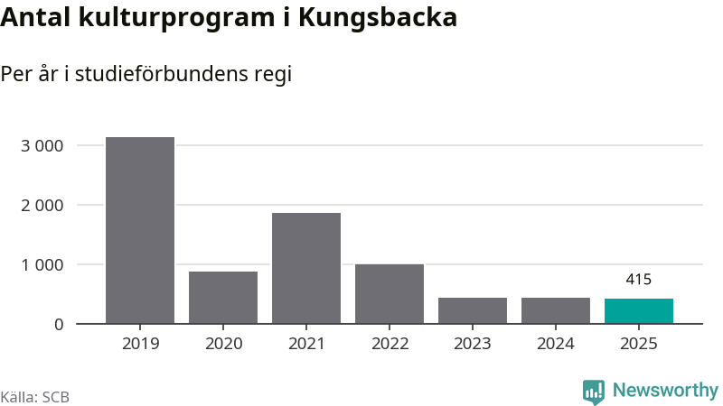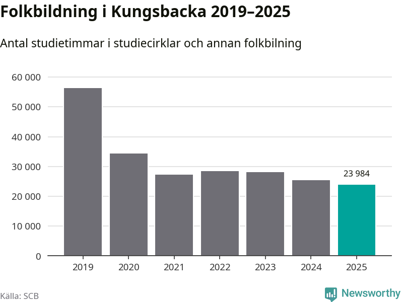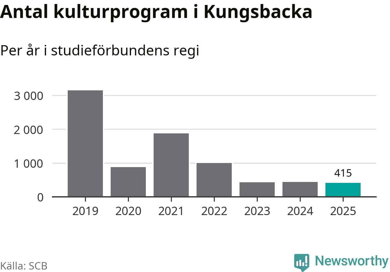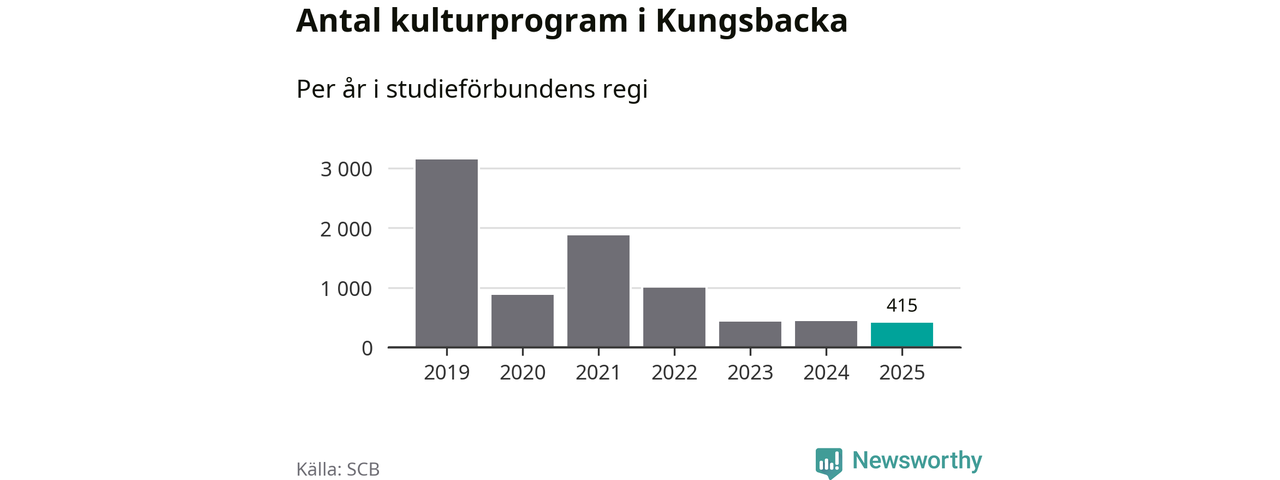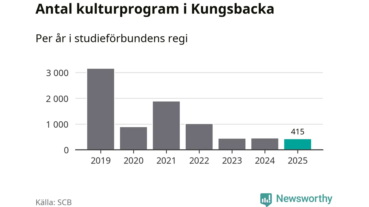 Omkring 4 200 Kungsbackabor deltog i någon form av folkbildning under 2025, vilket är ungefär lika många som året innan. Det innebär att fem procent av befolkningen i kommunen deltog i studieförbundens verksamhet under 2025, vilket är ungefär som rikssnittet.