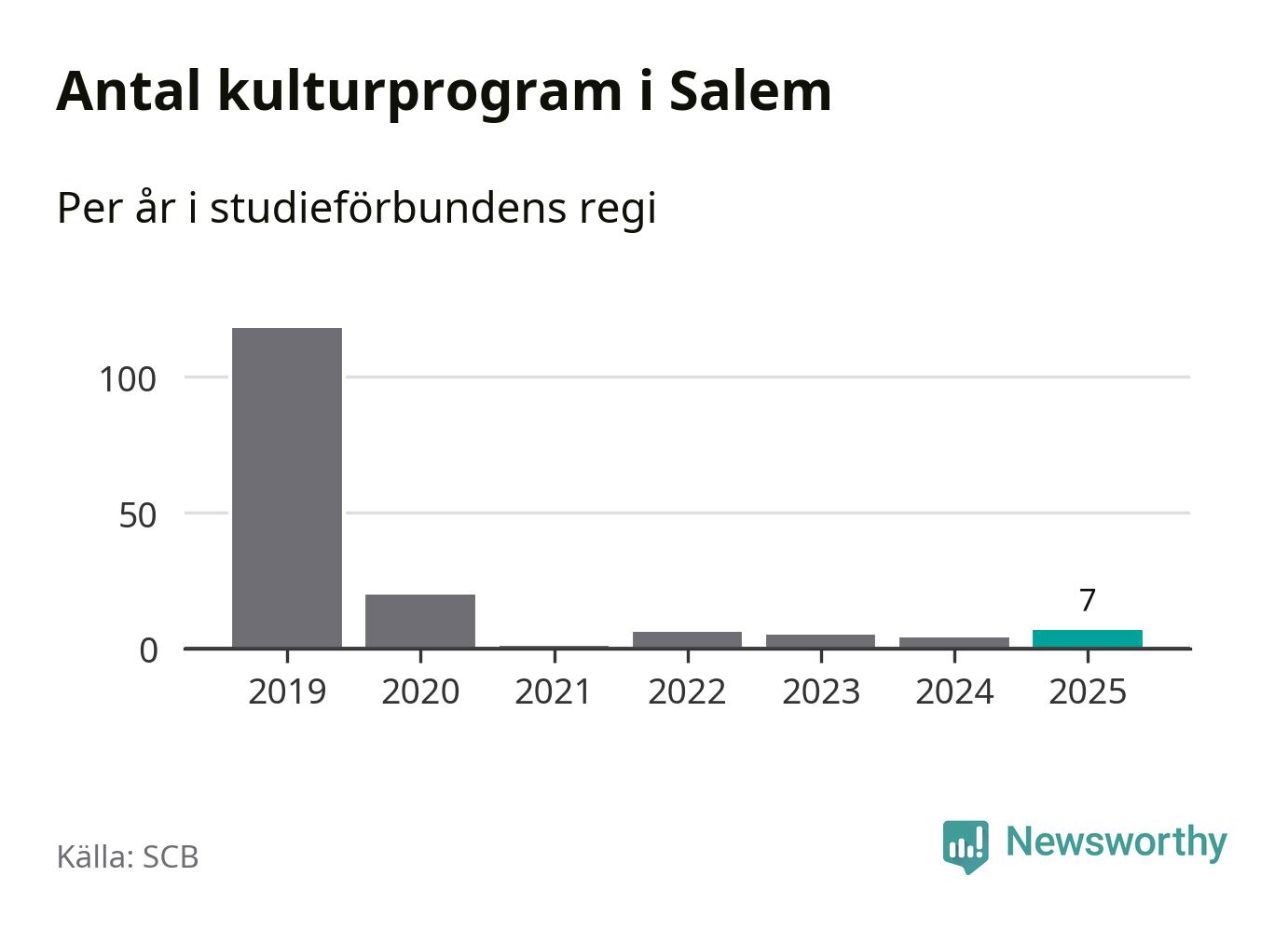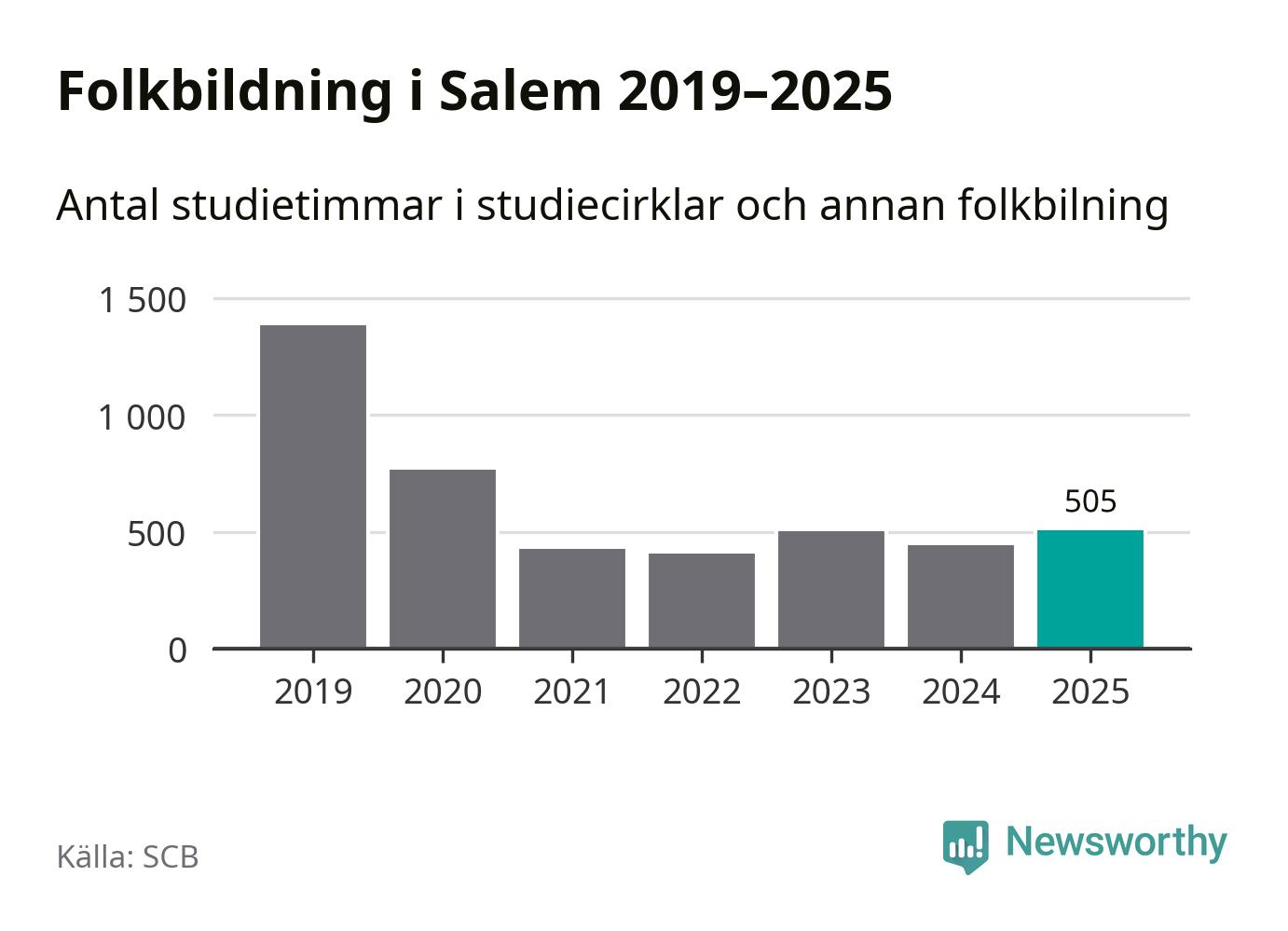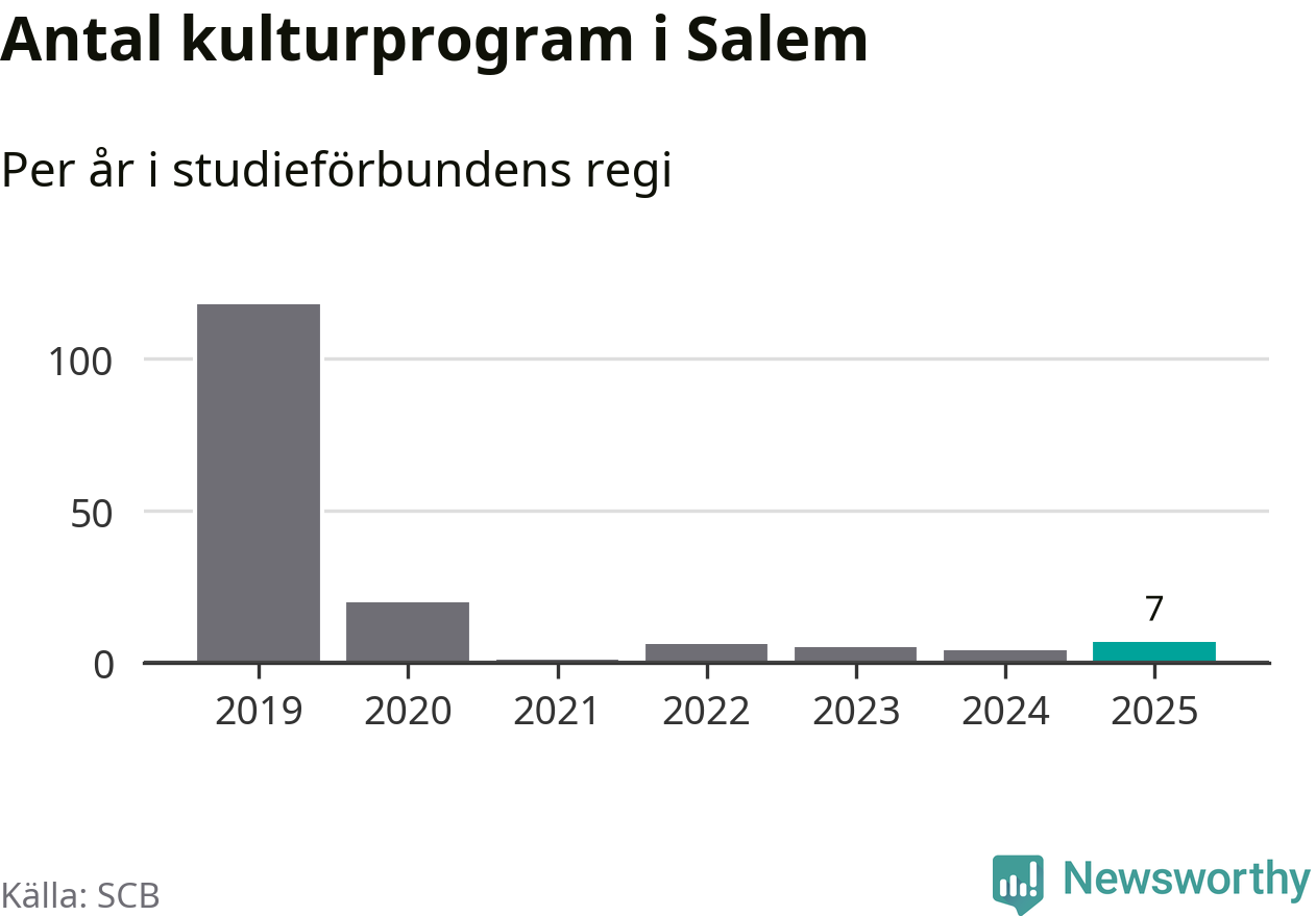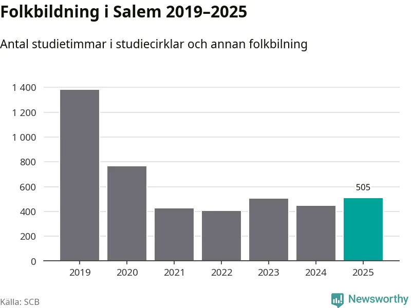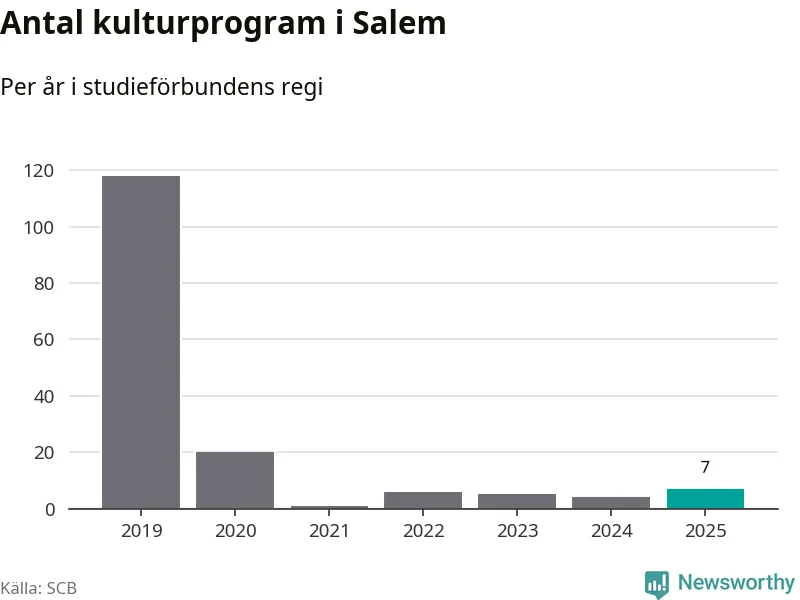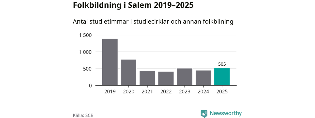 Fem av de studieförbund som 2025 fick bidrag från Folkbildningsrådet har haft någon form av verksamhet – antingen studiecirkel, annan folkbildning eller kulturprogram – i Salem under de två senaste åren. Under 2025 ökade ABF, NBV och Bilda antalet studietimmar i kommunen jämfört med året innan. Folkuniversitetet har bara arrangerat kulturprogram under 2025.