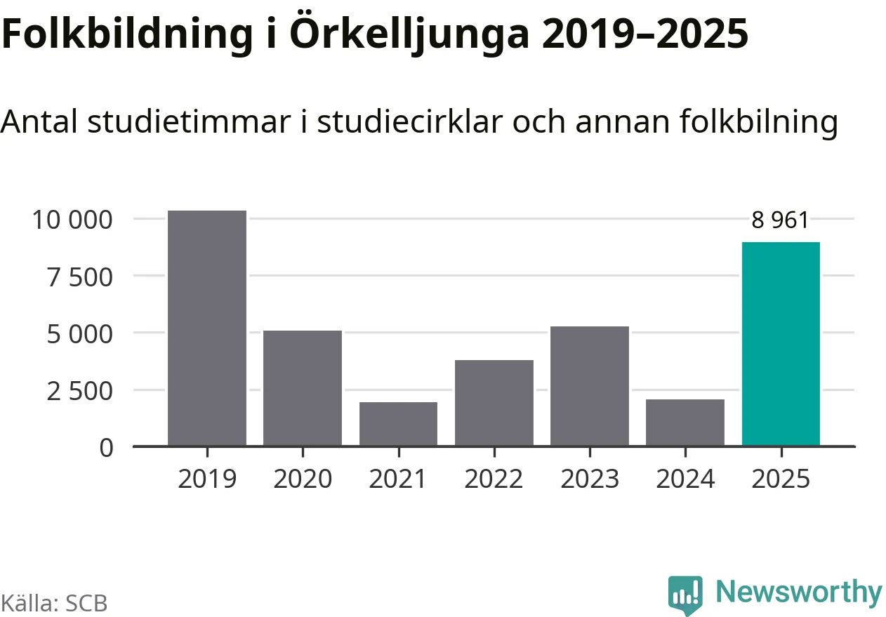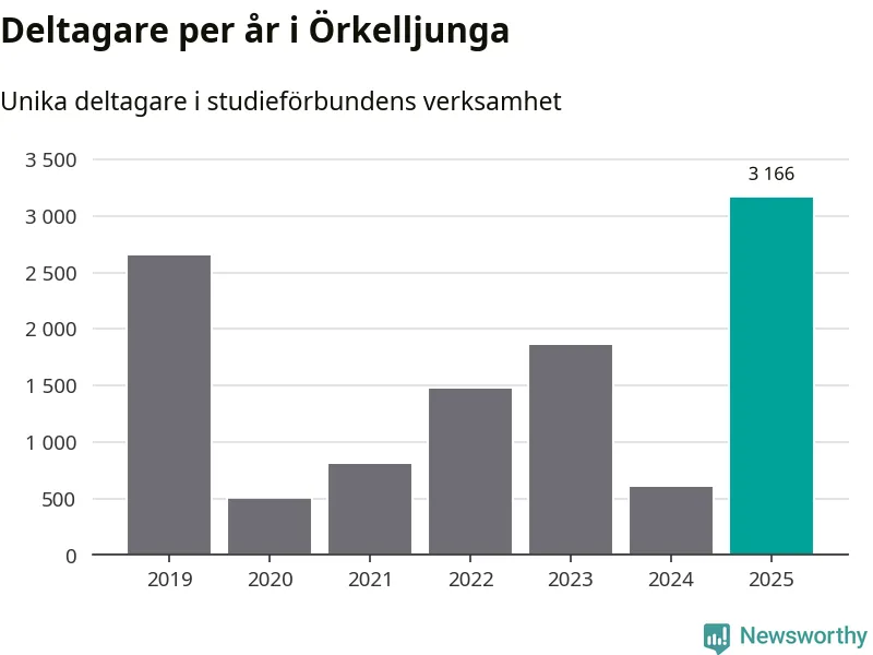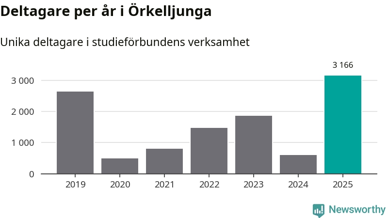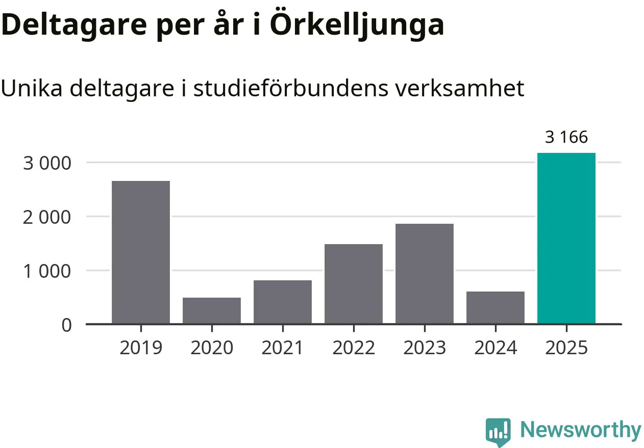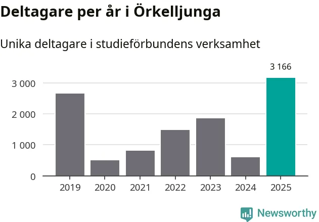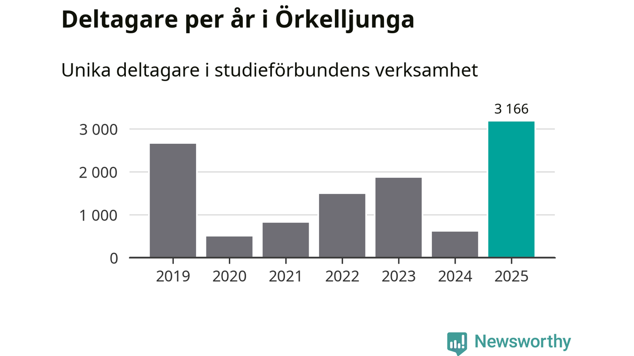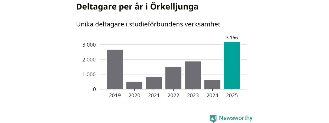 Även antalet unika deltagare ökade i Örkelljunga i fjol: från 603 till 3 166 personer. Det innebär att 31 procent av befolkningen i kommunen deltog i studieförbundens verksamhet under 2025. Det är den högsta andelen i landet.
