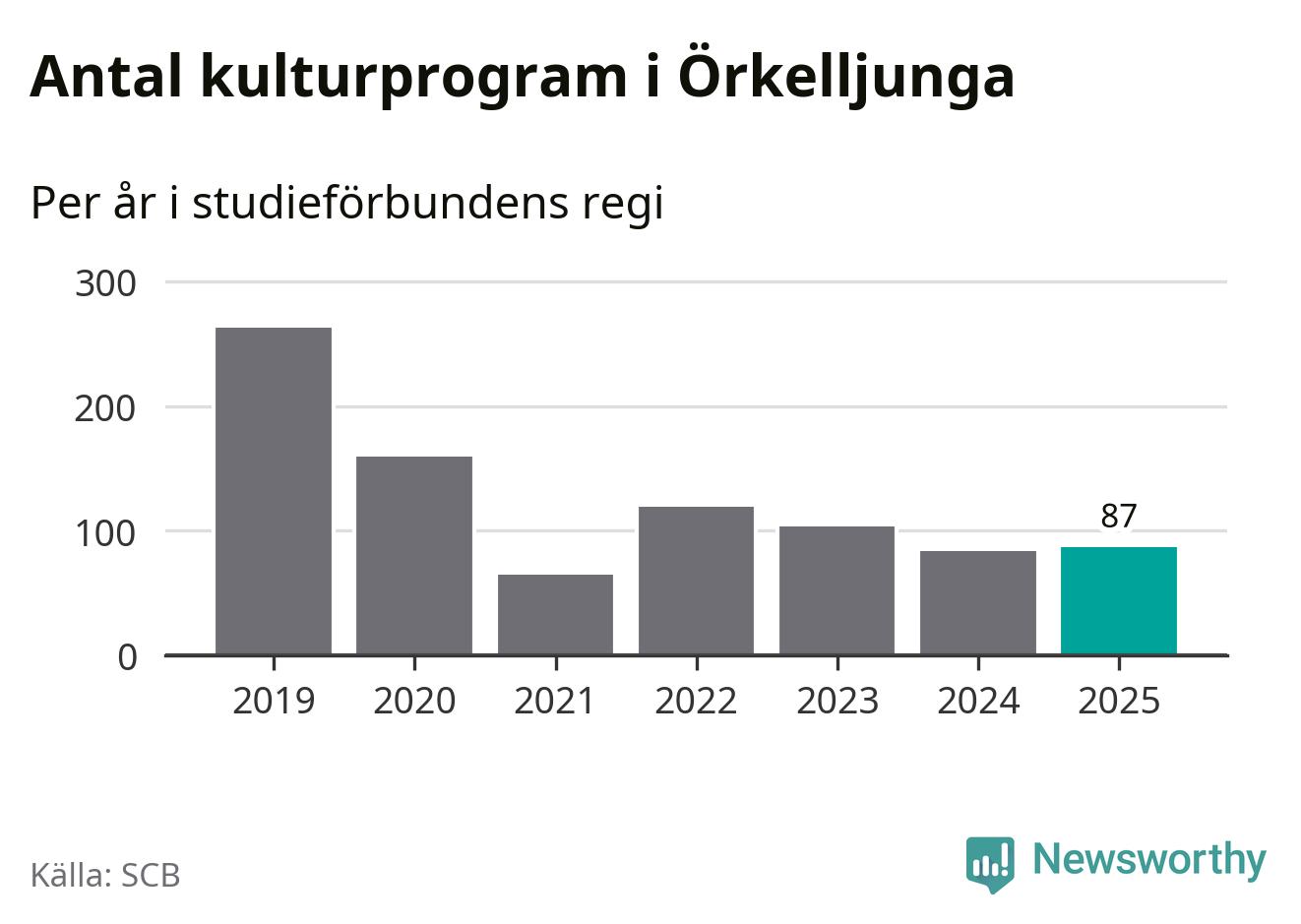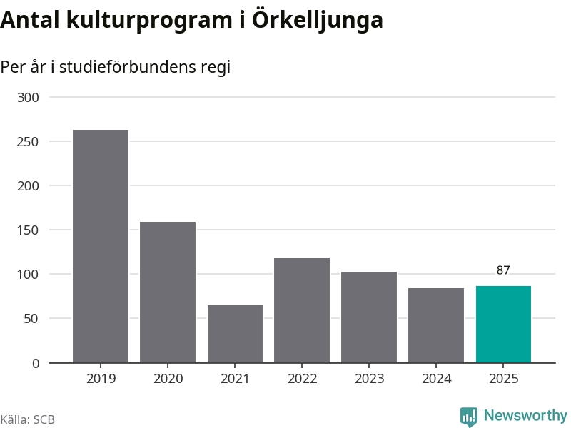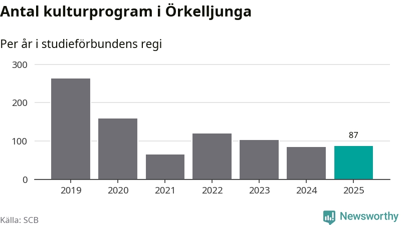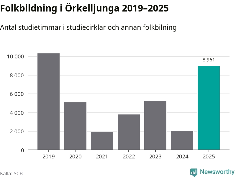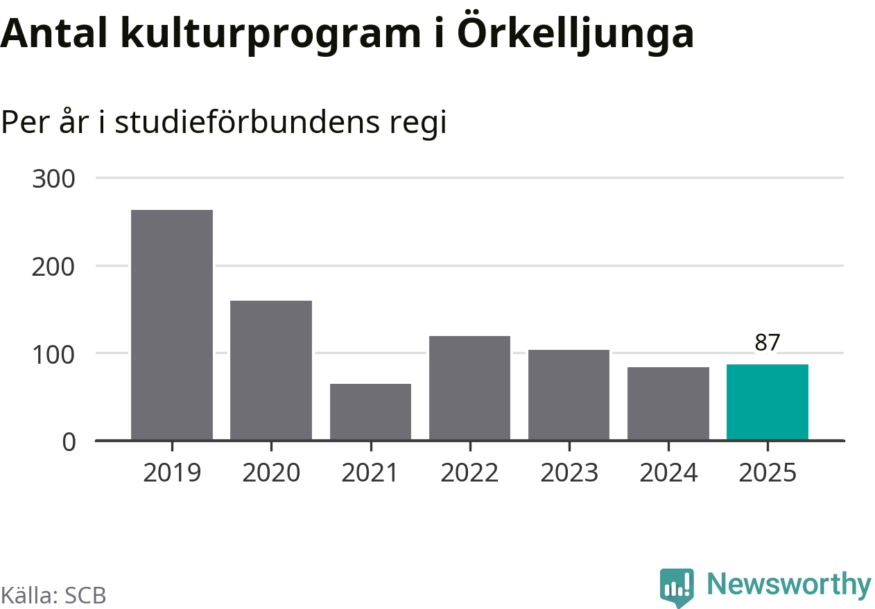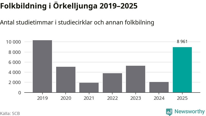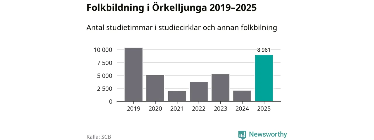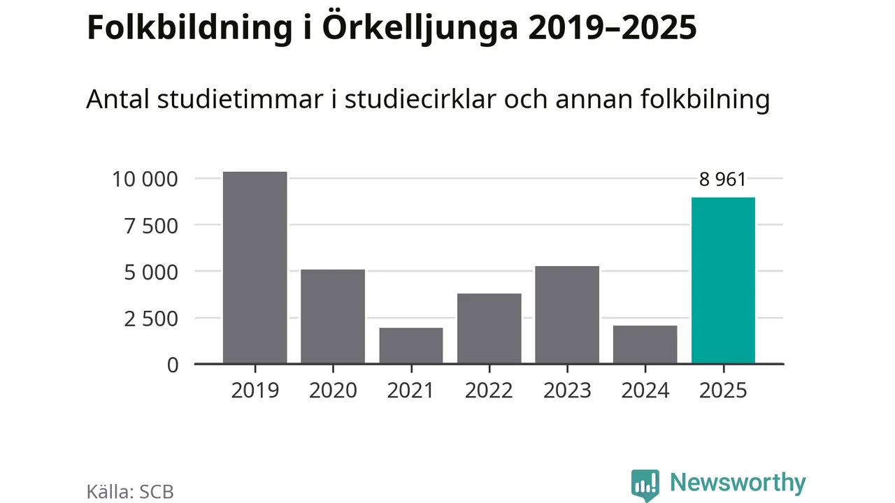 Åtta av de studieförbund som 2025 fick bidrag från Folkbildningsrådet har haft någon form av verksamhet – antingen studiecirkel, annan folkbildning eller kulturprogram – i Örkelljunga under de två senaste åren. Under 2025 ökade Sensus, Bilda och Studieförbundet Vuxenskolan antalet studietimmar i kommunen jämfört med året innan, medan Studiefrämjandet och ABF noterade färre timmar. Folkuniversitetet och Medborgarskolan har bara arrangerat kulturprogram under 2025. NBV hade ingen verksamhet i kommunen förra året.