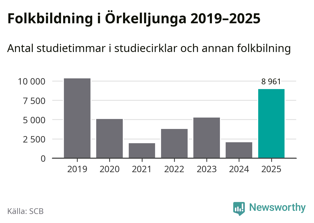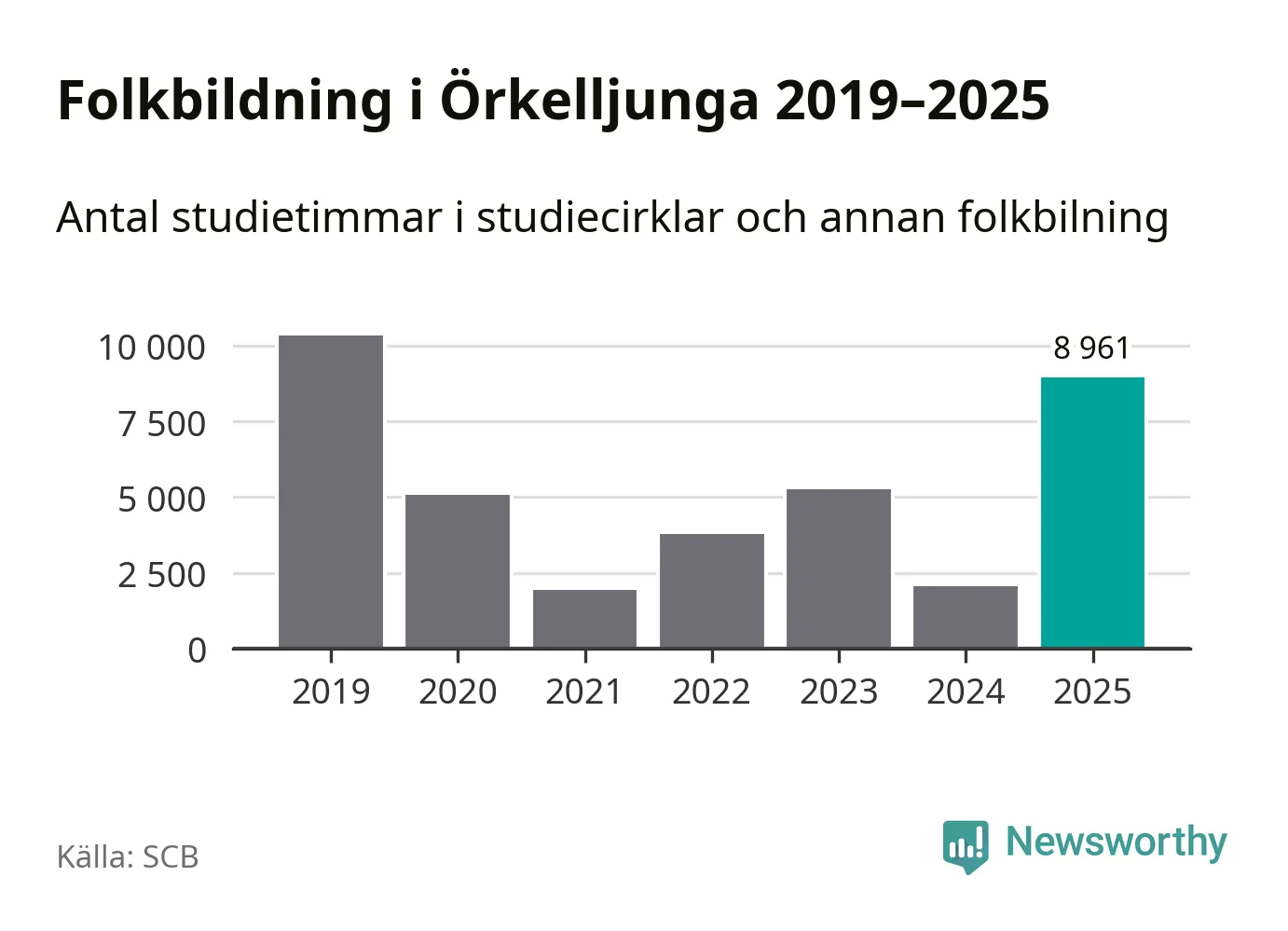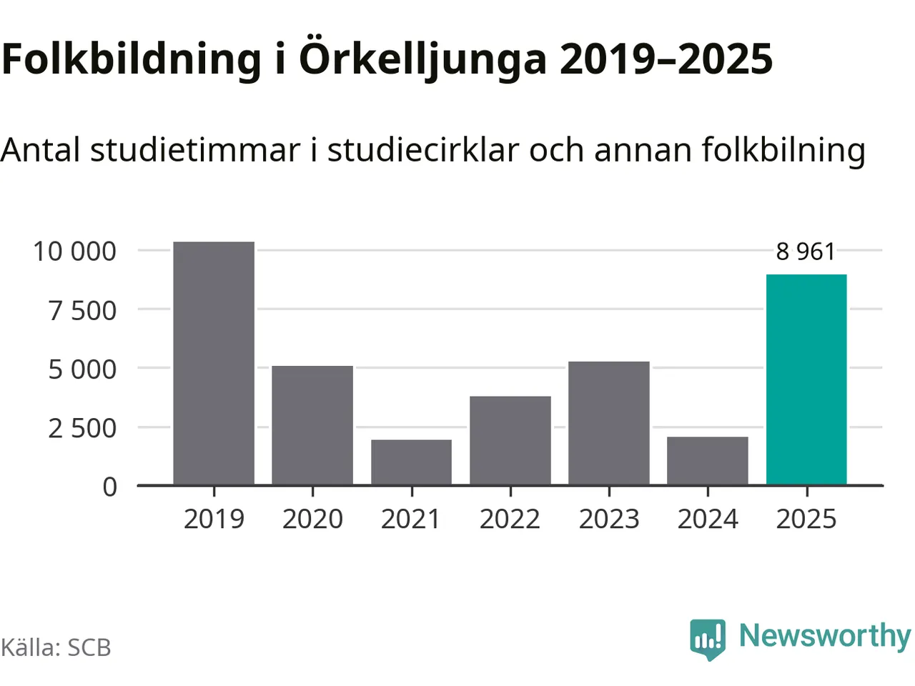 Men Örkelljunga är en av 80 kommuner i landet där antalet studietimmar faktiskt ökade under under fjolåret. Omkring 9 000 studietimmar innebär en mångdubbling jämfört med året innan. Dessutom var antalet kulturarrangemang i studieförbundens regi fler än året innan. Den kraftiga ökningen verkar främst vara kopplad till två större scoutläger som arrangerades i kommunen under året.
