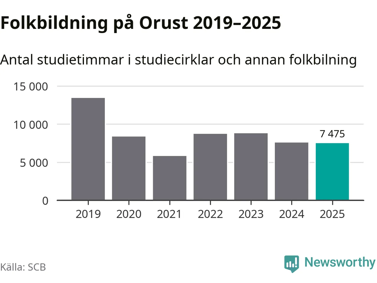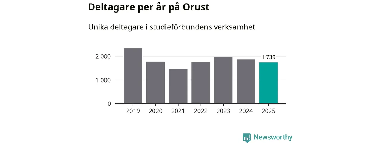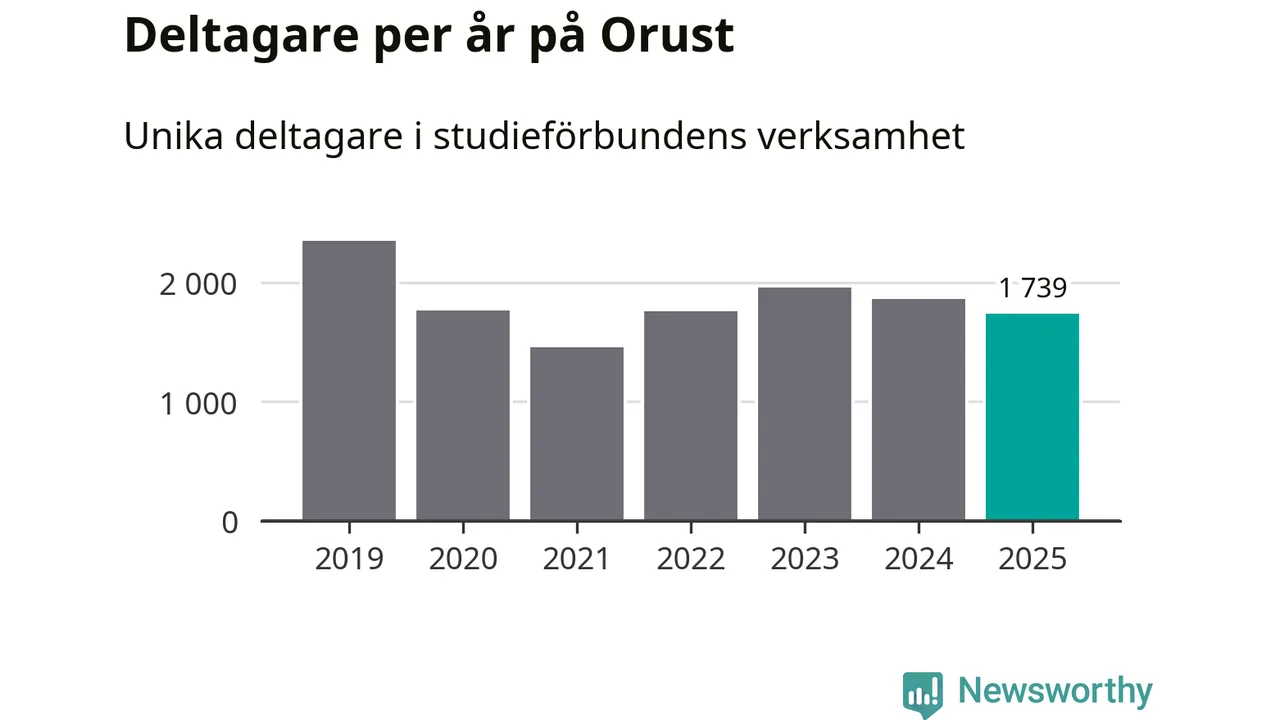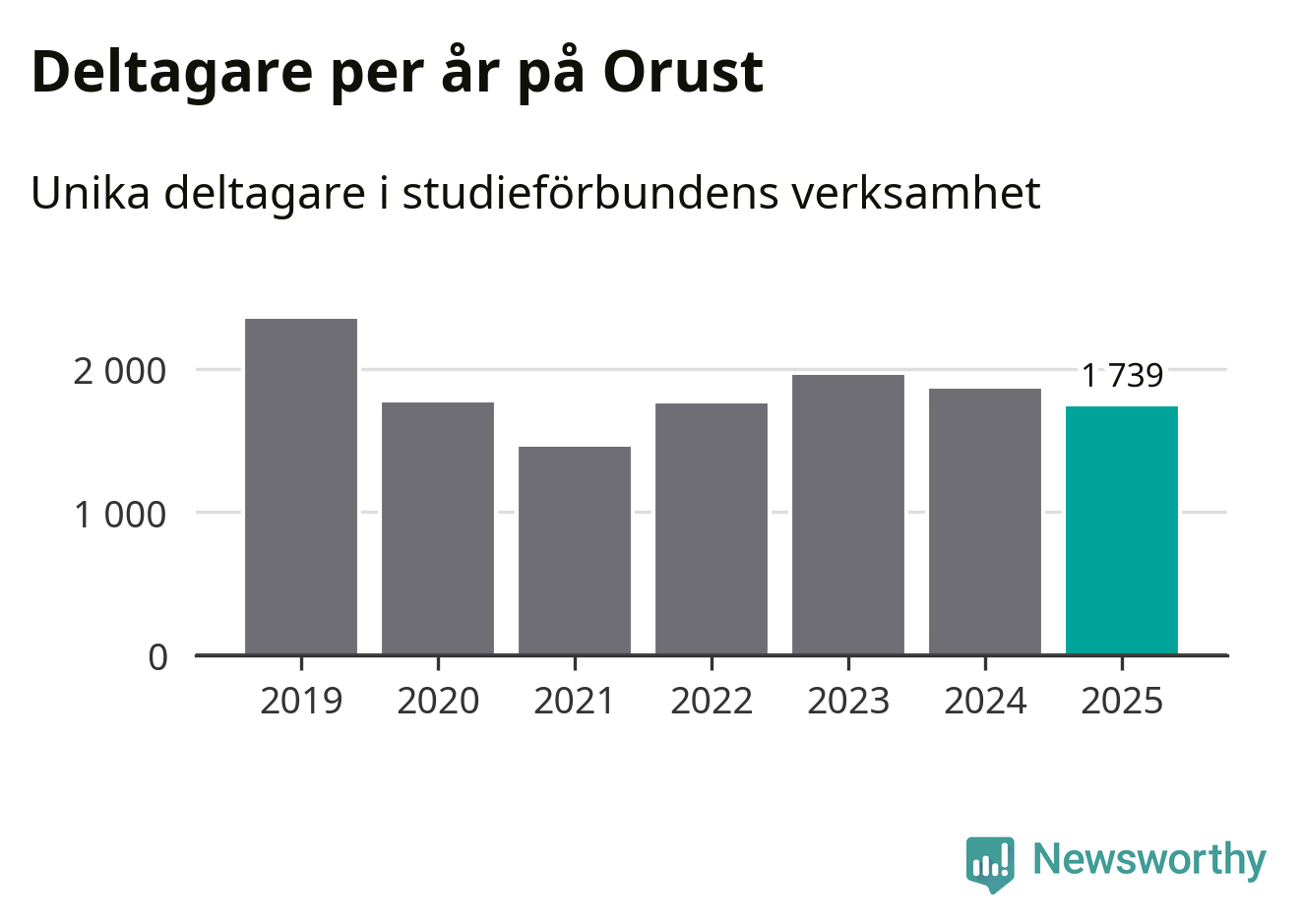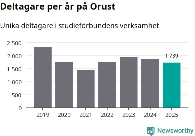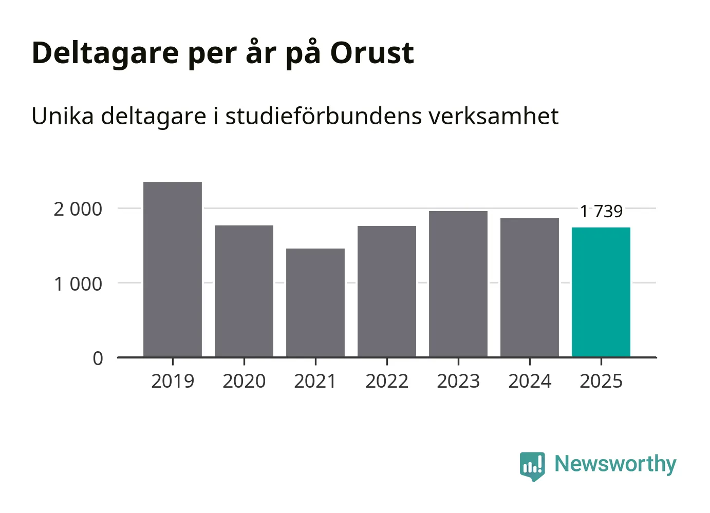 Sett till unika deltagare är folkbildningen på tillbakagång på Orust. 2025 deltog 1 739 personer i studieförbundens verksamhet, vilket är en minskning med sju procent jämfört med året innan. Det innebär att elva procent av befolkningen i kommunen deltog i studieförbundens verksamhet under 2025, vilket är högre än rikssnittet.