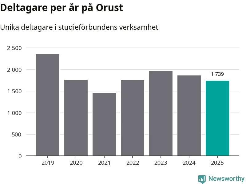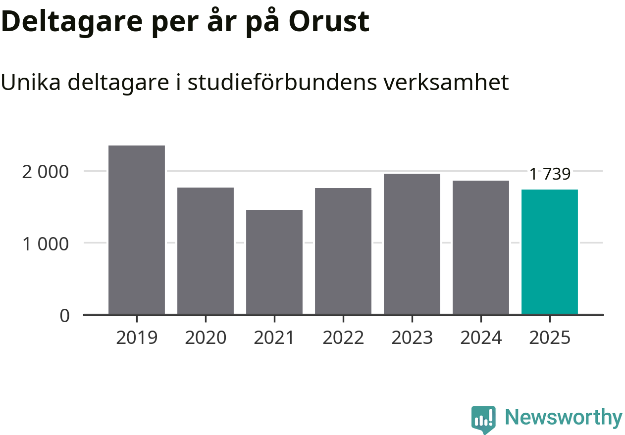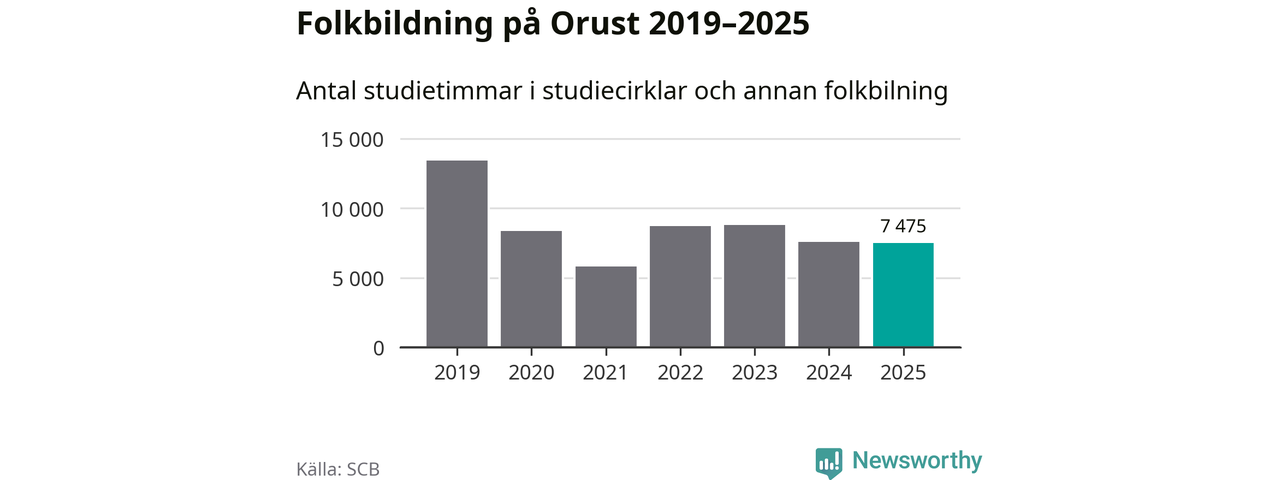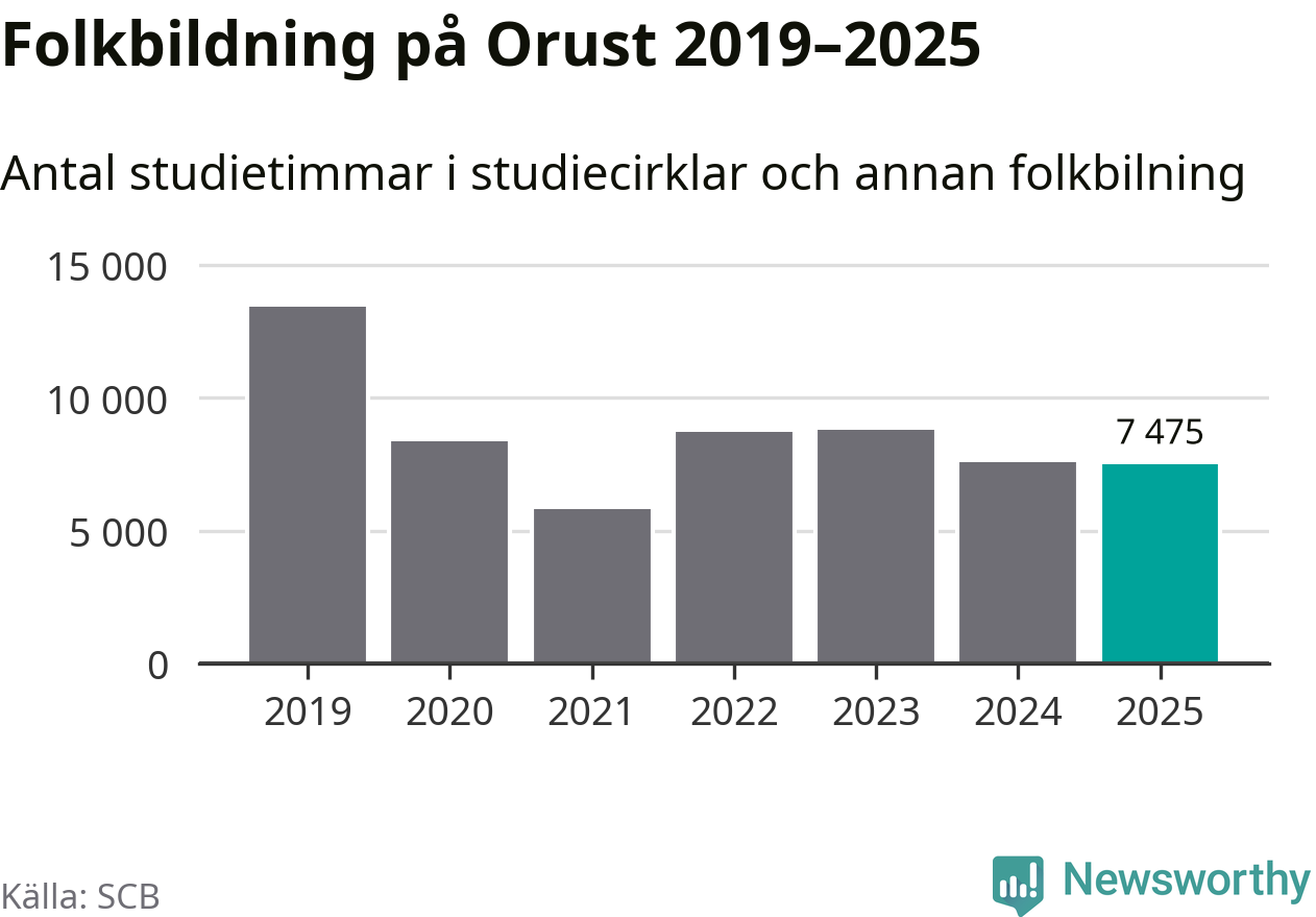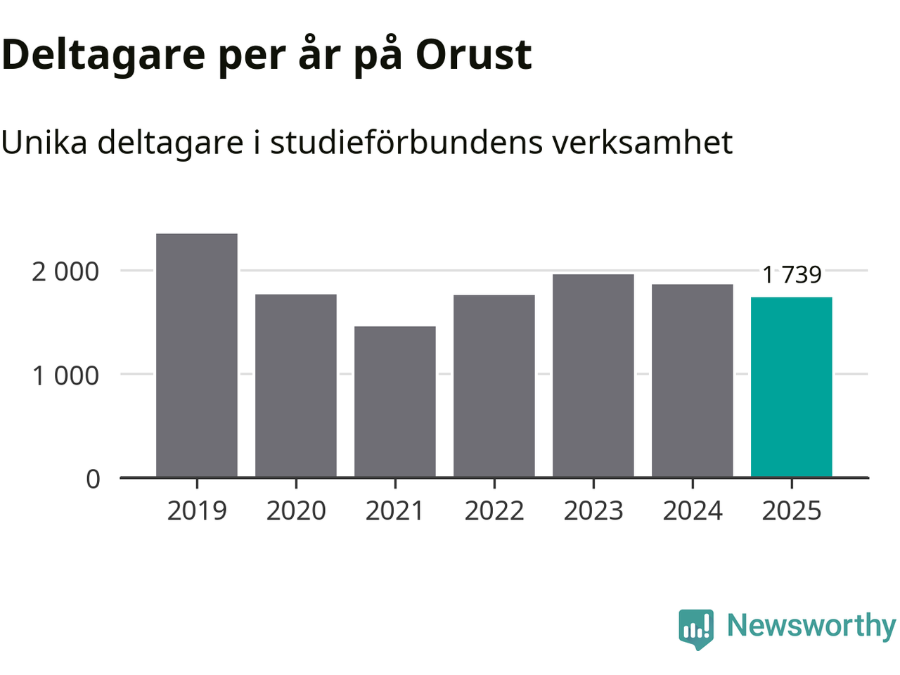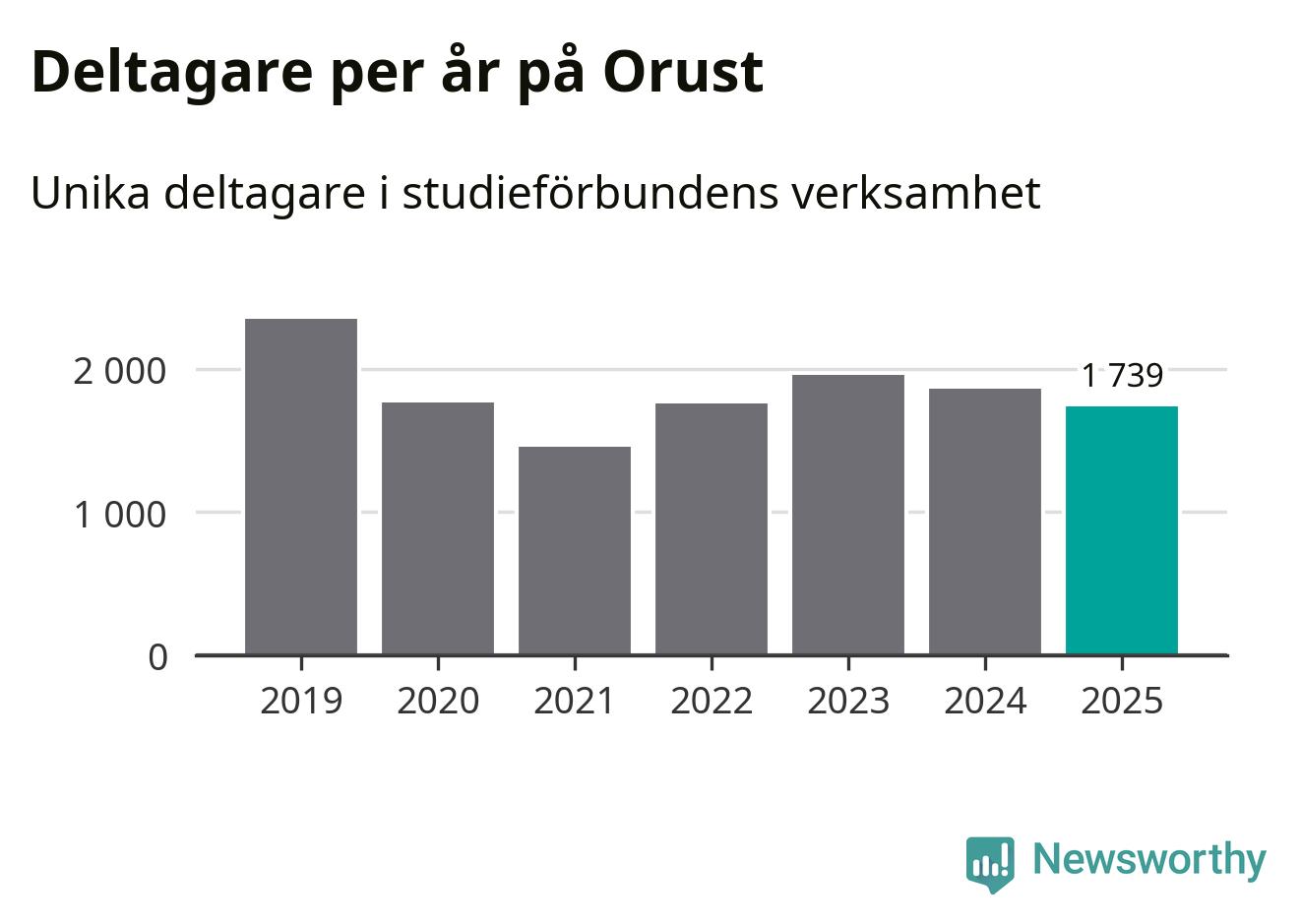 Sett till unika deltagare är folkbildningen på tillbakagång på Orust. 2025 deltog 1 739 personer i studieförbundens verksamhet, vilket är en minskning med sju procent jämfört med året innan. Det innebär att elva procent av befolkningen i kommunen deltog i studieförbundens verksamhet under 2025, vilket är högre än rikssnittet.