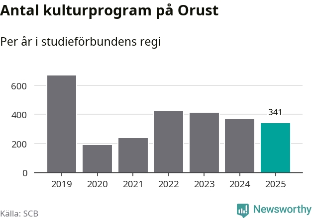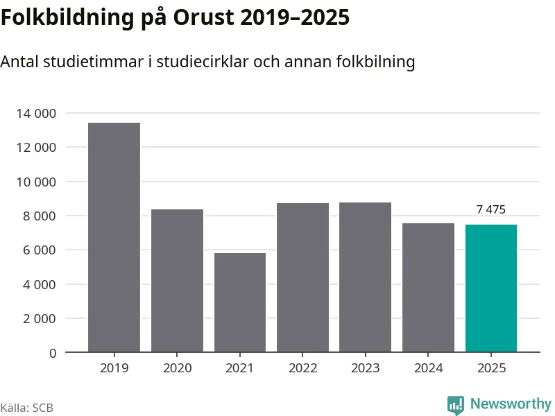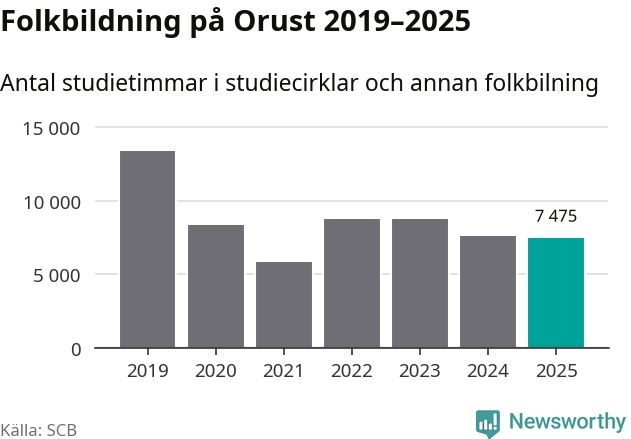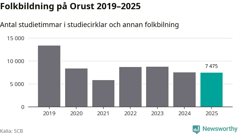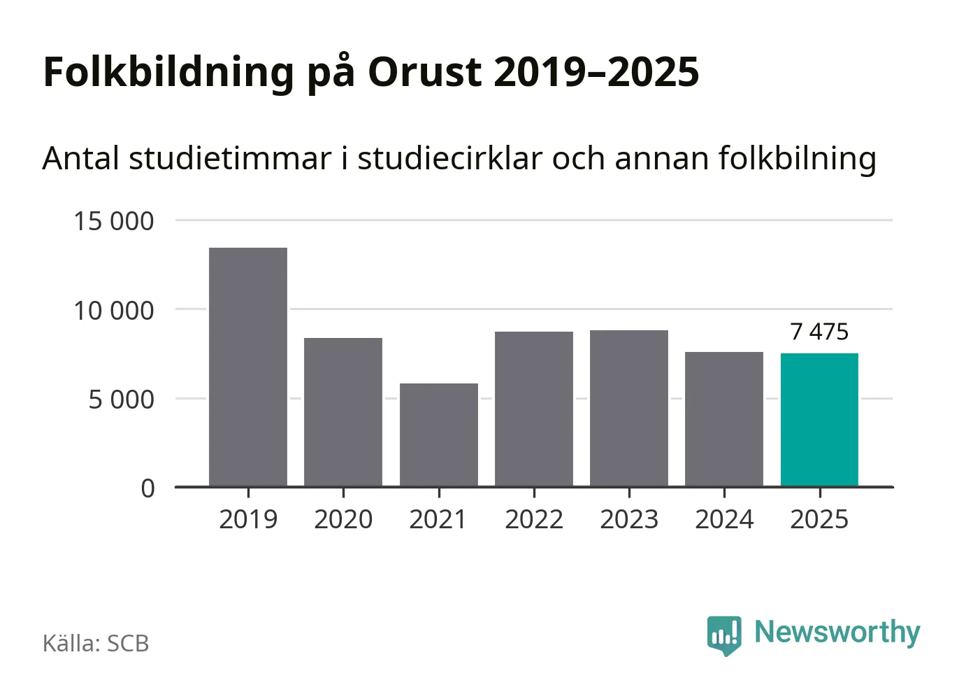 Studieförbunden drabbades hårt av pandemin. Även på Orust noterades det lägsta antalet studietimmar under 2021, som då var 57 procent färre än 2019. År 2024 var antalet studietimmar åter högre men de var fortfarande långt från förpandeminivåerna.