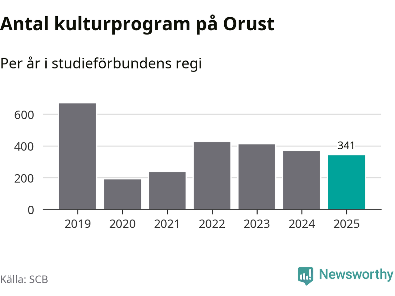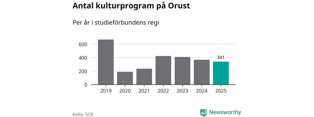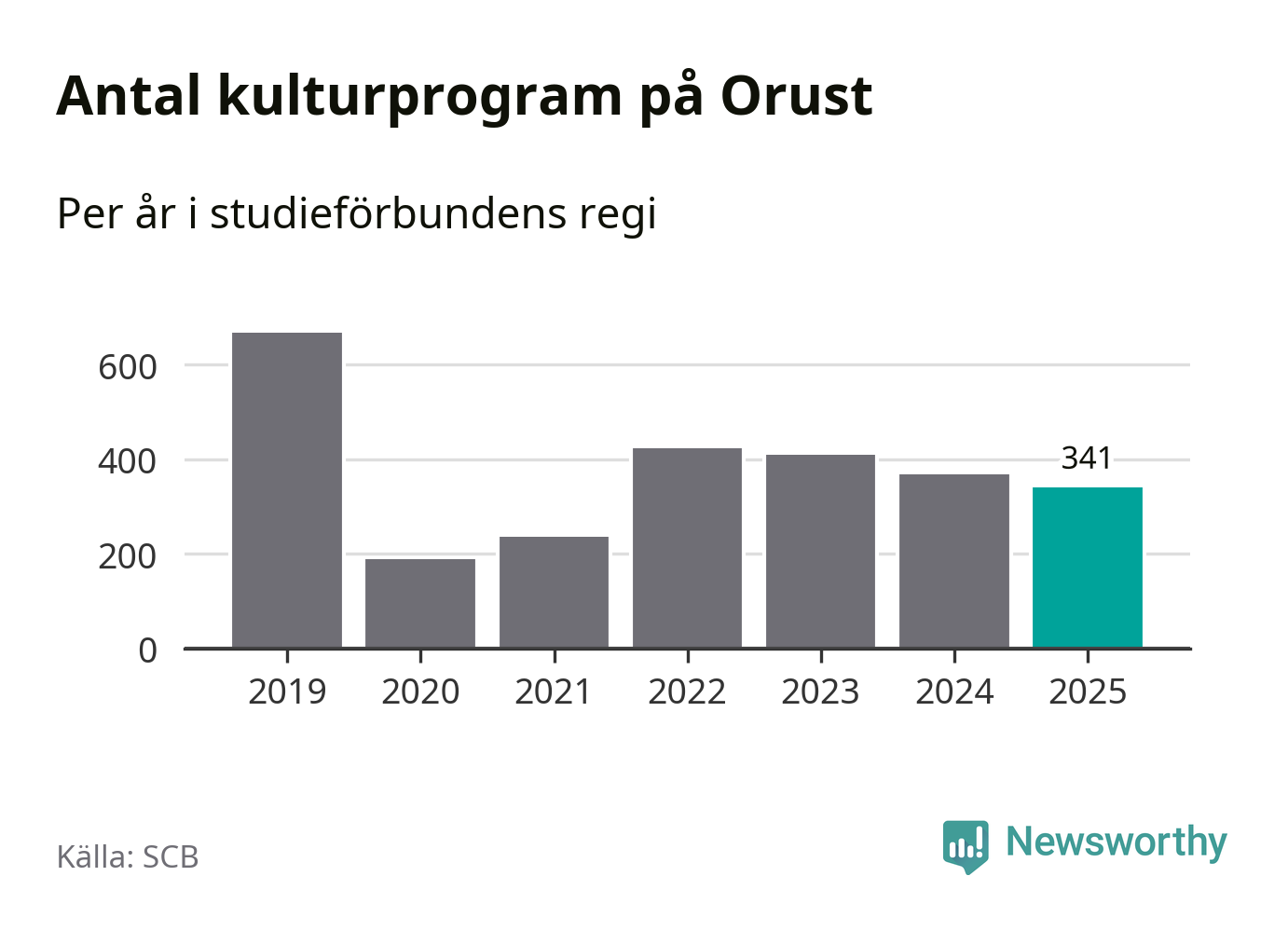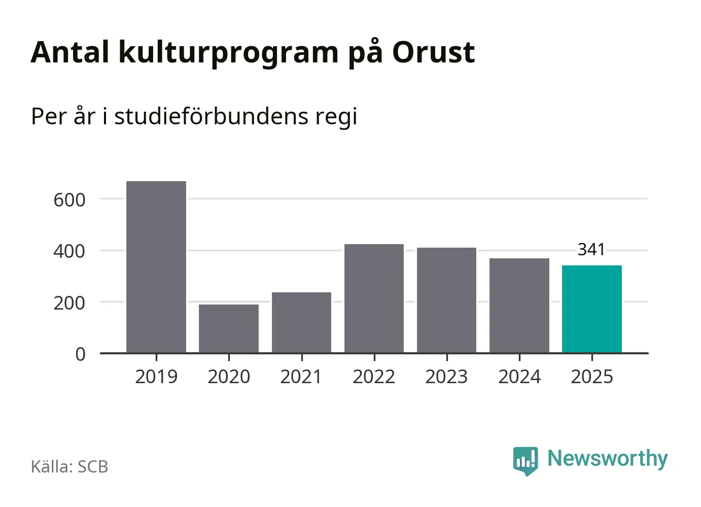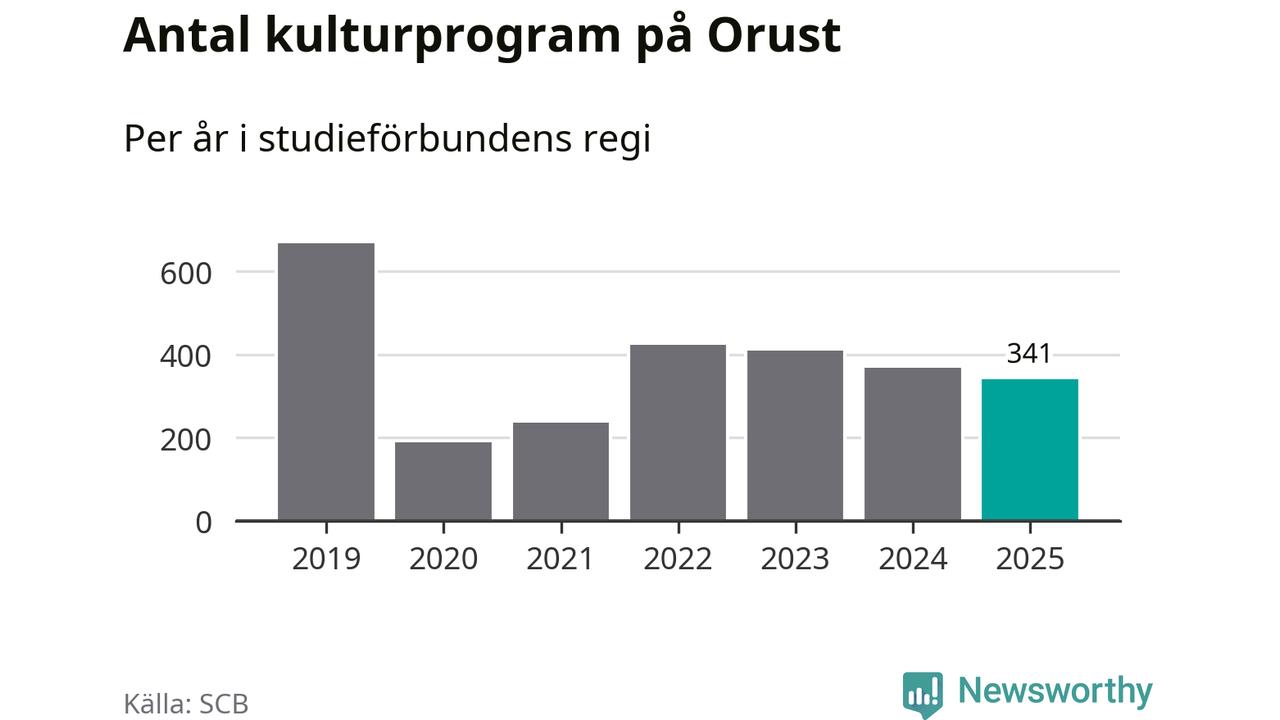 Sju av de studieförbund som 2025 fick bidrag från Folkbildningsrådet har haft någon form av verksamhet – antingen studiecirkel, annan folkbildning eller kulturprogram – på Orust under de två senaste åren. Under 2025 ökade Medborgarskolan och ABF antalet studietimmar i kommunen jämfört med året innan, medan Studieförbundet Vuxenskolan noterade färre timmar. Folkuniversitetet och NBV har bara arrangerat kulturprogram under 2025.