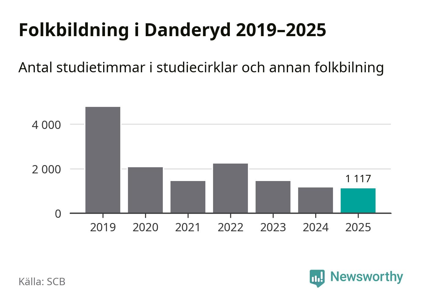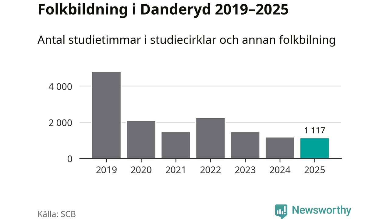 Sju av de studieförbund som 2025 fick bidrag från Folkbildningsrådet har haft någon form av verksamhet – antingen studiecirkel, annan folkbildning eller kulturprogram – i Danderyd under de två senaste åren. Under 2025 ökade Studieförbundet Vuxenskolan, Bilda och Folkuniversitetet antalet studietimmar i kommunen jämfört med året innan, medan de fyra andra förbunden i kommunen noterade färre timmar. Studiefrämjandet hade ingen verksamhet i kommunen förra året.