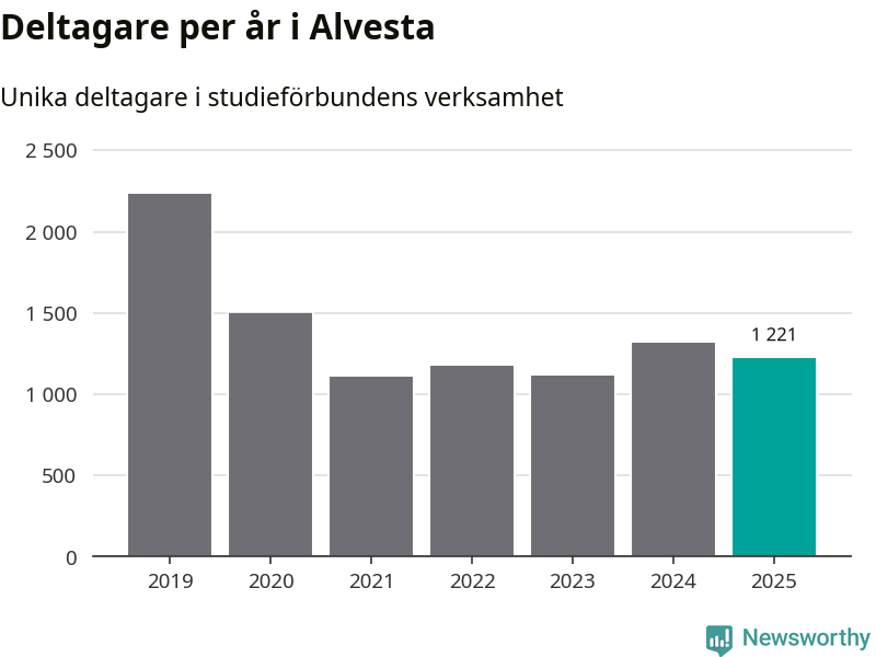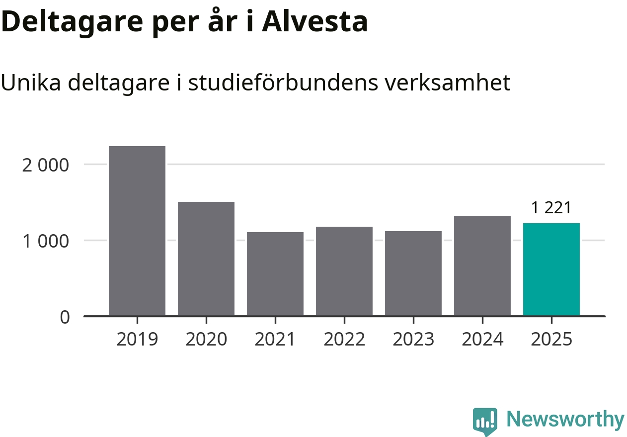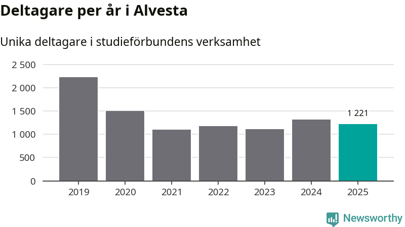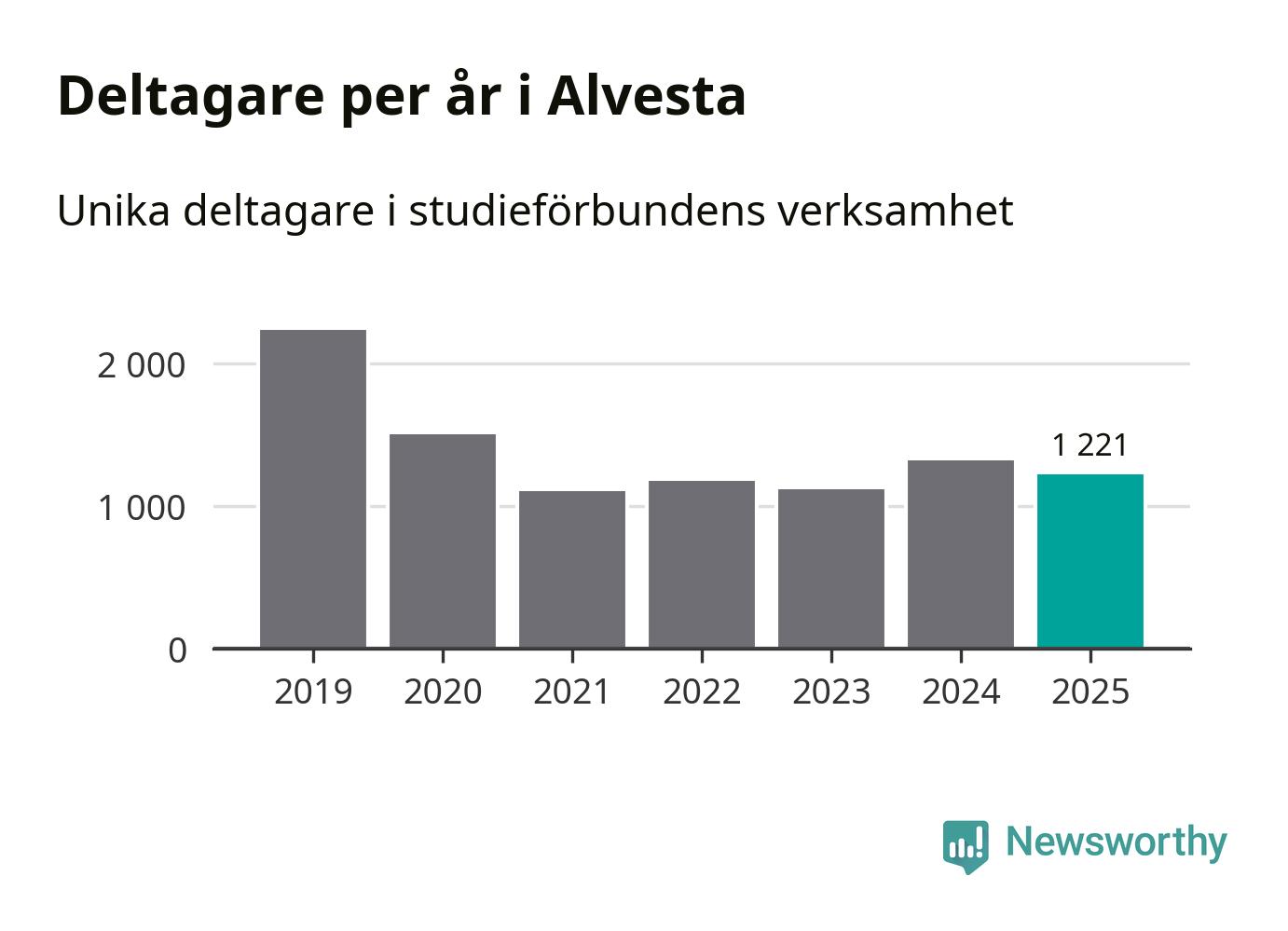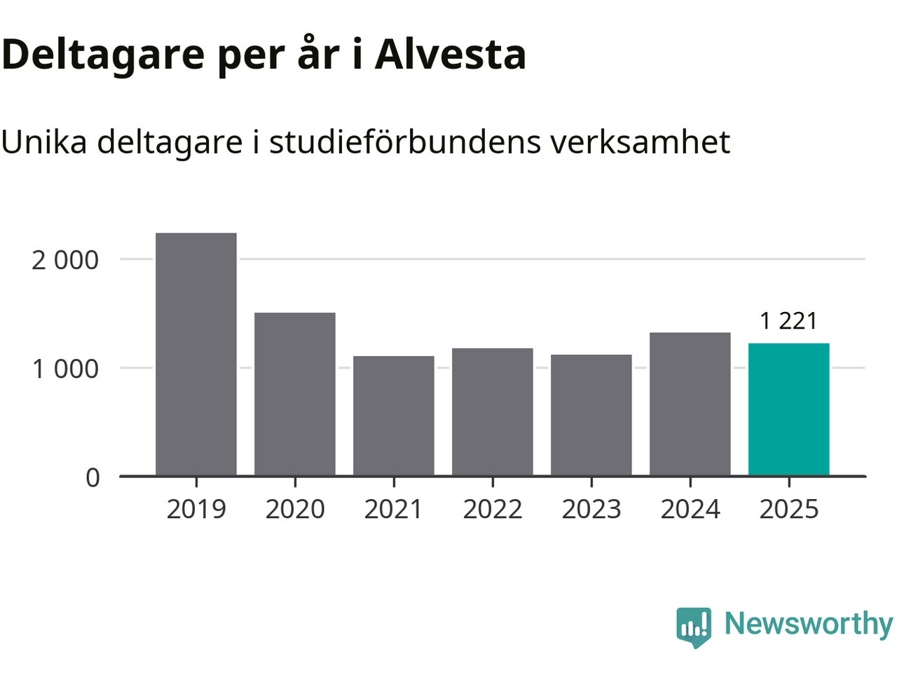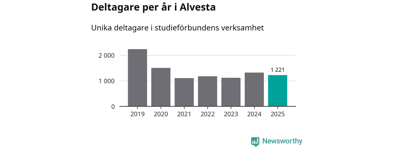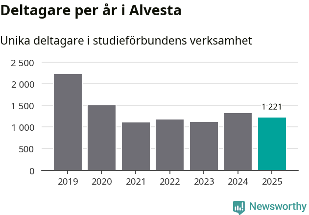 Även sett till unika deltagare är folkbildningen på tillbakagång i Alvesta. 2025 deltog 1 221 personer i studieförbundens verksamhet, vilket är en minskning med sju procent jämfört med året innan. Det innebär att sex procent av befolkningen i kommunen deltog i studieförbundens verksamhet under 2025, vilket är ungefär som rikssnittet.