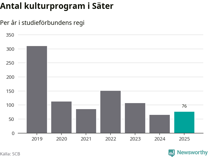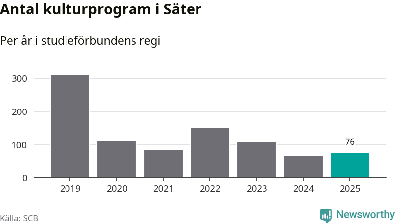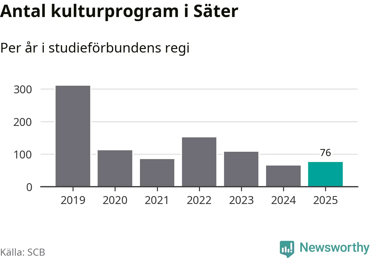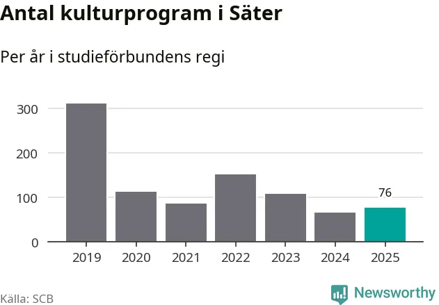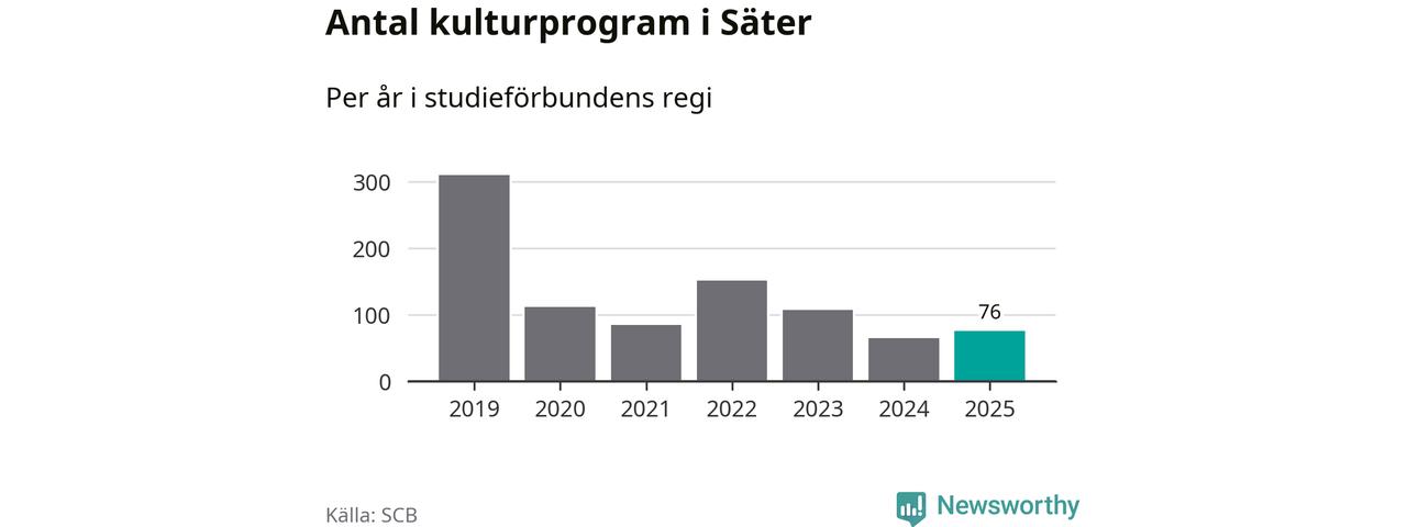 Utvecklingen ser ungefär likadan ut i Säter, förra året hade studieförbunden omkring 2 600 studietimmar i kommunen jämfört med omkring 2 700 året innan, en minskning med fem procent. Men medan studiecirklar och annan folkbildningsverksamhet minskade ökade faktiskt antalet kulturarrangemang i studieförbundens regi från 65 till 76.