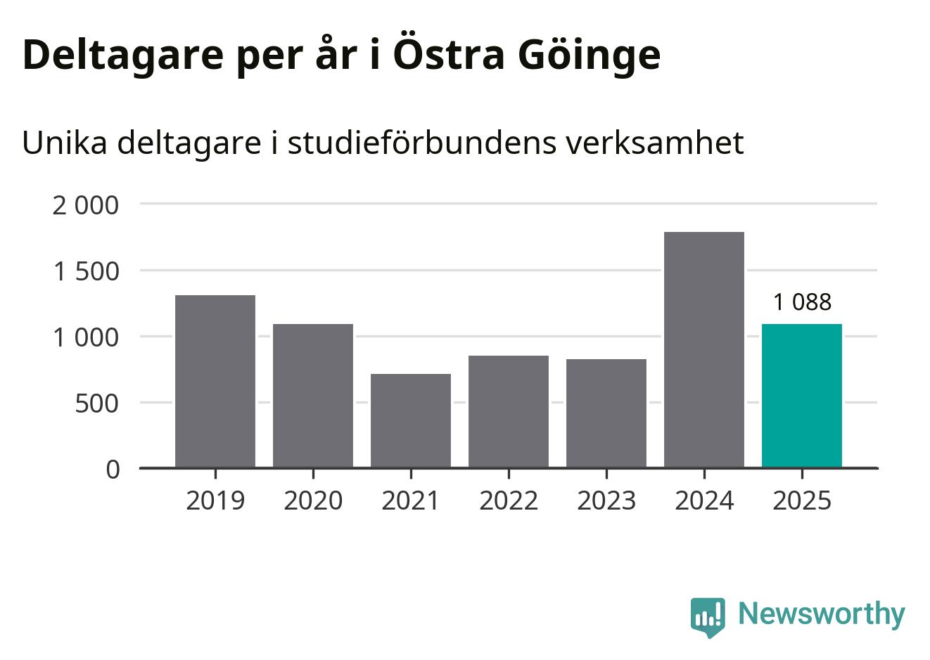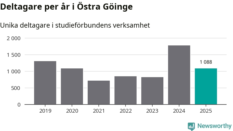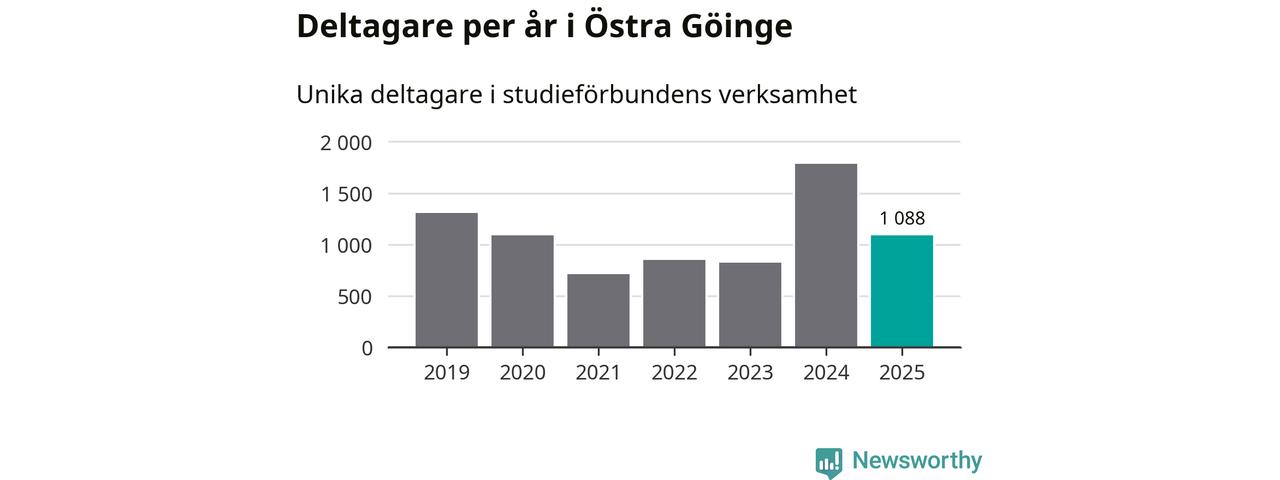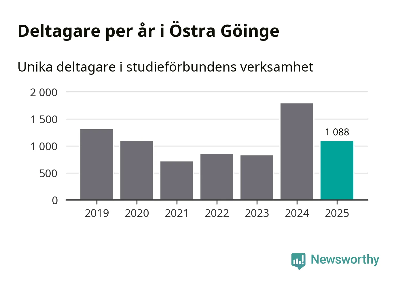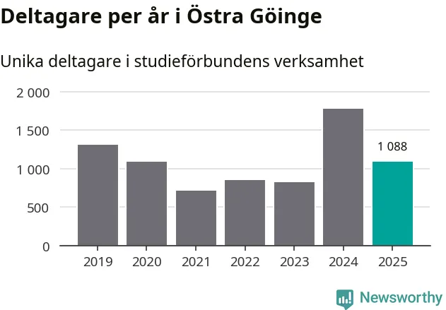 Även sett till unika deltagare är folkbildningen på tillbakagång i Östra Göinge. 2025 deltog 1 088 personer i studieförbundens verksamhet, vilket är en minskning med 39 procent jämfört med året innan. Det innebär att åtta procent av befolkningen i kommunen deltog i studieförbundens verksamhet under 2025, vilket är högre än rikssnittet.