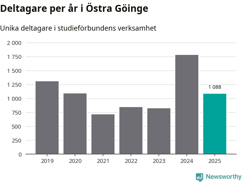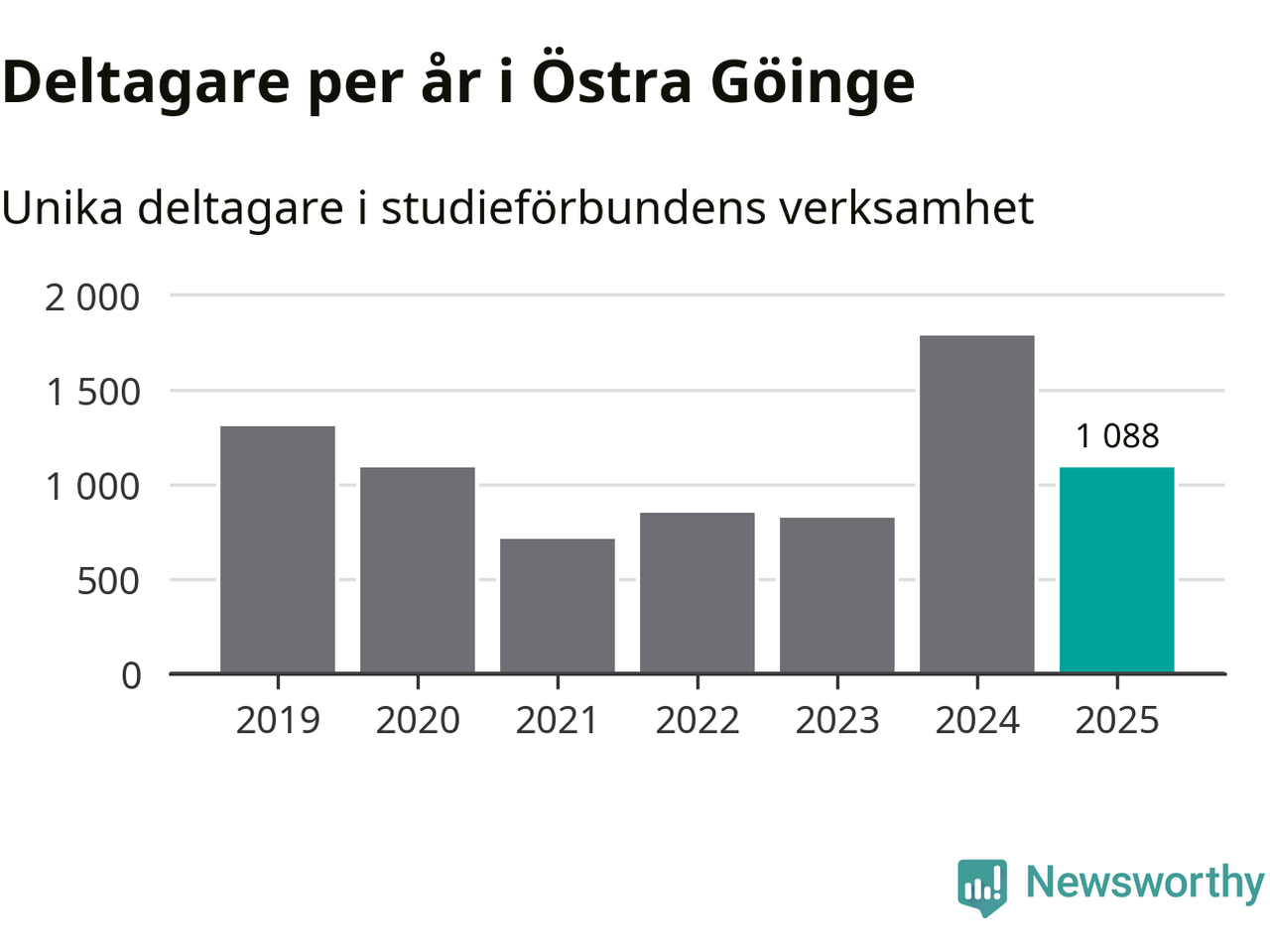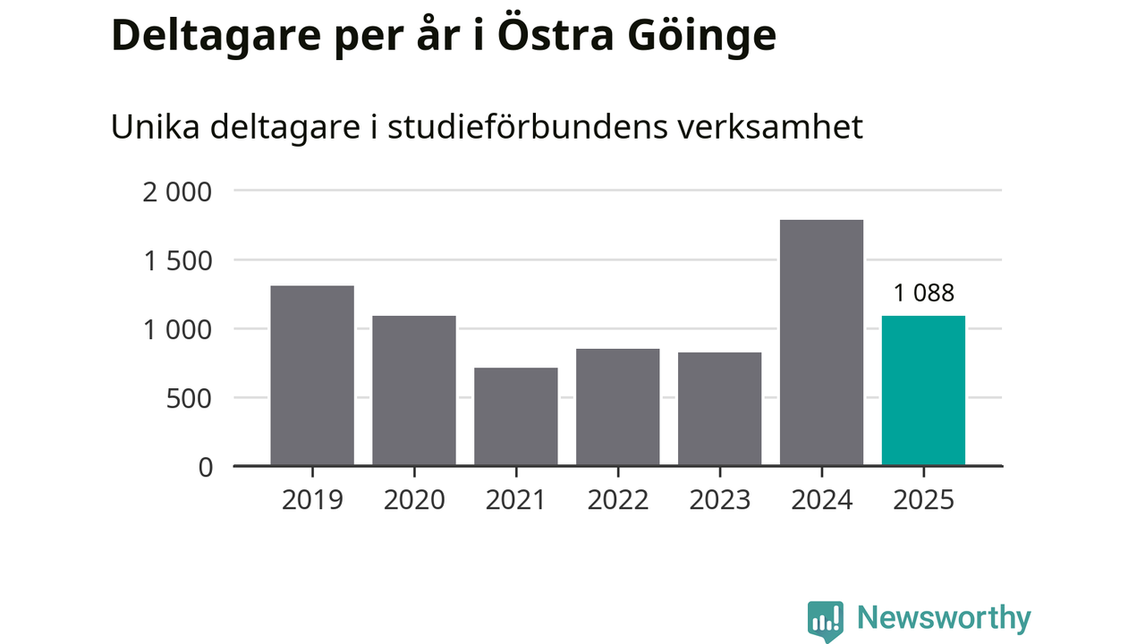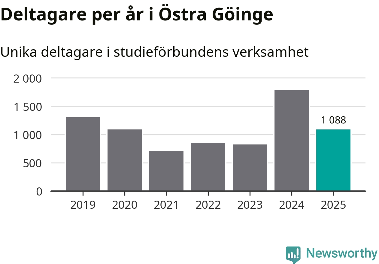 Även sett till unika deltagare är folkbildningen på tillbakagång i Östra Göinge. 2025 deltog 1 088 personer i studieförbundens verksamhet, vilket är en minskning med 39 procent jämfört med året innan. Det innebär att åtta procent av befolkningen i kommunen deltog i studieförbundens verksamhet under 2025, vilket är högre än rikssnittet.
