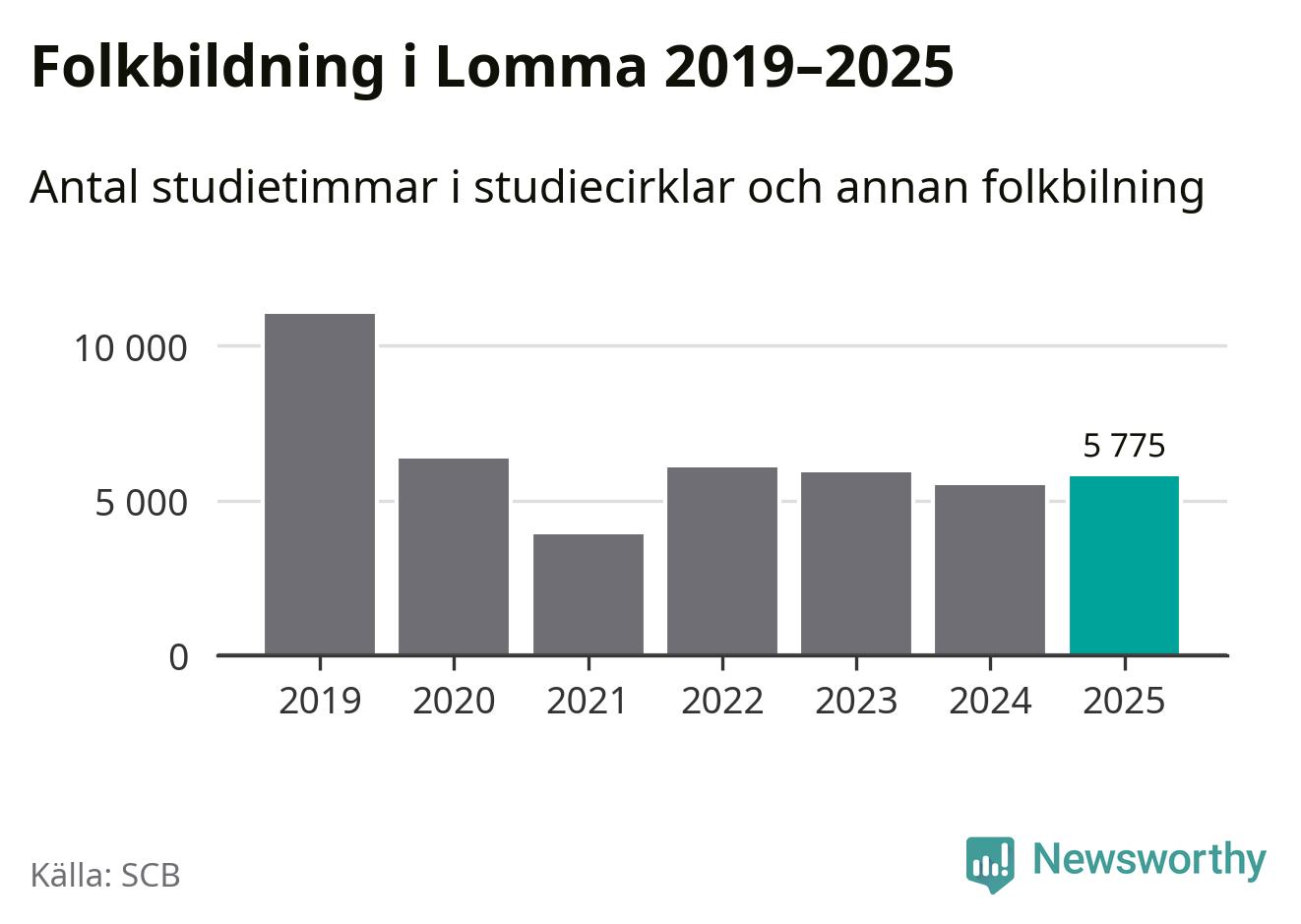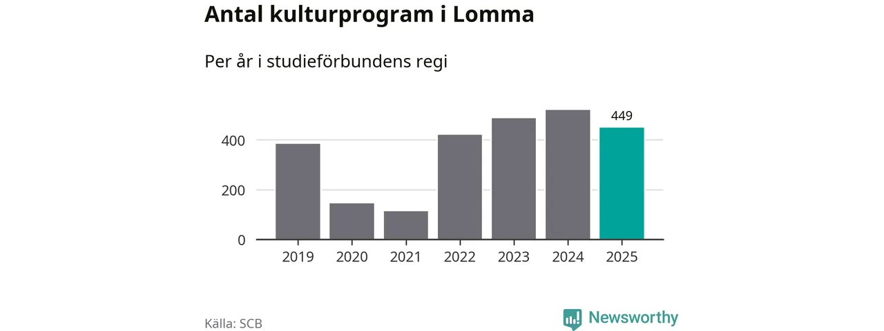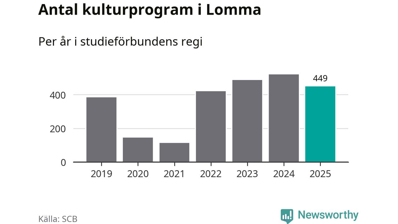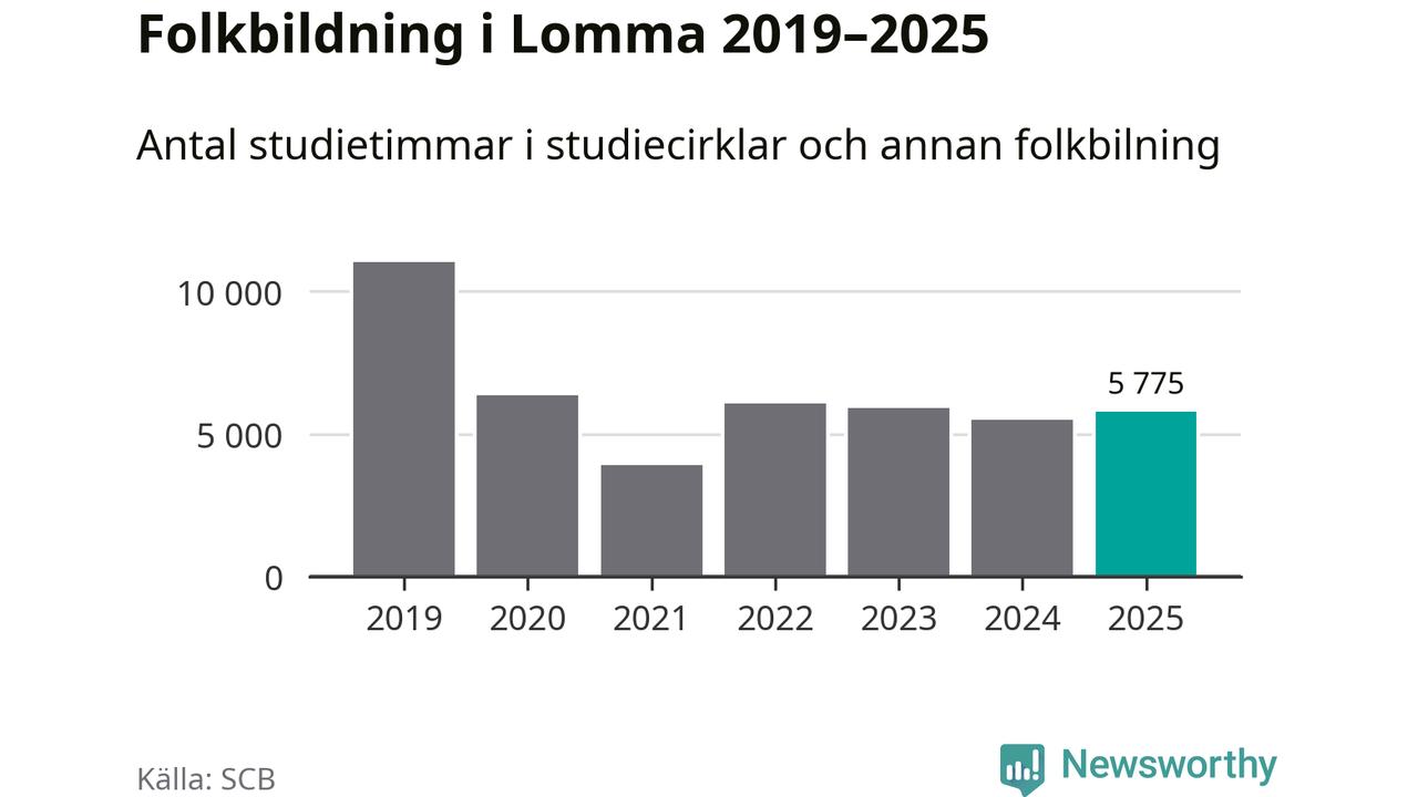 Åtta av de studieförbund som 2025 fick bidrag från Folkbildningsrådet har haft någon form av verksamhet – antingen studiecirkel, annan folkbildning eller kulturprogram – i Lomma under de två senaste åren. Under 2025 ökade fem förbund antalet studietimmar i kommunen jämfört med året innan, medan Sensus och Studiefrämjandet noterade färre timmar.
