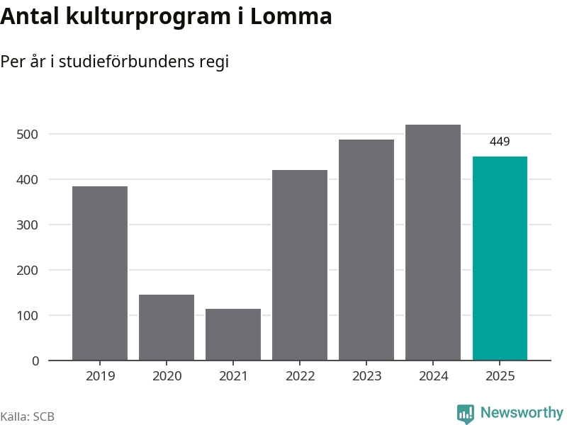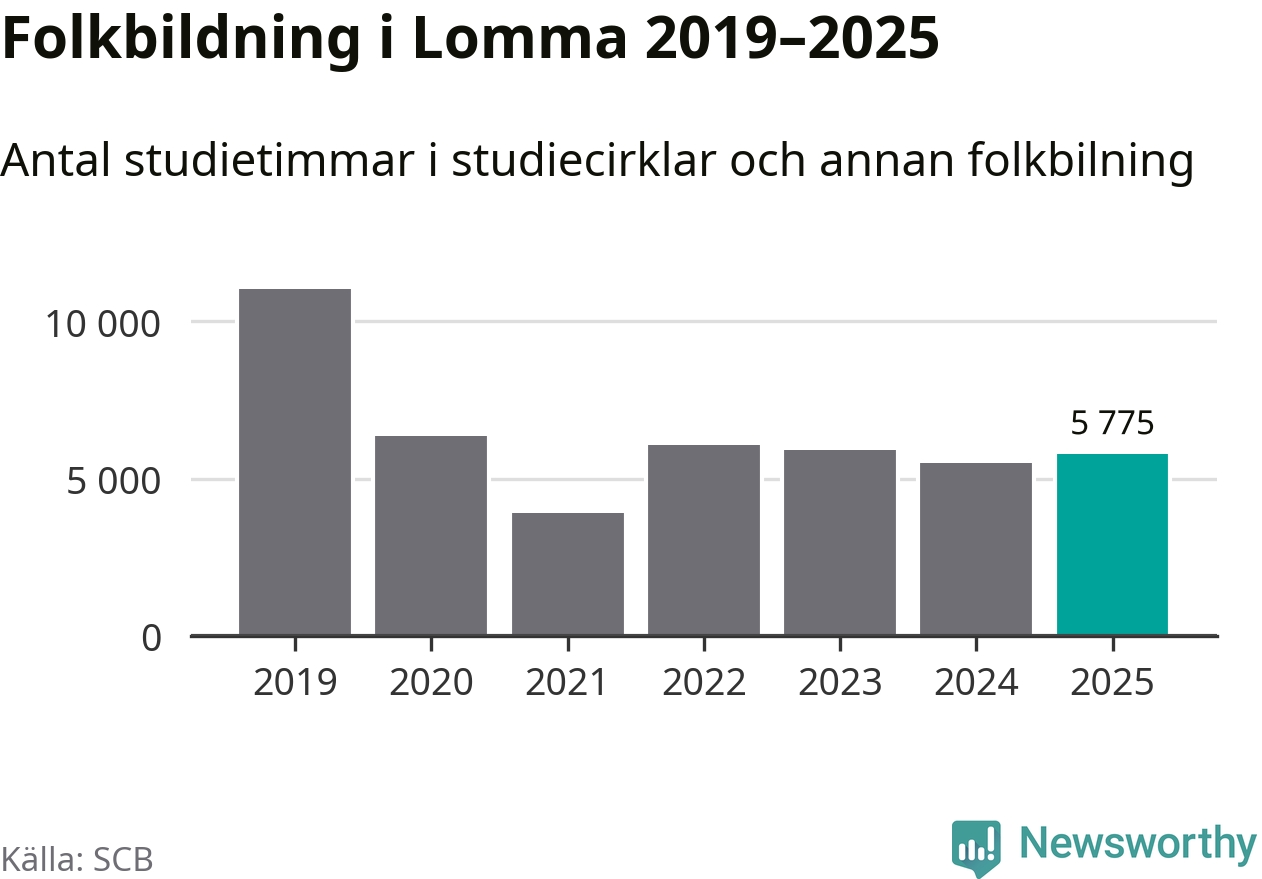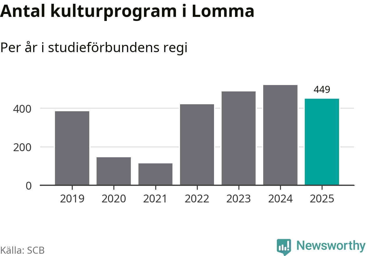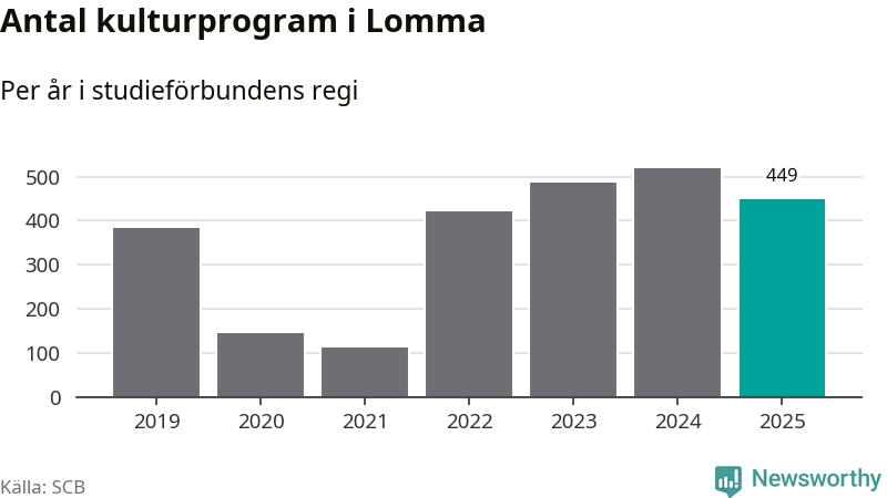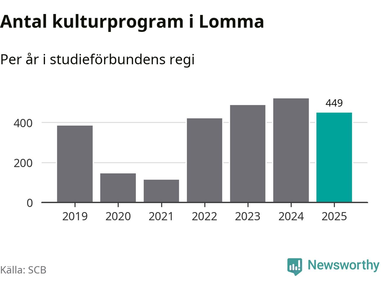 Åtta av de studieförbund som 2025 fick bidrag från Folkbildningsrådet har haft någon form av verksamhet – antingen studiecirkel, annan folkbildning eller kulturprogram – i Lomma under de två senaste åren. Under 2025 ökade fem förbund antalet studietimmar i kommunen jämfört med året innan, medan Sensus och Studiefrämjandet noterade färre timmar.