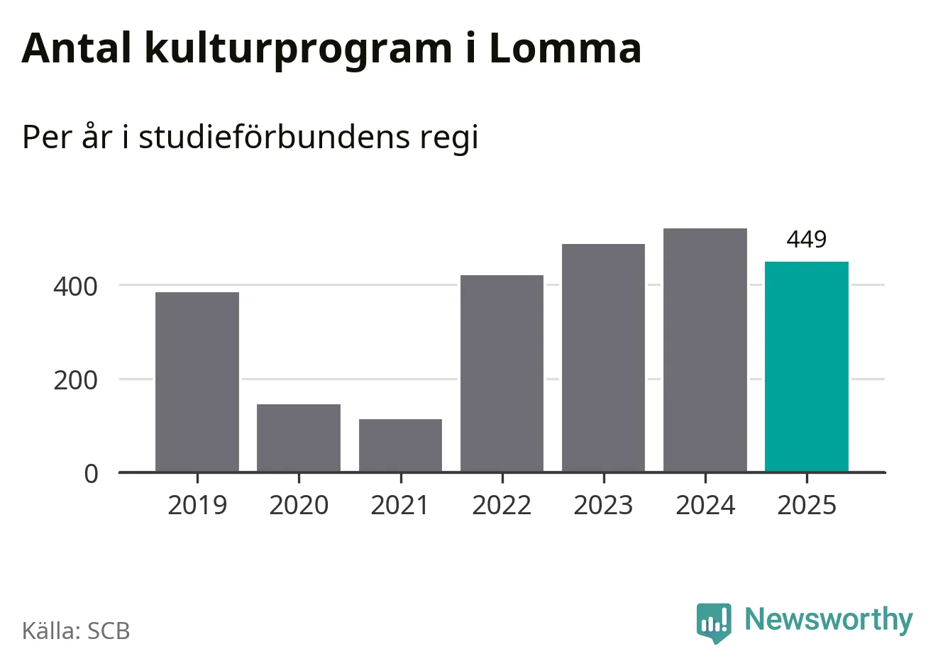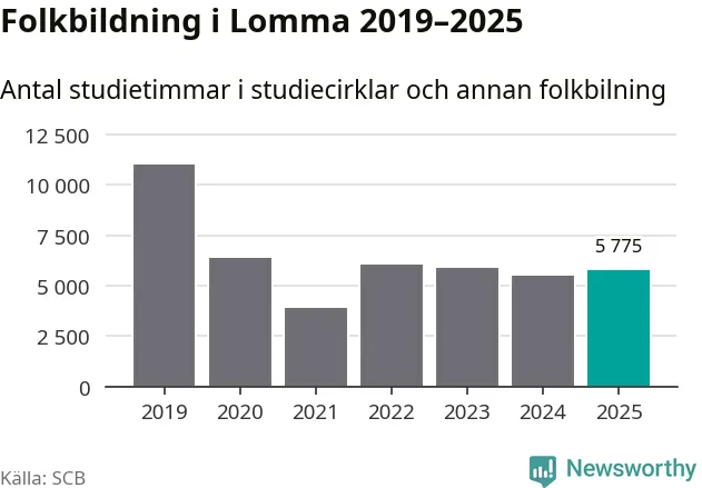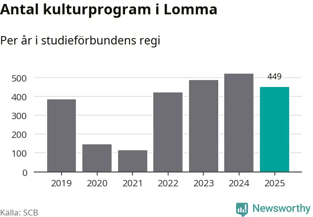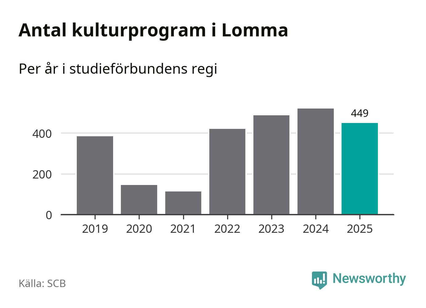 Men Lomma är en av 80 kommuner i landet där antalet studietimmar faktiskt ökade under under fjolåret. Omkring 5 800 studietimmar innebär en ökning med 5 procent jämfört med året innan. Däremot minskade antalet kulturarrangemang i studieförbundens regi i kommunen jämfört med året innan.