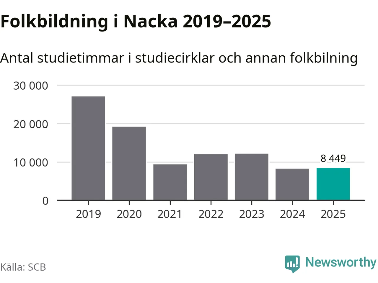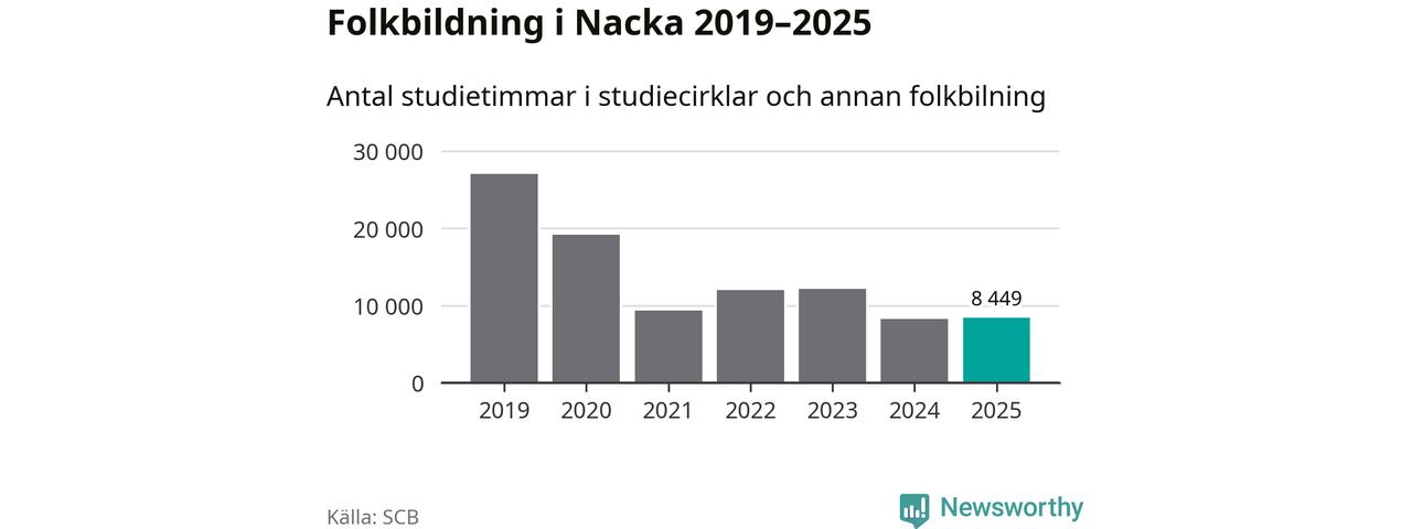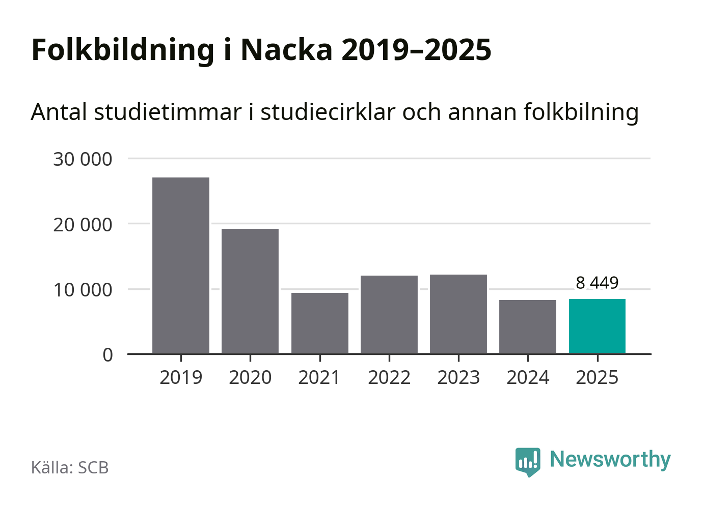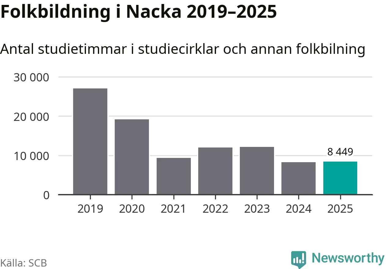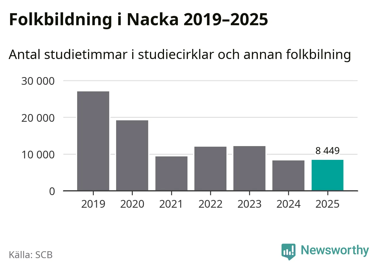 Studieförbunden drabbades hårt av pandemin. Även i Nacka noterades det lägsta antalet studietimmar under 2021, som då var 65 procent färre än 2019 – vilket fortfarande är fler än 2025.