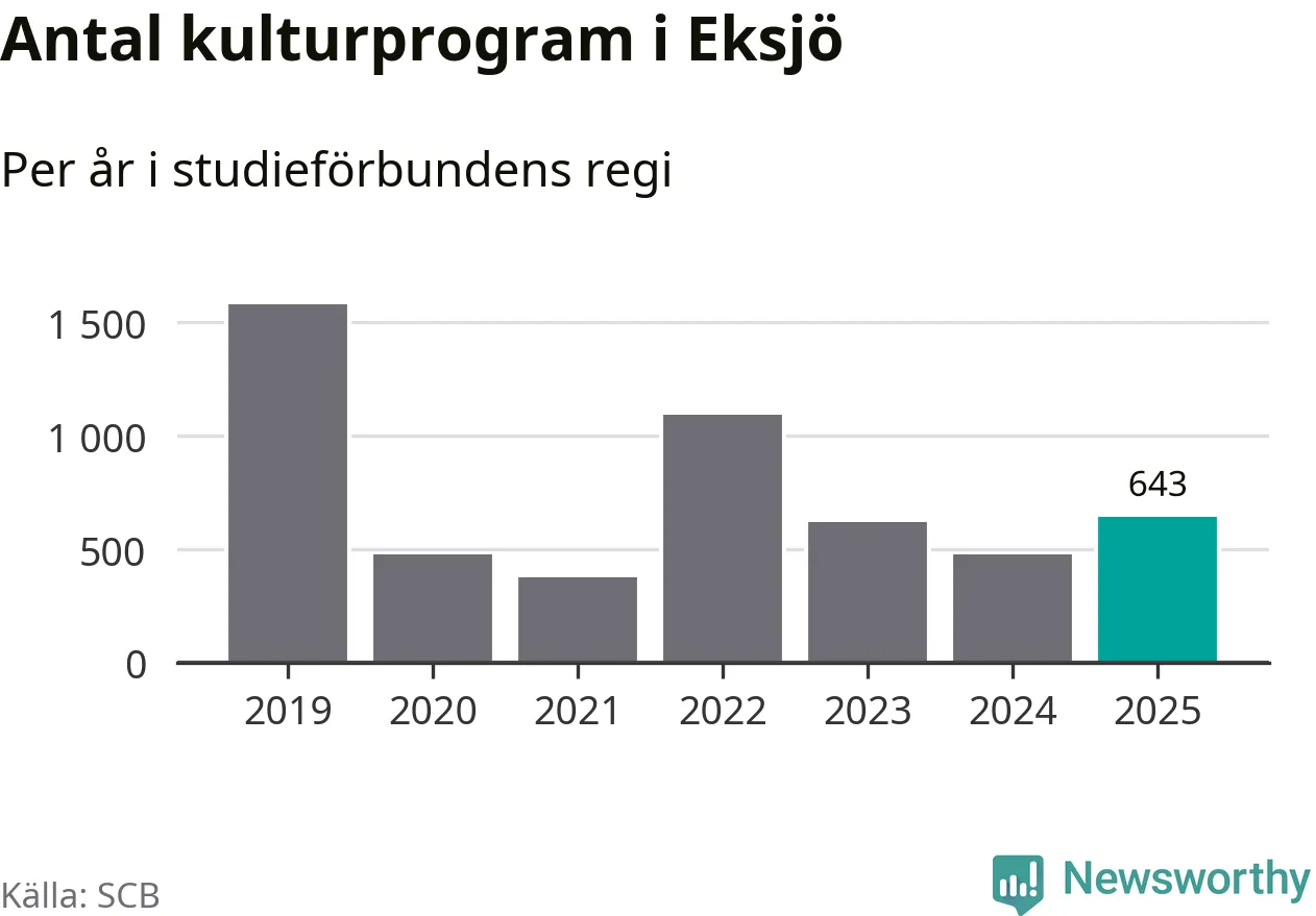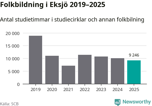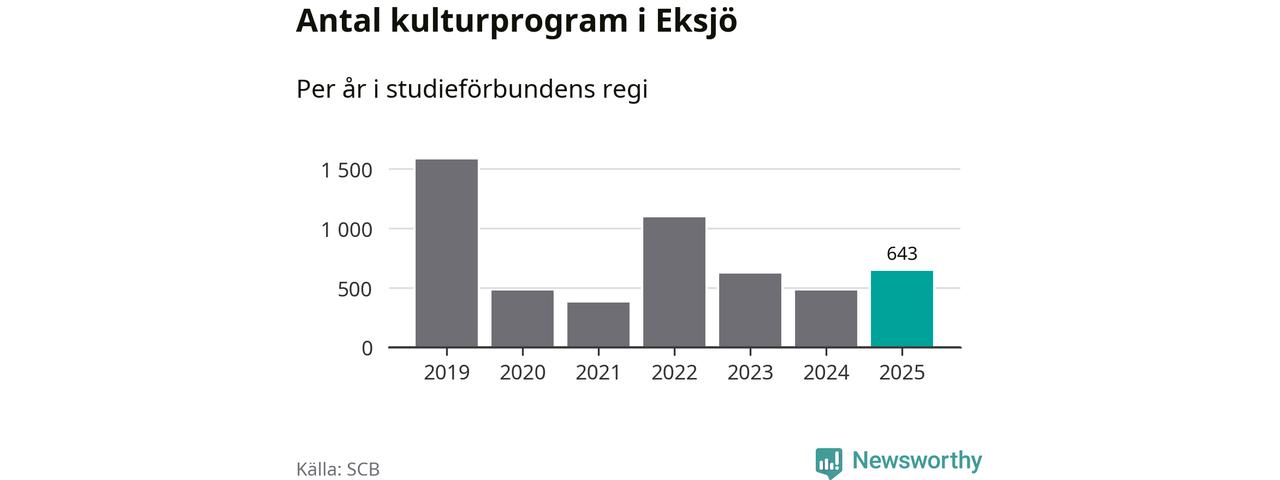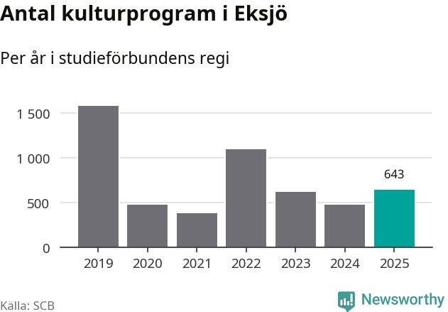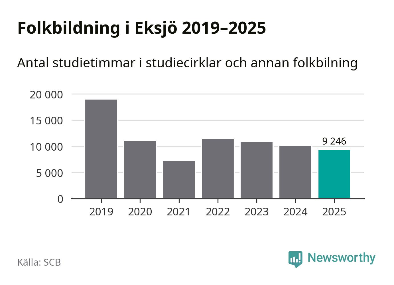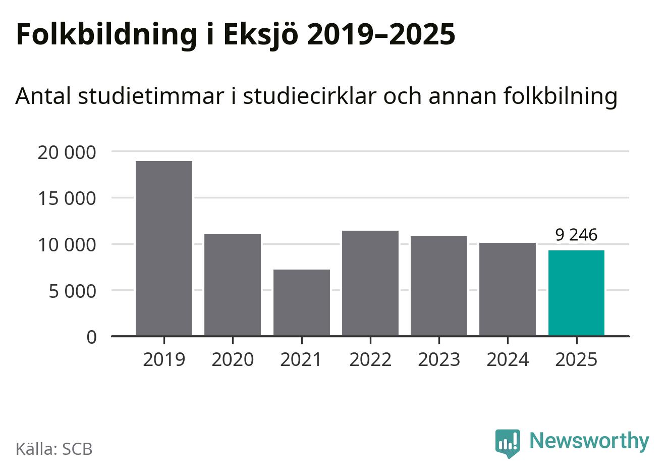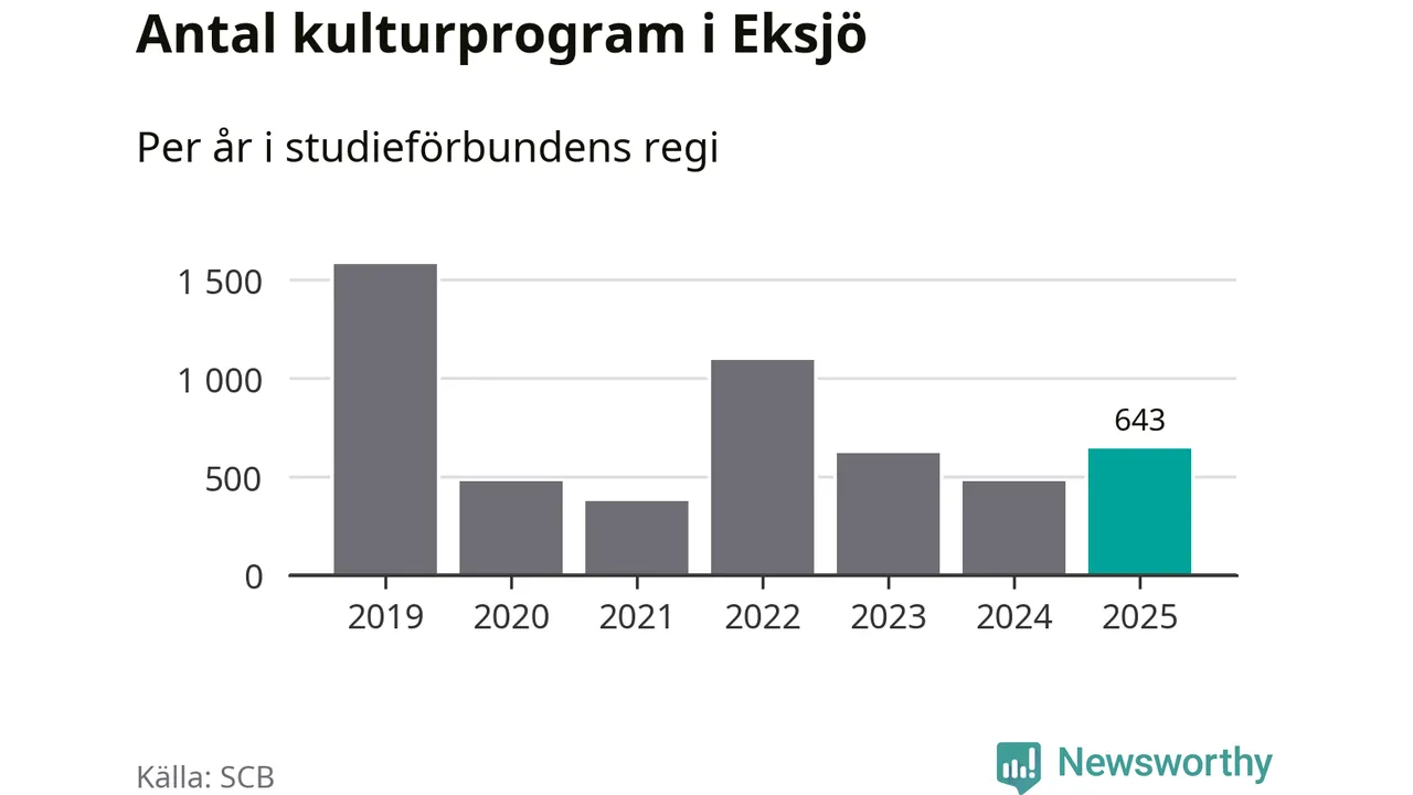 Studieförbunden drabbades hårt av pandemin. Även i Eksjö noterades det lägsta antalet studietimmar under 2021, som då var 62 procent färre än 2019. År 2024 var antalet studietimmar åter högre men de var fortfarande långt från förpandeminivåerna.