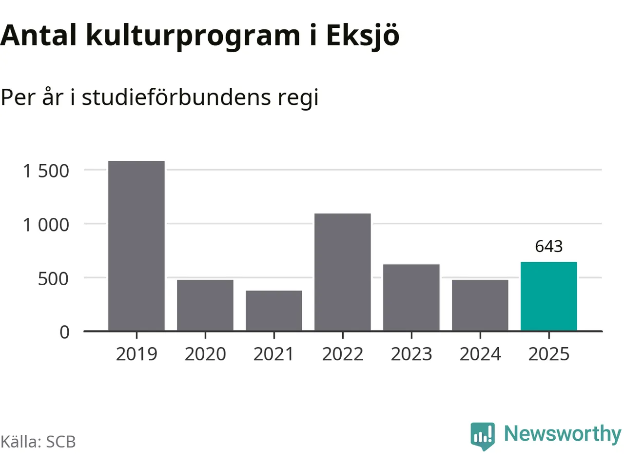 I Eksjö är minskningen ännu större: förra året hade studieförbunden omkring 9 200 studietimmar i kommunen, vilket är en minskning med åtta procent jämfört med året innan. Men medan studiecirklar och annan folkbildningsverksamhet minskade ökade faktiskt antalet kulturarrangemang i studieförbundens regi från omkring 480 till omkring 640.