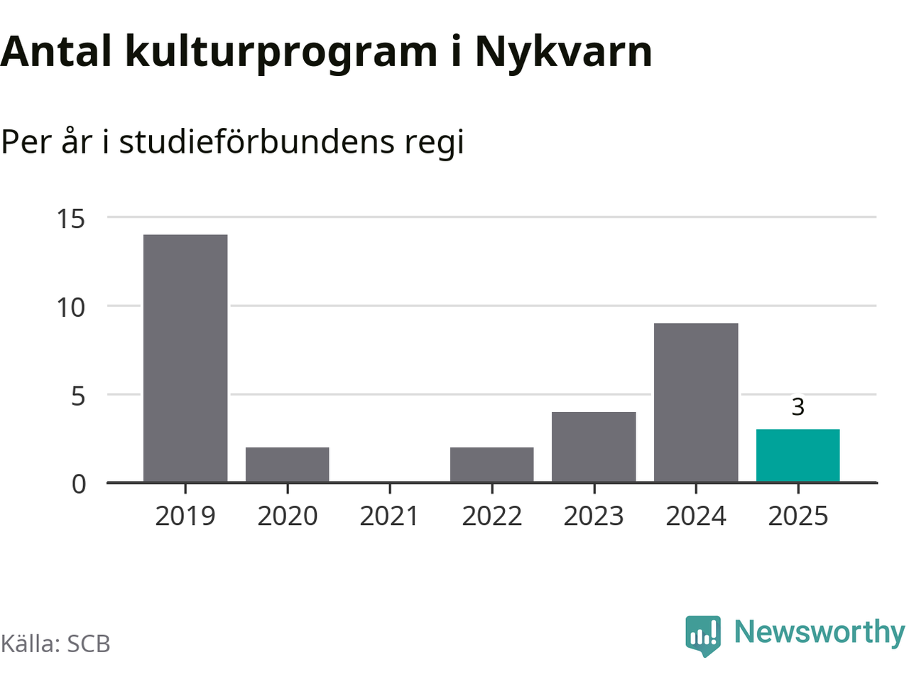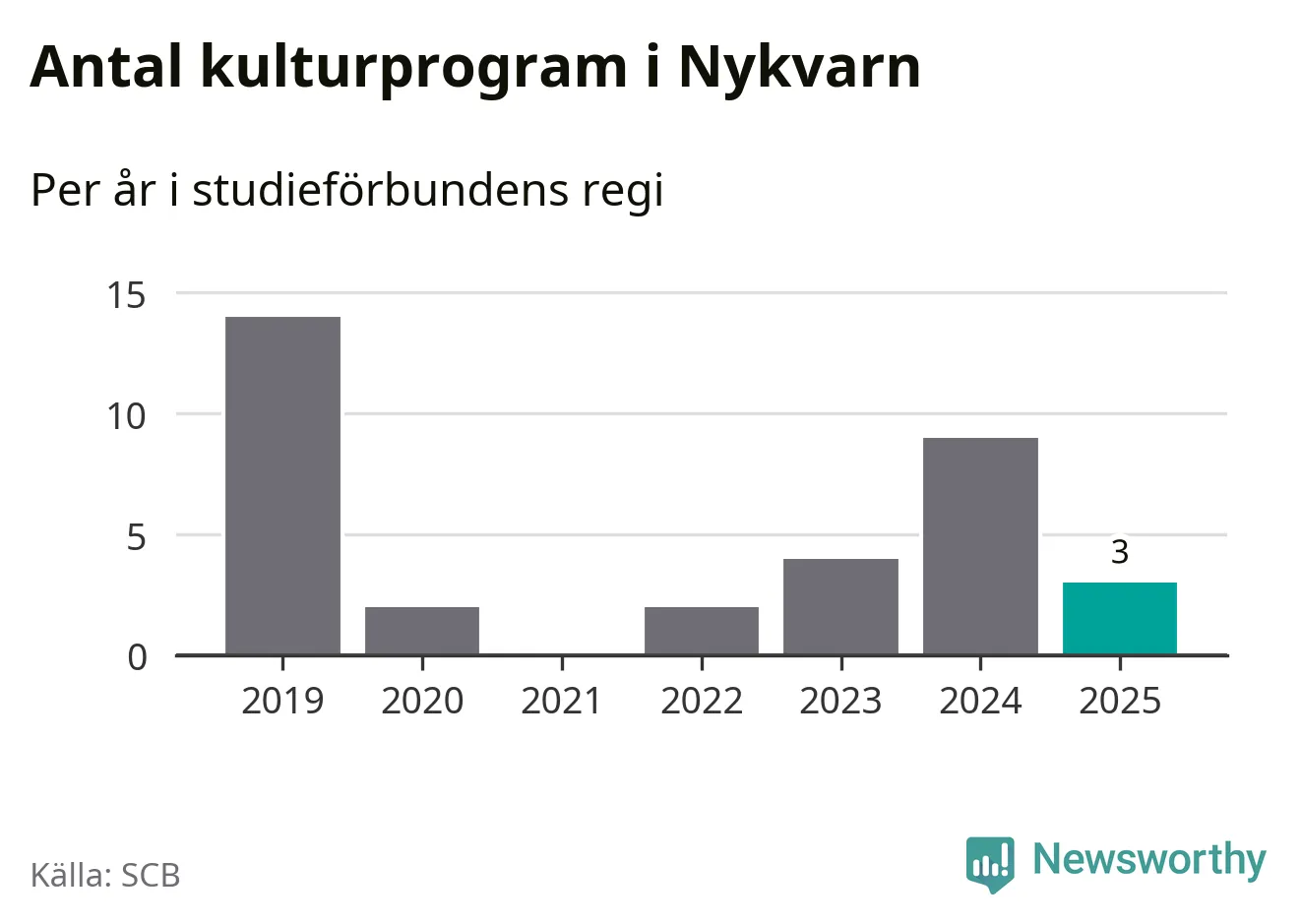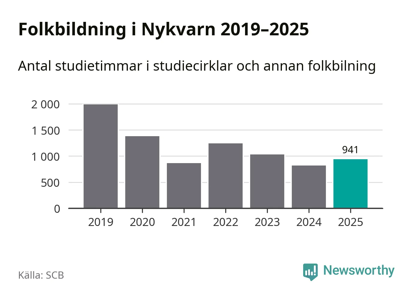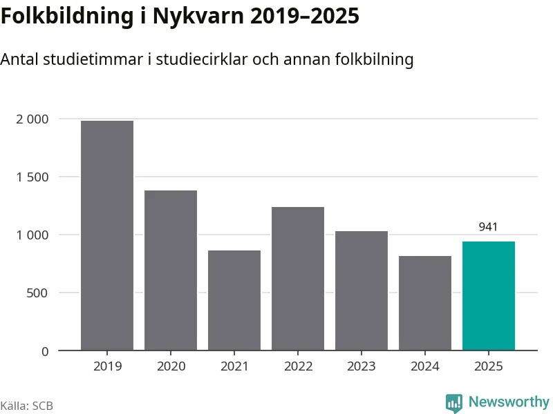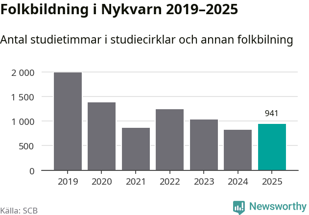 Men Nykvarn är en av 80 kommuner i landet där antalet studietimmar faktiskt ökade under under fjolåret. Drygt 900 studietimmar innebär en ökning med 15 procent jämfört med året innan. Däremot minskade antalet kulturarrangemang i studieförbundens regi i kommunen jämfört med året innan.