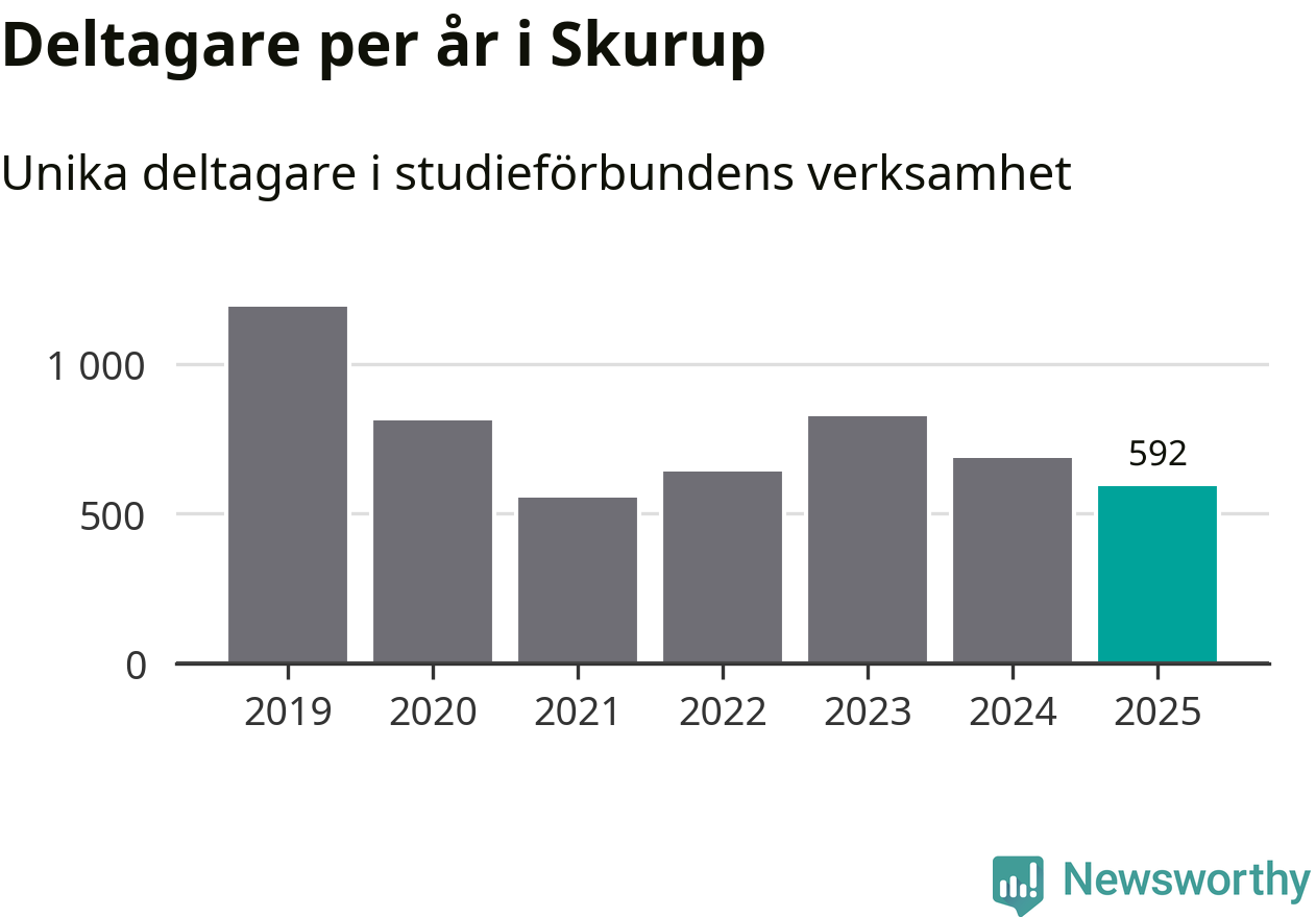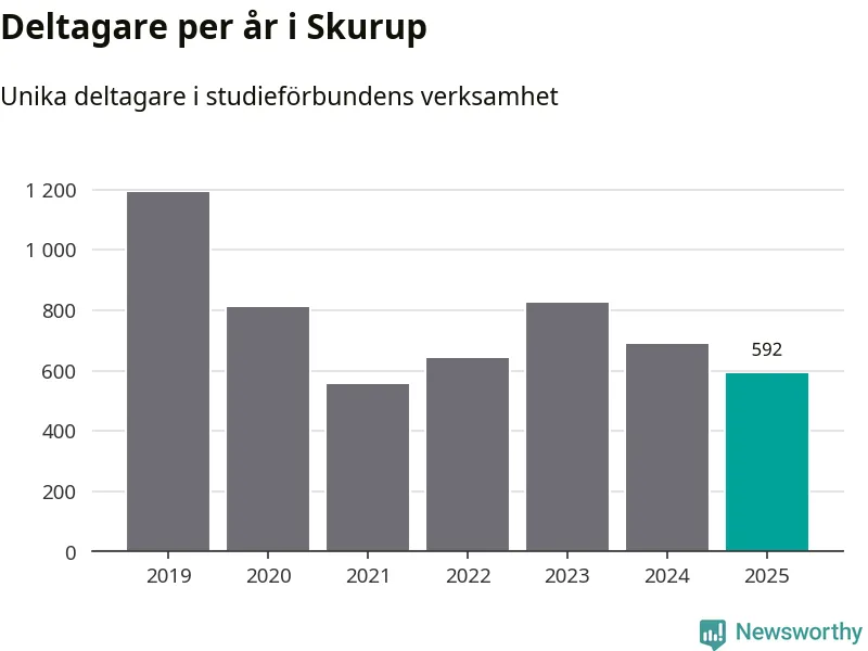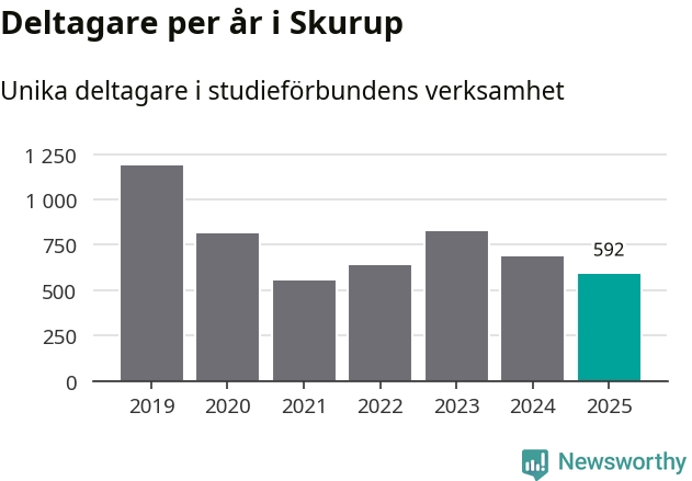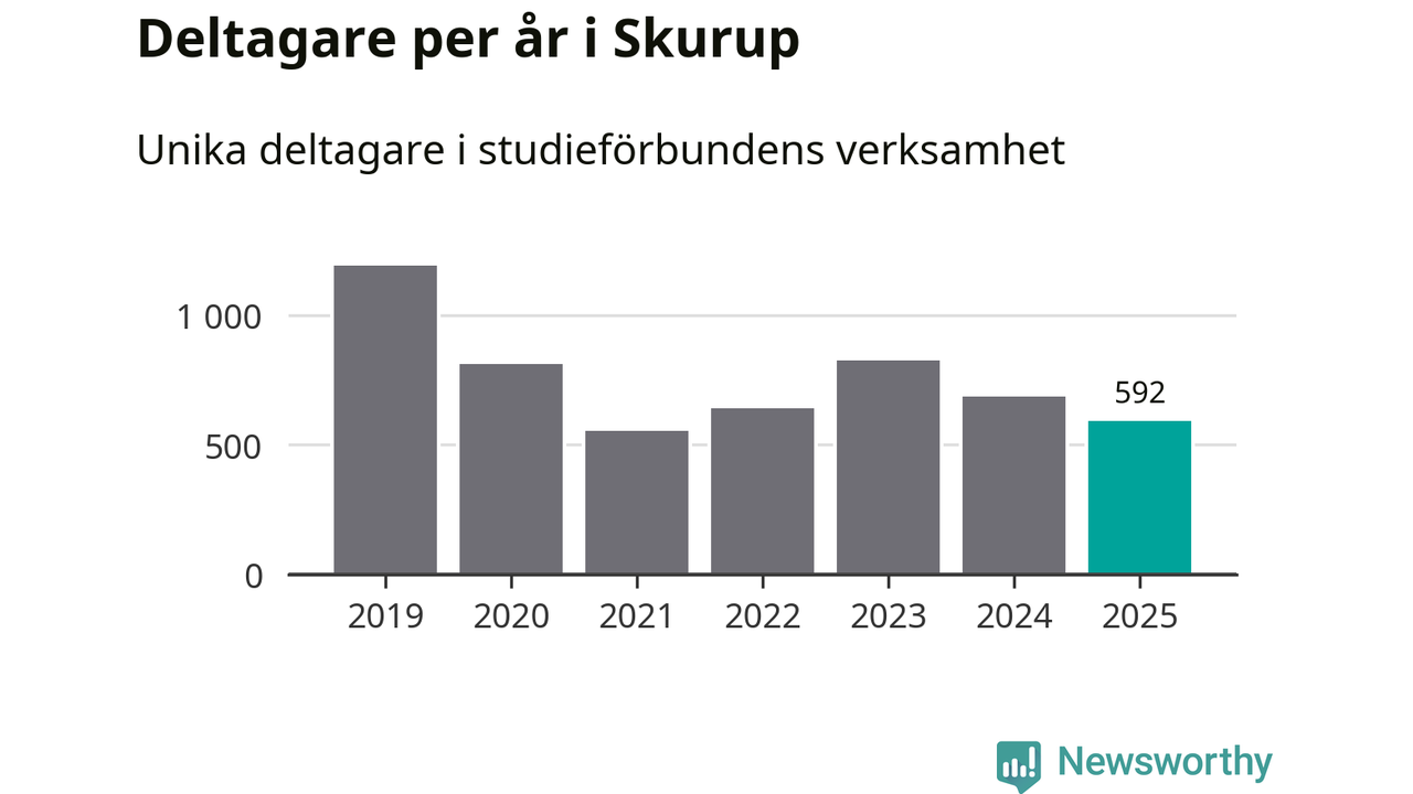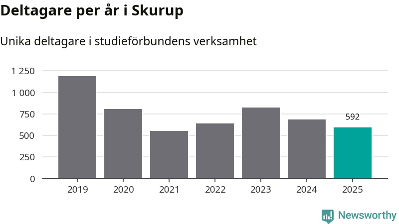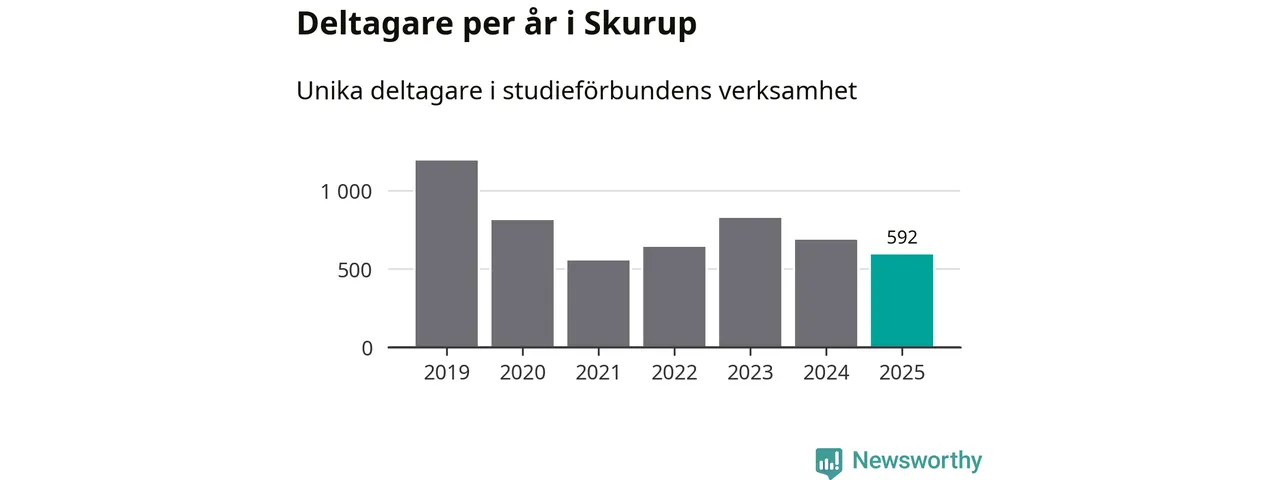 Även sett till unika deltagare är folkbildningen på tillbakagång i Skurup. 2025 deltog 592 personer i studieförbundens verksamhet, vilket är en minskning med 14 procent jämfört med året innan. Det innebär att tre procent av befolkningen i kommunen deltog i studieförbundens verksamhet under 2025, vilket är lägre än rikssnittet.