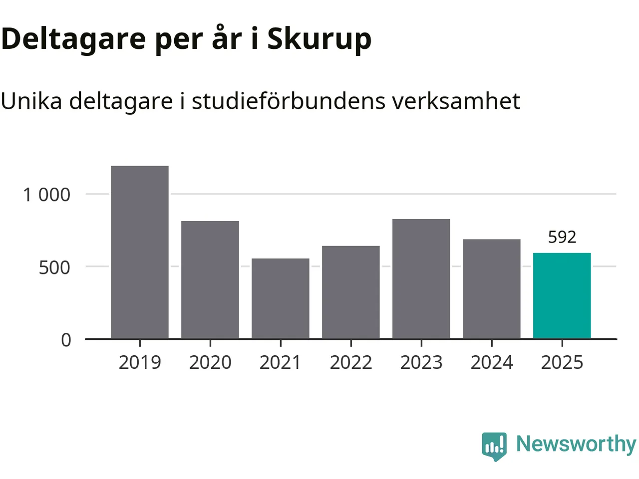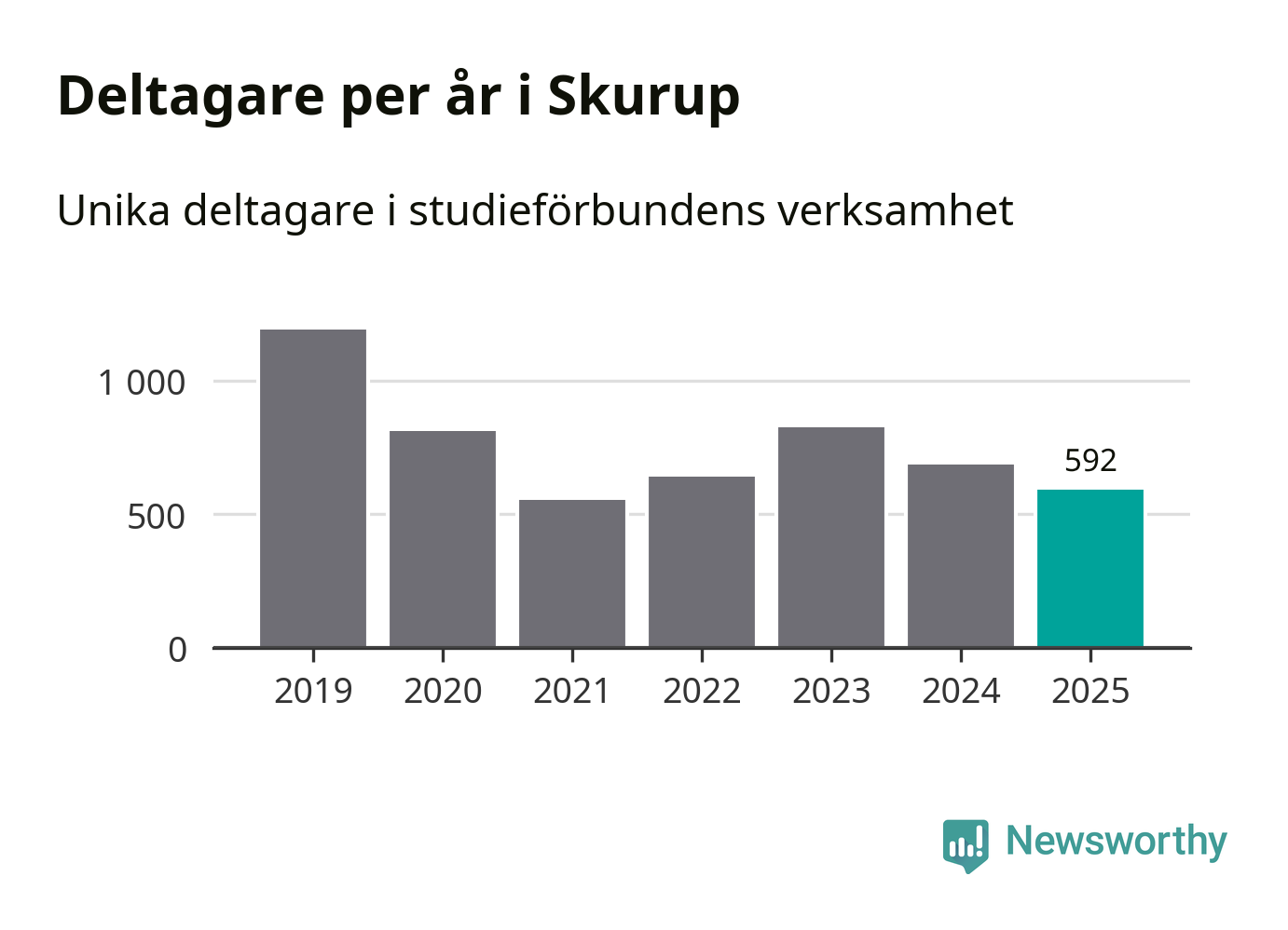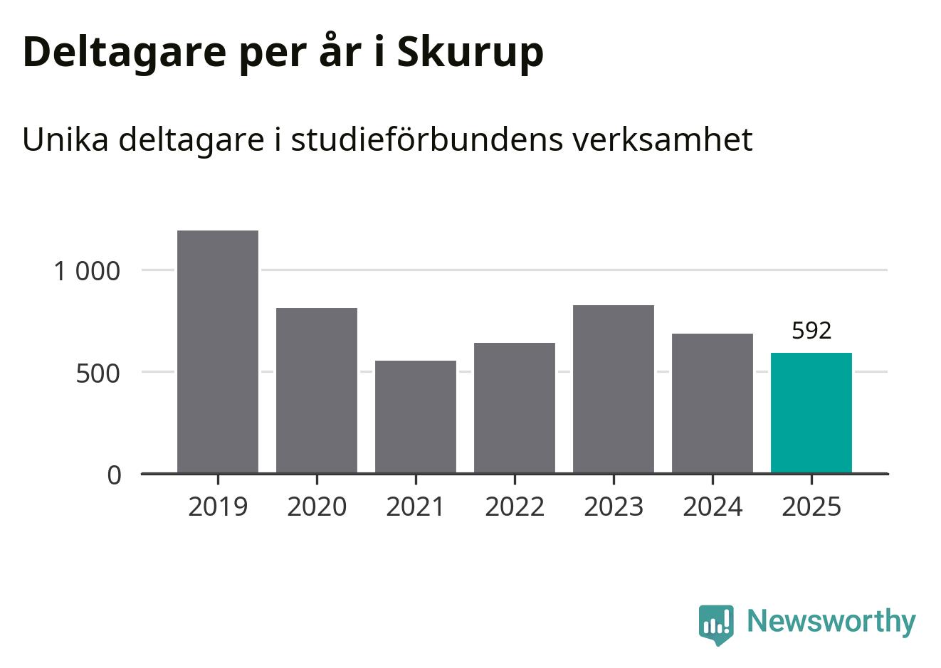 Även sett till unika deltagare är folkbildningen på tillbakagång i Skurup. 2025 deltog 592 personer i studieförbundens verksamhet, vilket är en minskning med 14 procent jämfört med året innan. Det innebär att tre procent av befolkningen i kommunen deltog i studieförbundens verksamhet under 2025, vilket är lägre än rikssnittet.