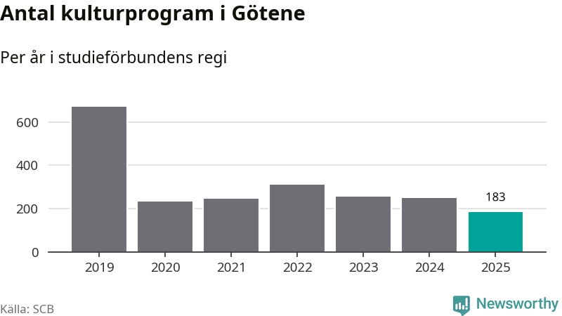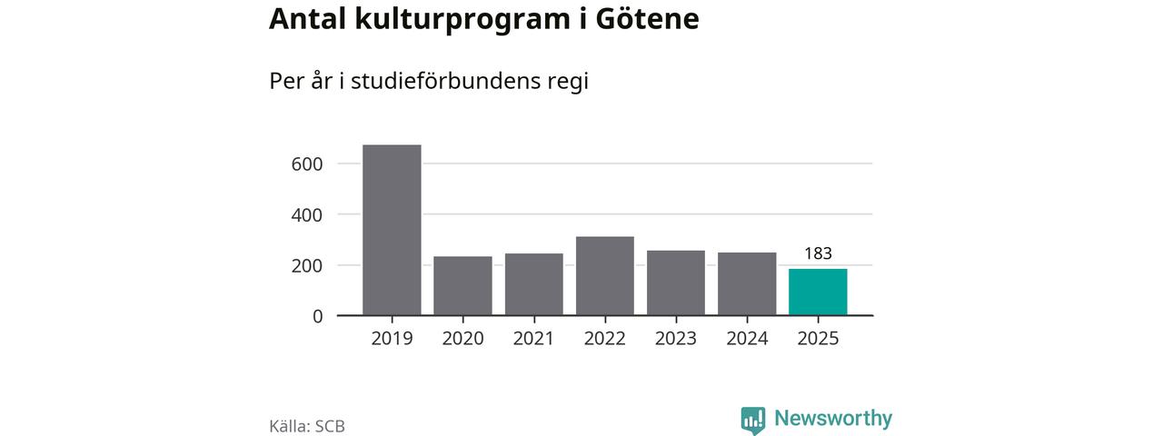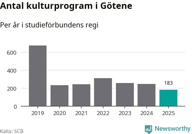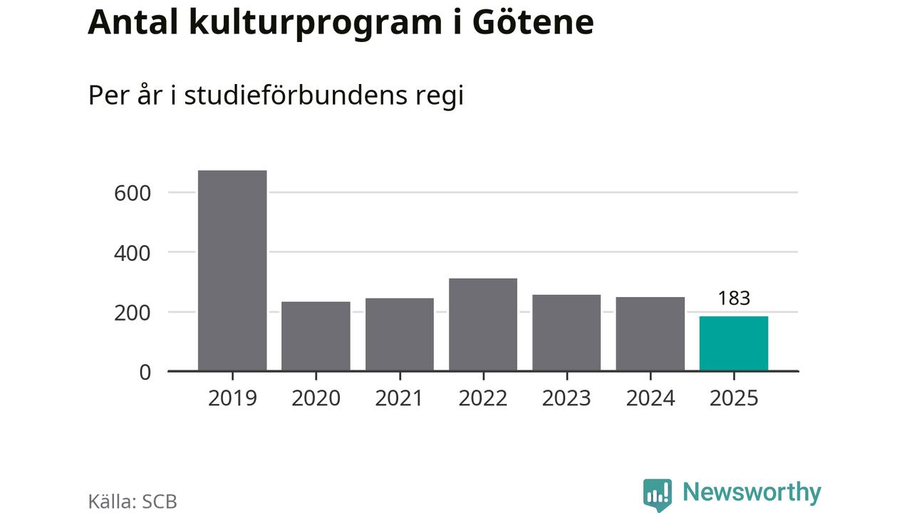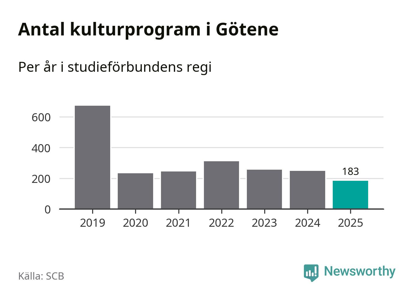 Minskningen är lika stor i Götene. Förra året hade studieförbunden omkring 2 500 studietimmar i kommunen jämfört med omkring 2 700 året innan. Även antalet kulturprogram i studieförbundens regi minskade, från 247 till 183 stycken.