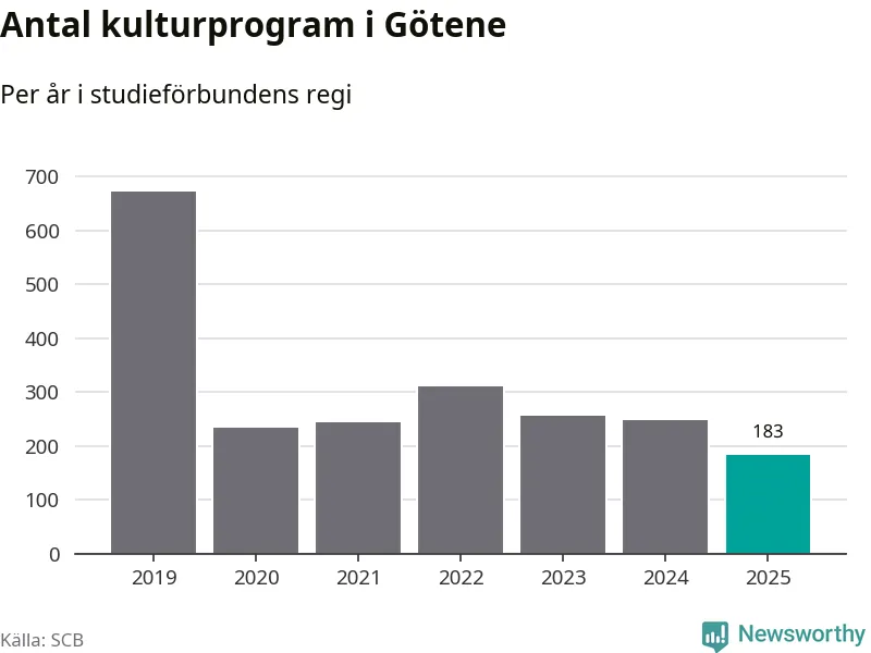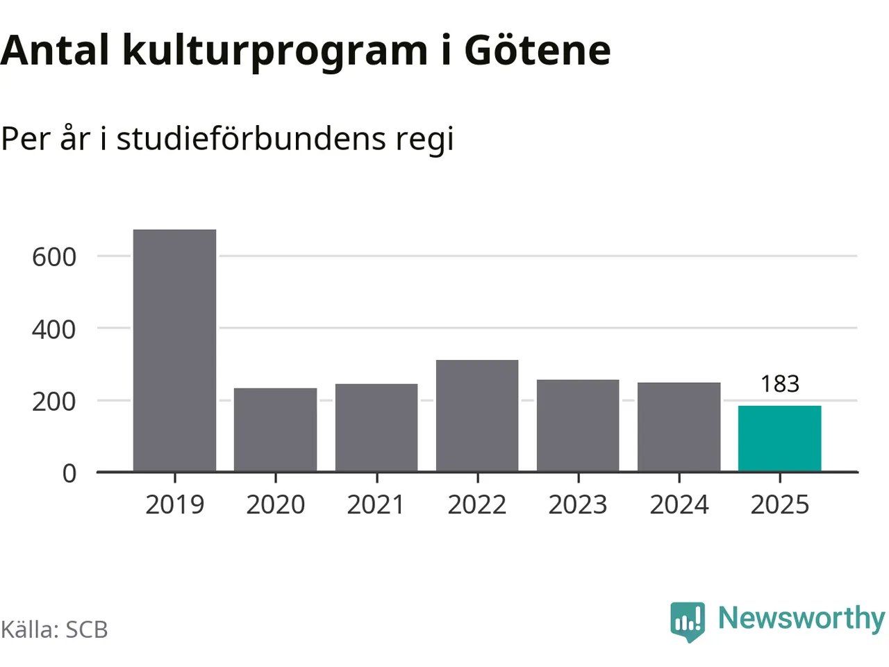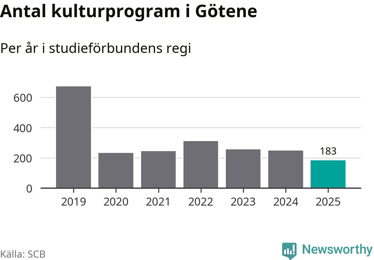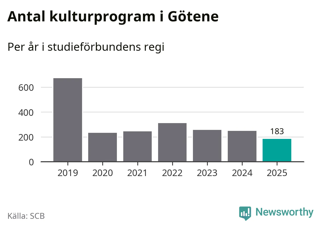 Minskningen är lika stor i Götene. Förra året hade studieförbunden omkring 2 500 studietimmar i kommunen jämfört med omkring 2 700 året innan. Även antalet kulturprogram i studieförbundens regi minskade, från 247 till 183 stycken.