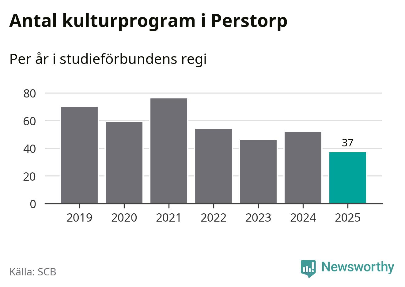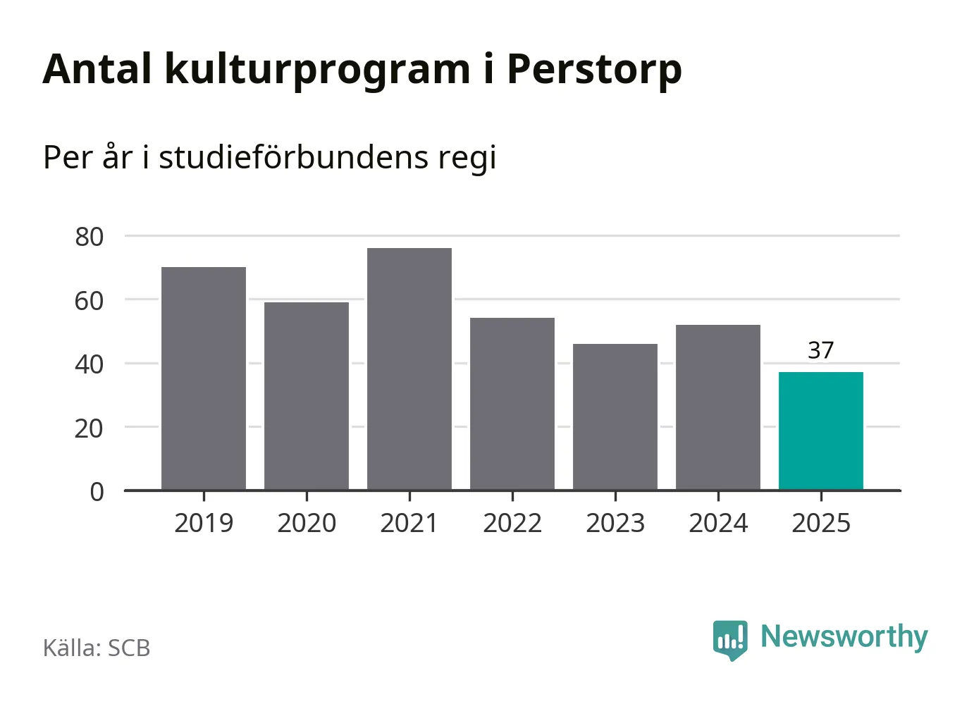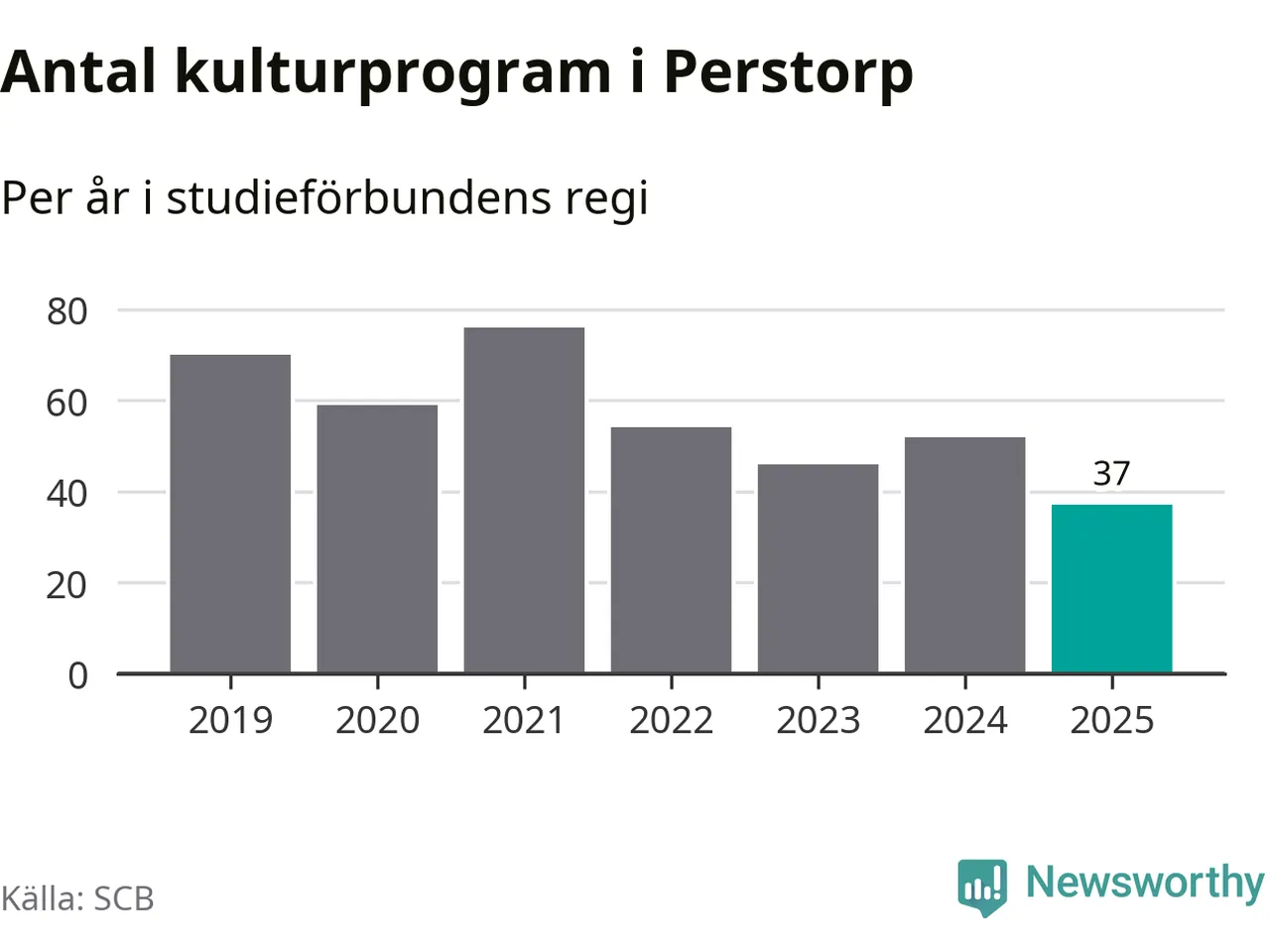 Men Perstorp är en av 80 kommuner i landet där antalet studietimmar faktiskt ökade under under fjolåret. Drygt 2 000 studietimmar innebär en ökning med 7 procent jämfört med året innan. Däremot minskade antalet kulturarrangemang i studieförbundens regi i kommunen jämfört med året innan.