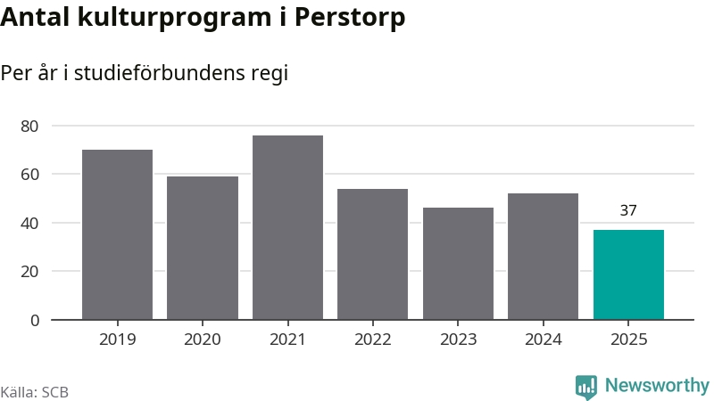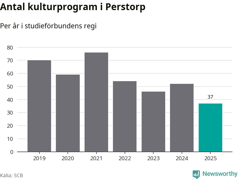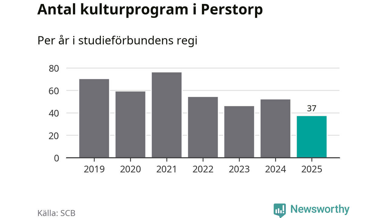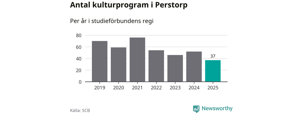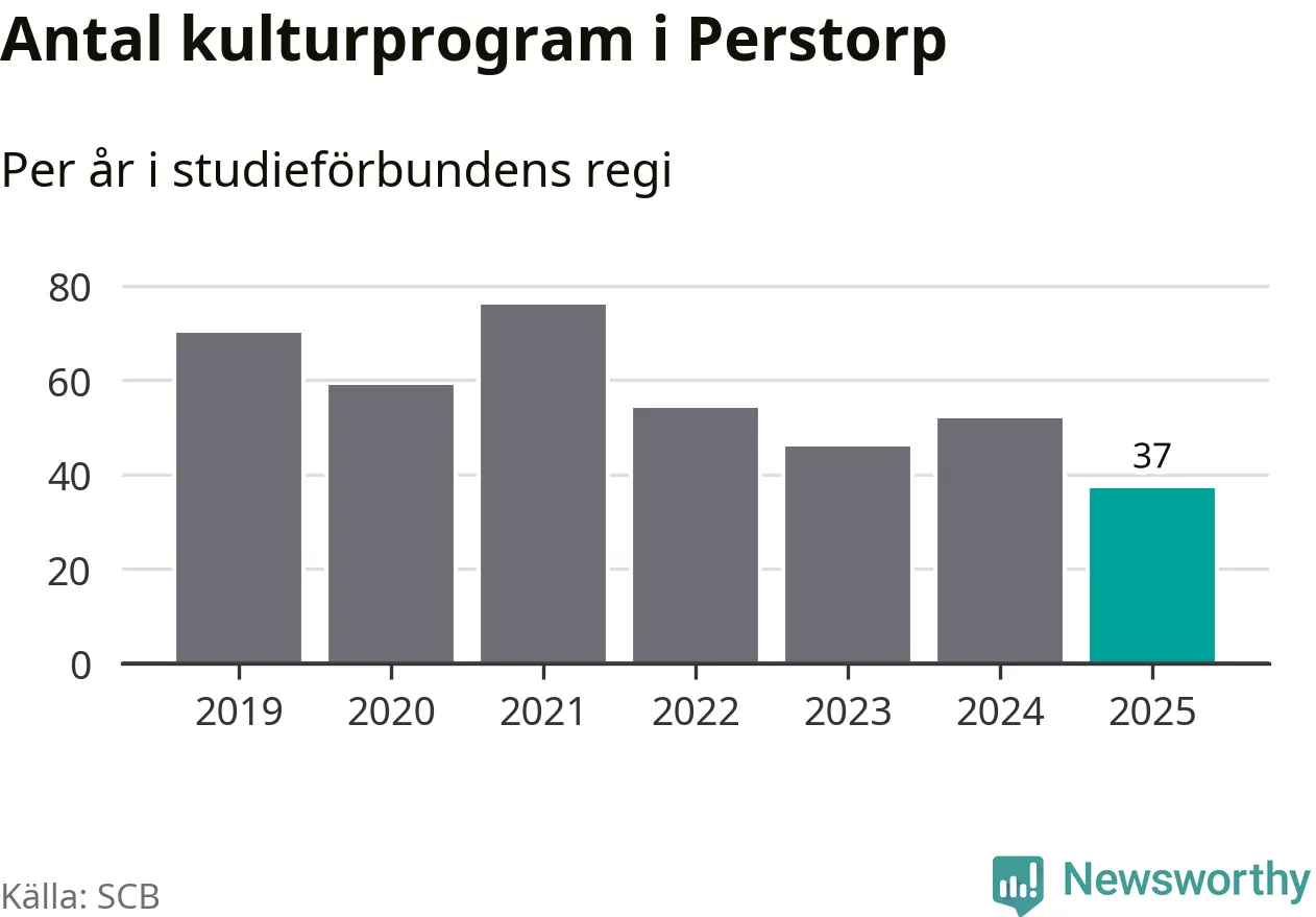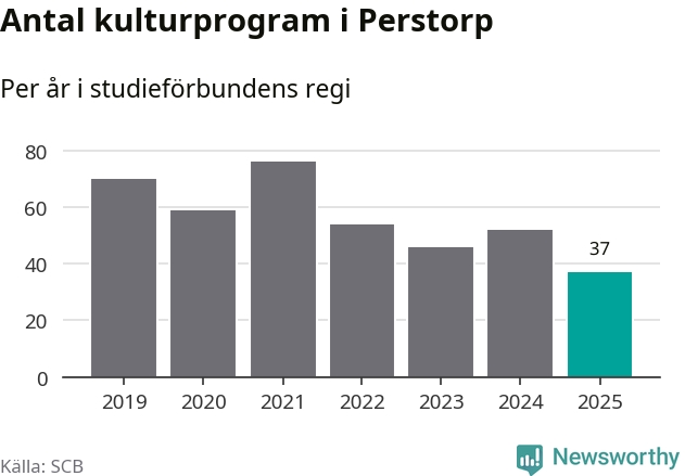 Men Perstorp är en av 80 kommuner i landet där antalet studietimmar faktiskt ökade under under fjolåret. Drygt 2 000 studietimmar innebär en ökning med 7 procent jämfört med året innan. Däremot minskade antalet kulturarrangemang i studieförbundens regi i kommunen jämfört med året innan.