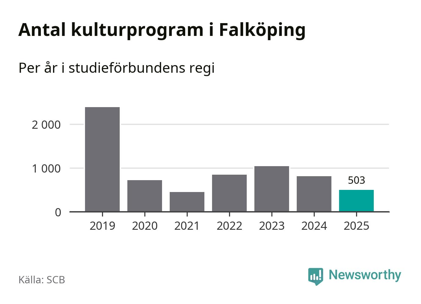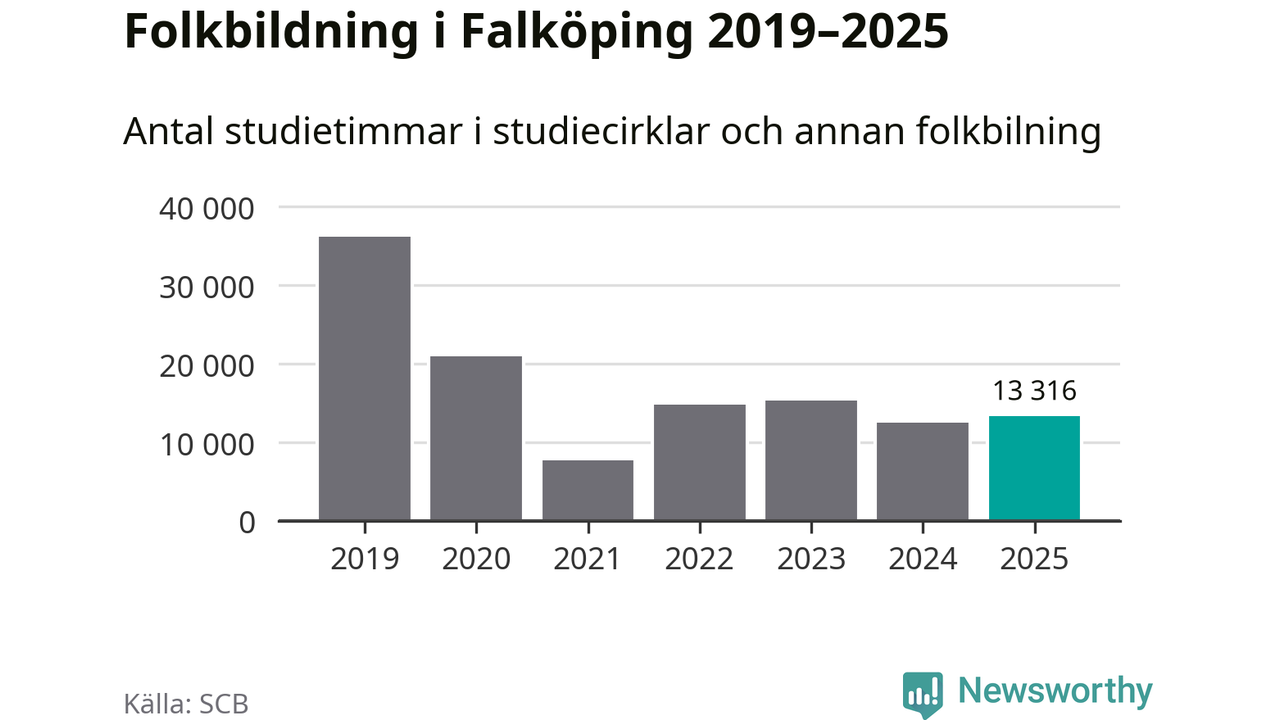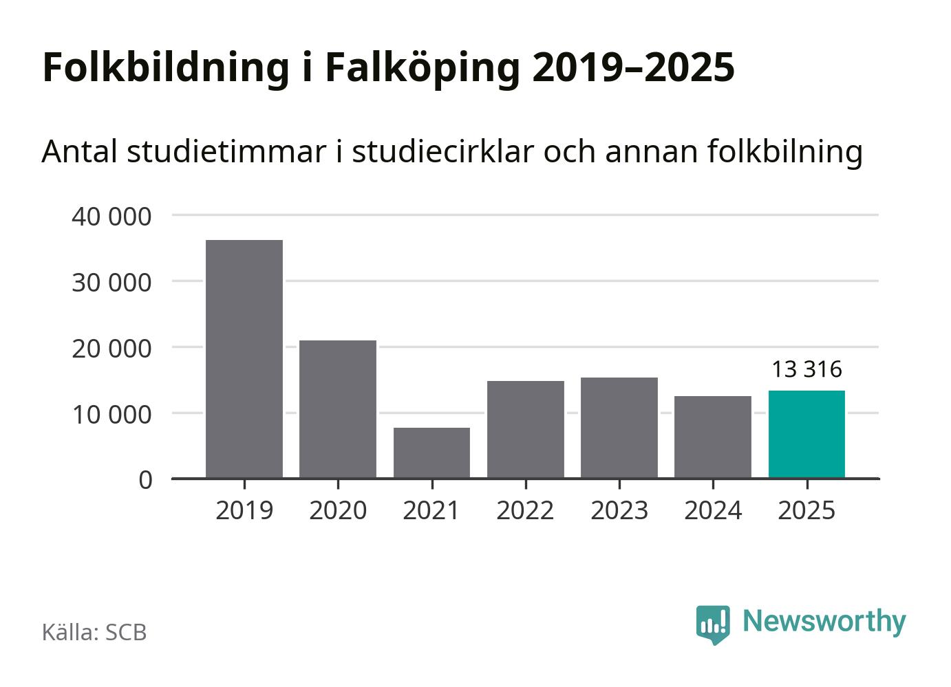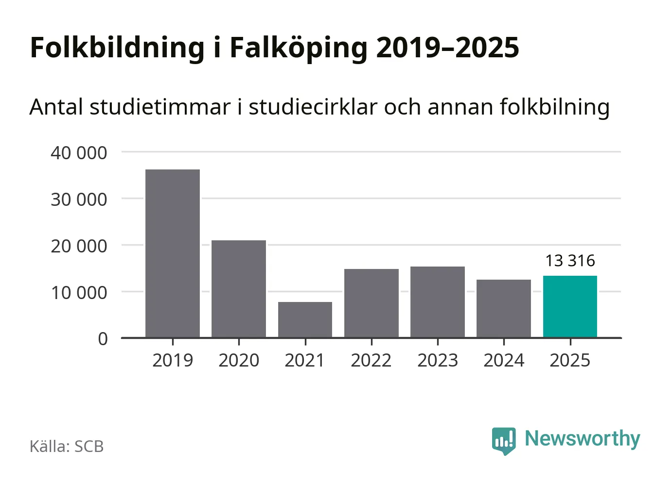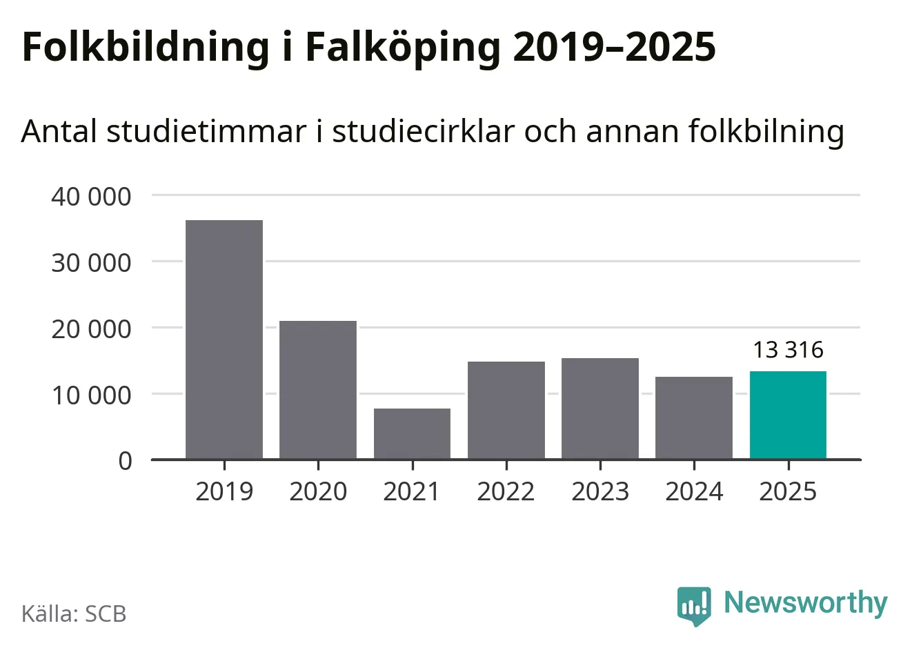 Åtta av de studieförbund som 2025 fick bidrag från Folkbildningsrådet har haft någon form av verksamhet – antingen studiecirkel, annan folkbildning eller kulturprogram – i Falköping under de två senaste åren. Under 2025 ökade fem förbund antalet studietimmar i kommunen jämfört med året innan, medan de tre andra förbunden i kommunen noterade färre timmar.