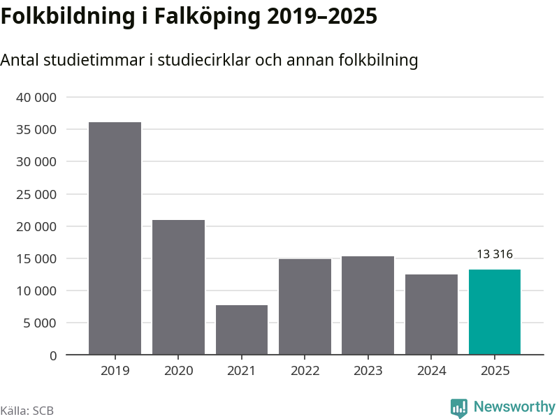 Men Falköping är en av 80 kommuner i landet där antalet studietimmar faktiskt ökade under under fjolåret. Omkring 13 300 studietimmar innebär en ökning med 6 procent jämfört med året innan. Däremot minskade antalet kulturarrangemang i studieförbundens regi i kommunen jämfört med året innan.