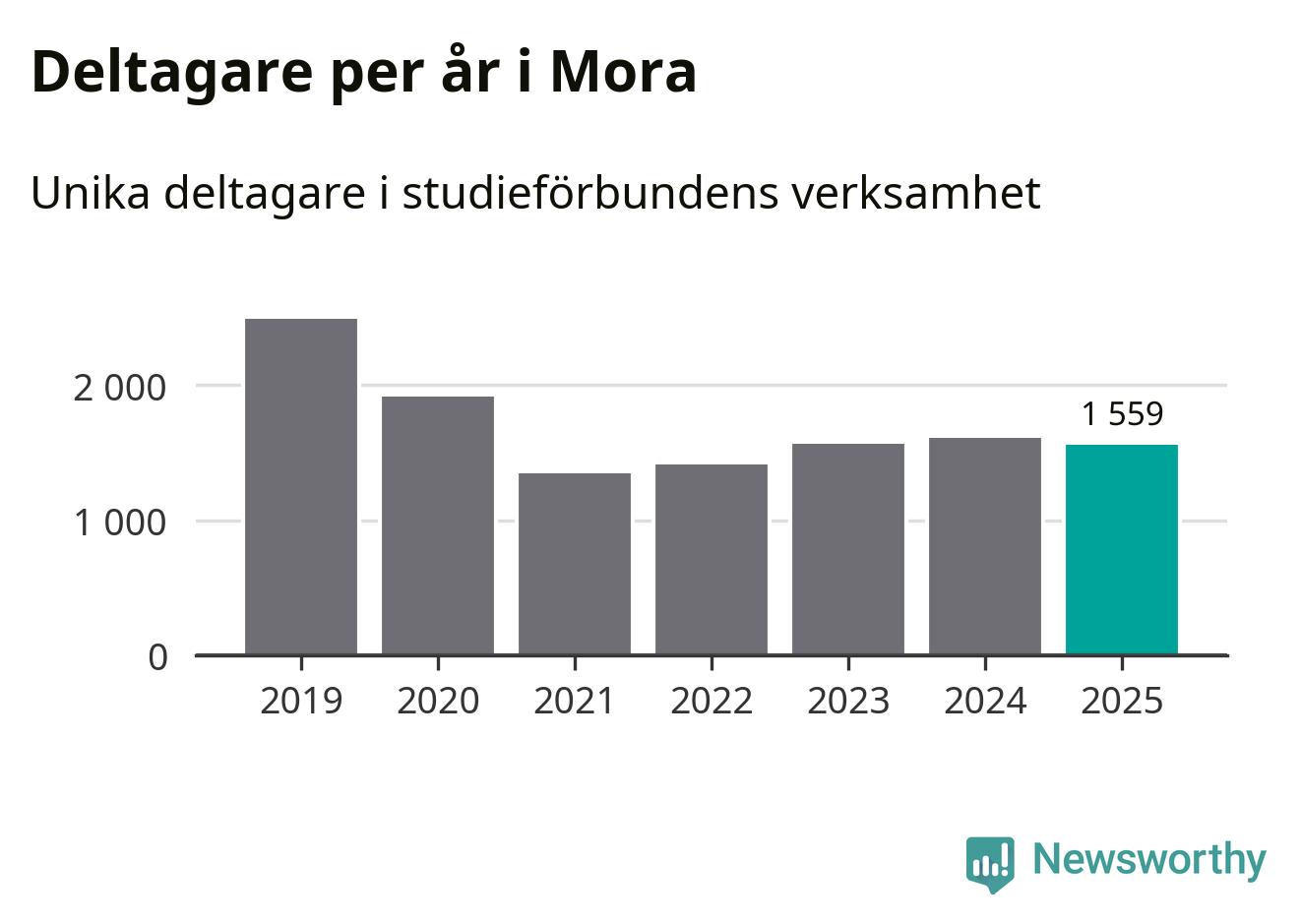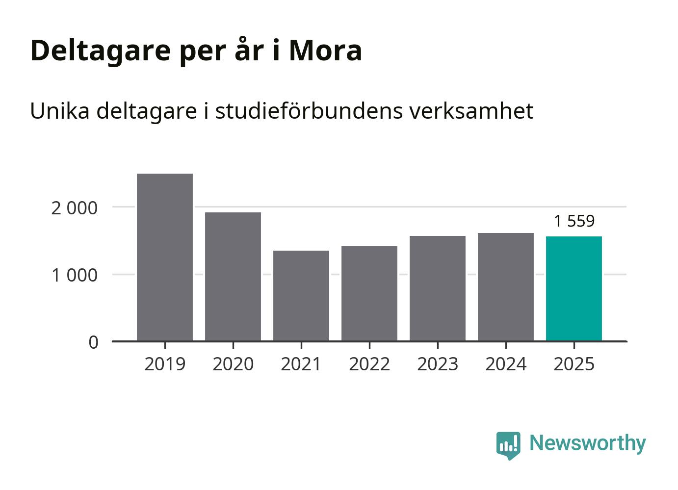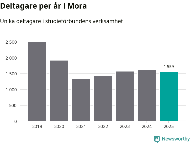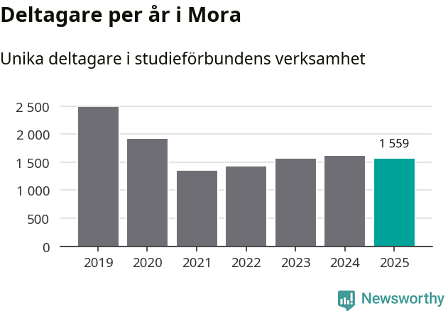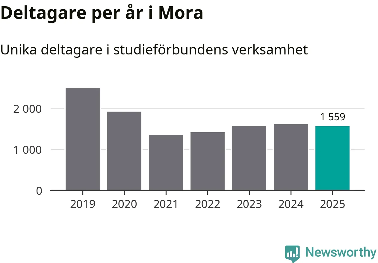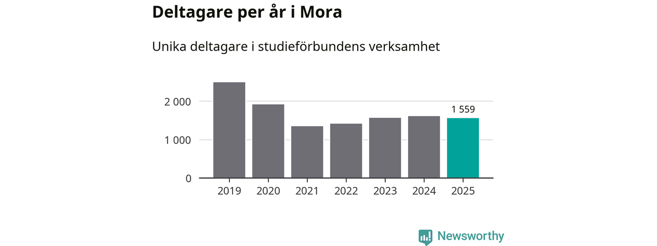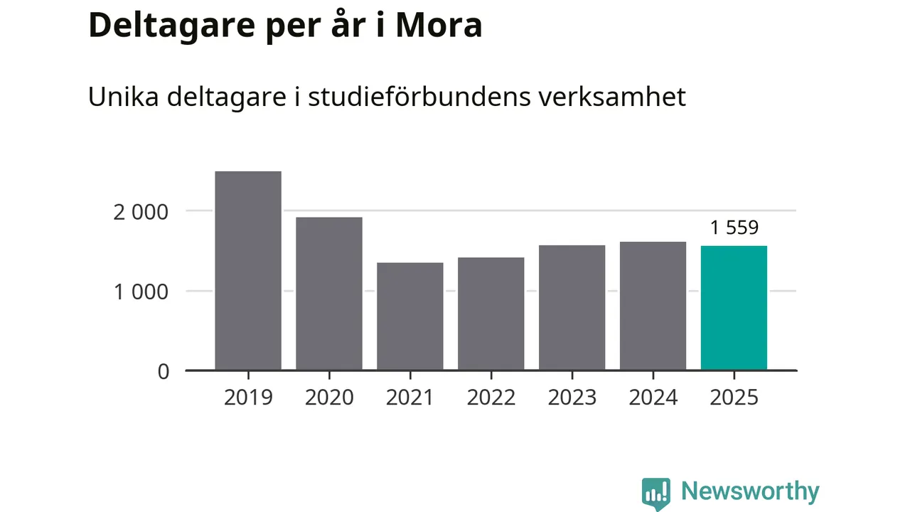 Även sett till unika deltagare är folkbildningen på tillbakagång i Mora. 2025 deltog 1 559 personer i studieförbundens verksamhet, vilket är en minskning med tre procent jämfört med året innan. Det innebär att åtta procent av befolkningen i kommunen deltog i studieförbundens verksamhet under 2025, vilket är ungefär som rikssnittet.