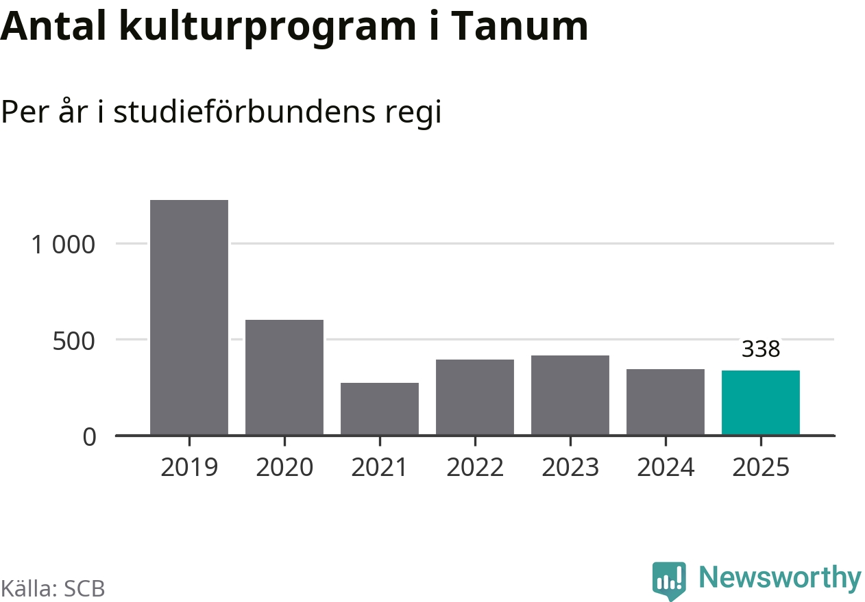 Utvecklingen ser ungefär likadan ut i Tanum, förra året hade studieförbunden omkring 5 200 studietimmar i kommunen jämfört med omkring 5 500 året innan, en minskning med fem procent. Även antalet kulturprogram i studieförbundens regi minskade, från 345 till 338 stycken.