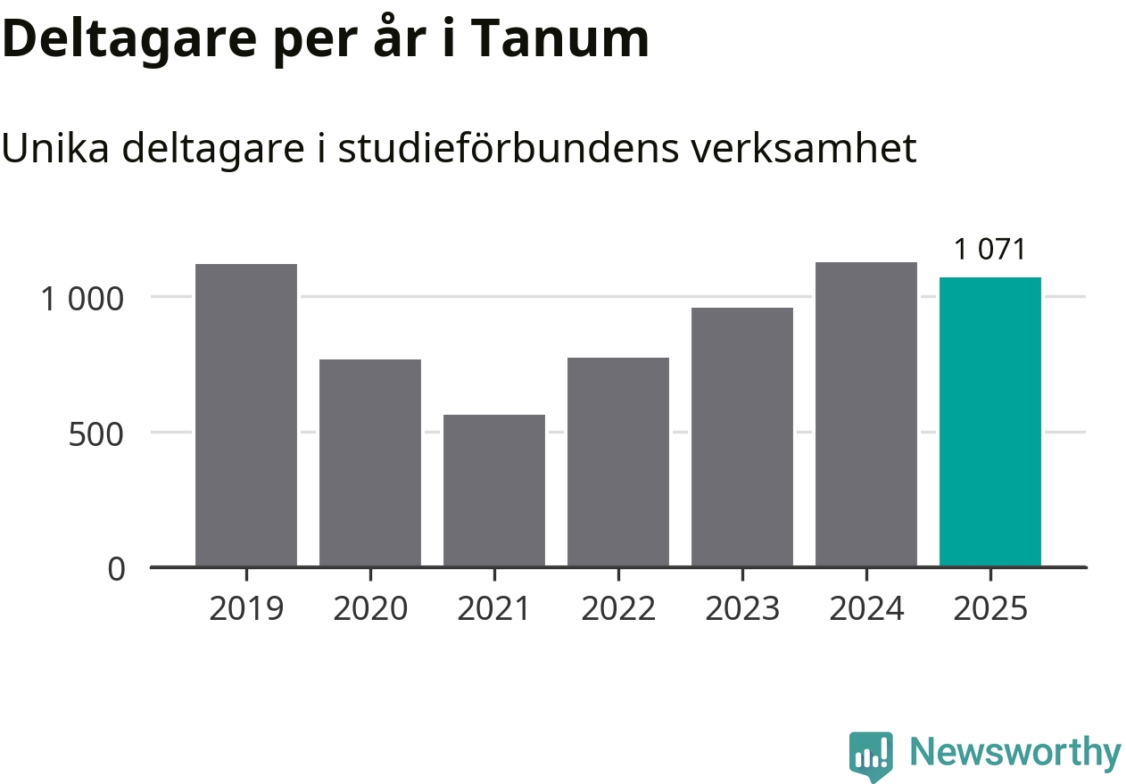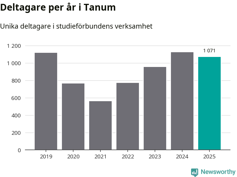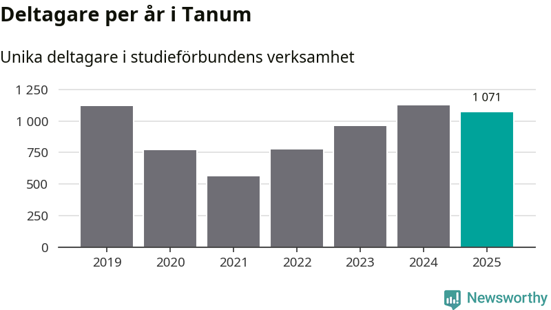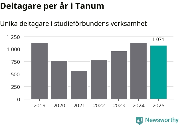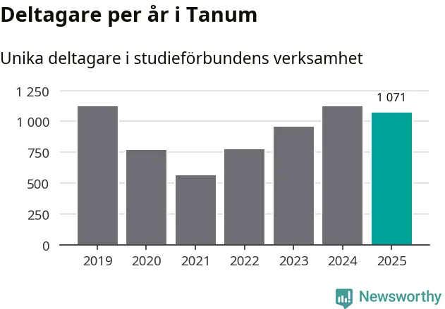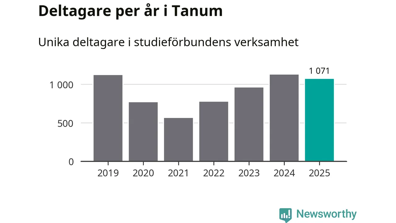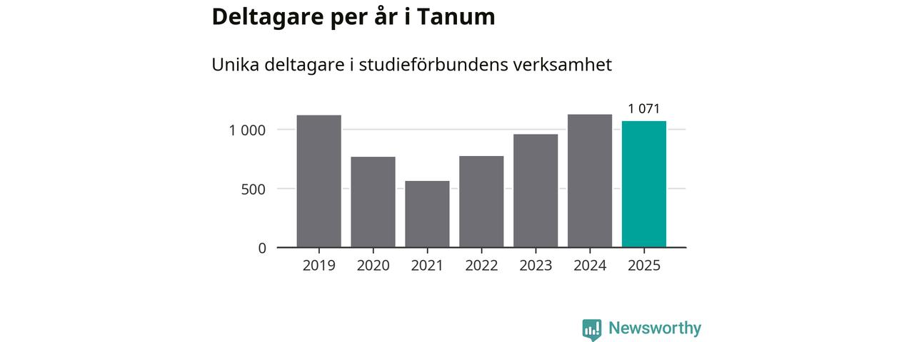 Även sett till unika deltagare är folkbildningen på tillbakagång i Tanum. 2025 deltog 1 071 personer i studieförbundens verksamhet, vilket är en minskning med fem procent jämfört med året innan. Det innebär att åtta procent av befolkningen i kommunen deltog i studieförbundens verksamhet under 2025, vilket är högre än rikssnittet.