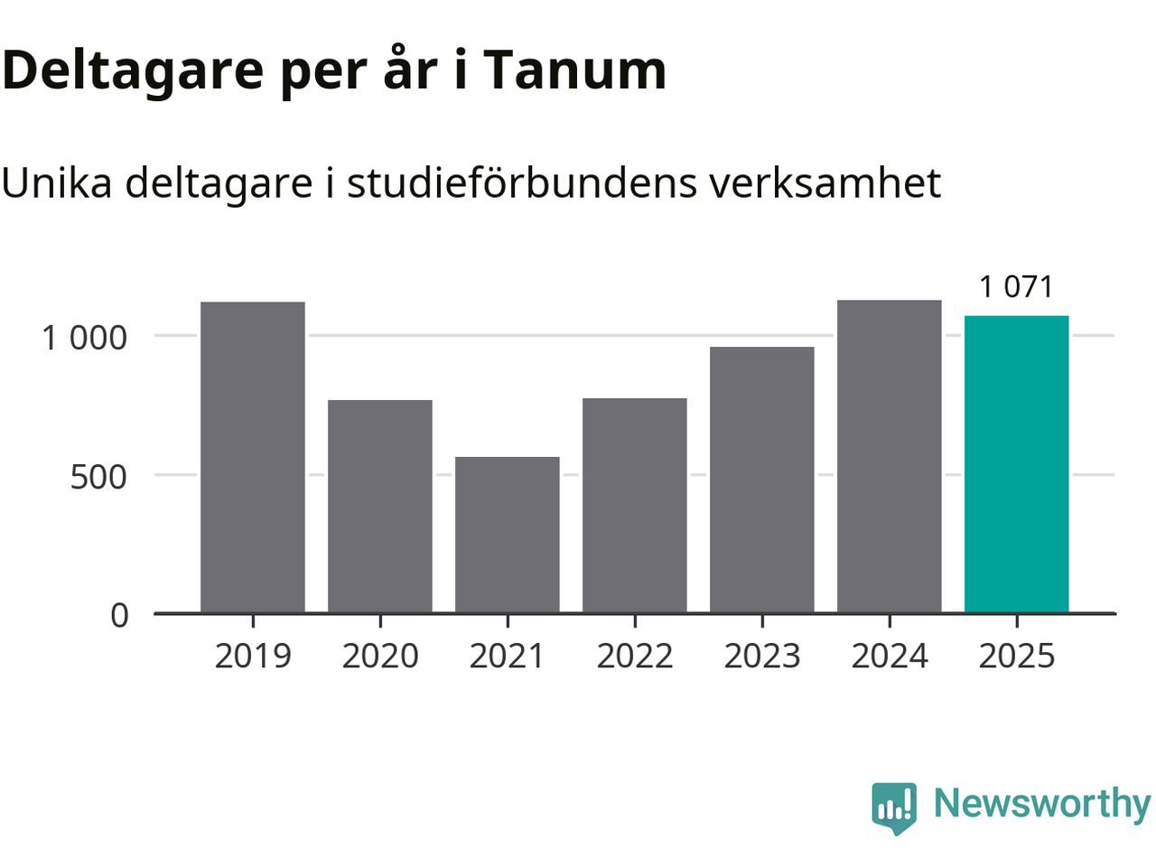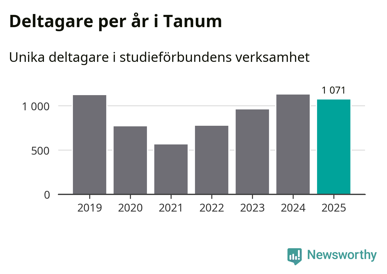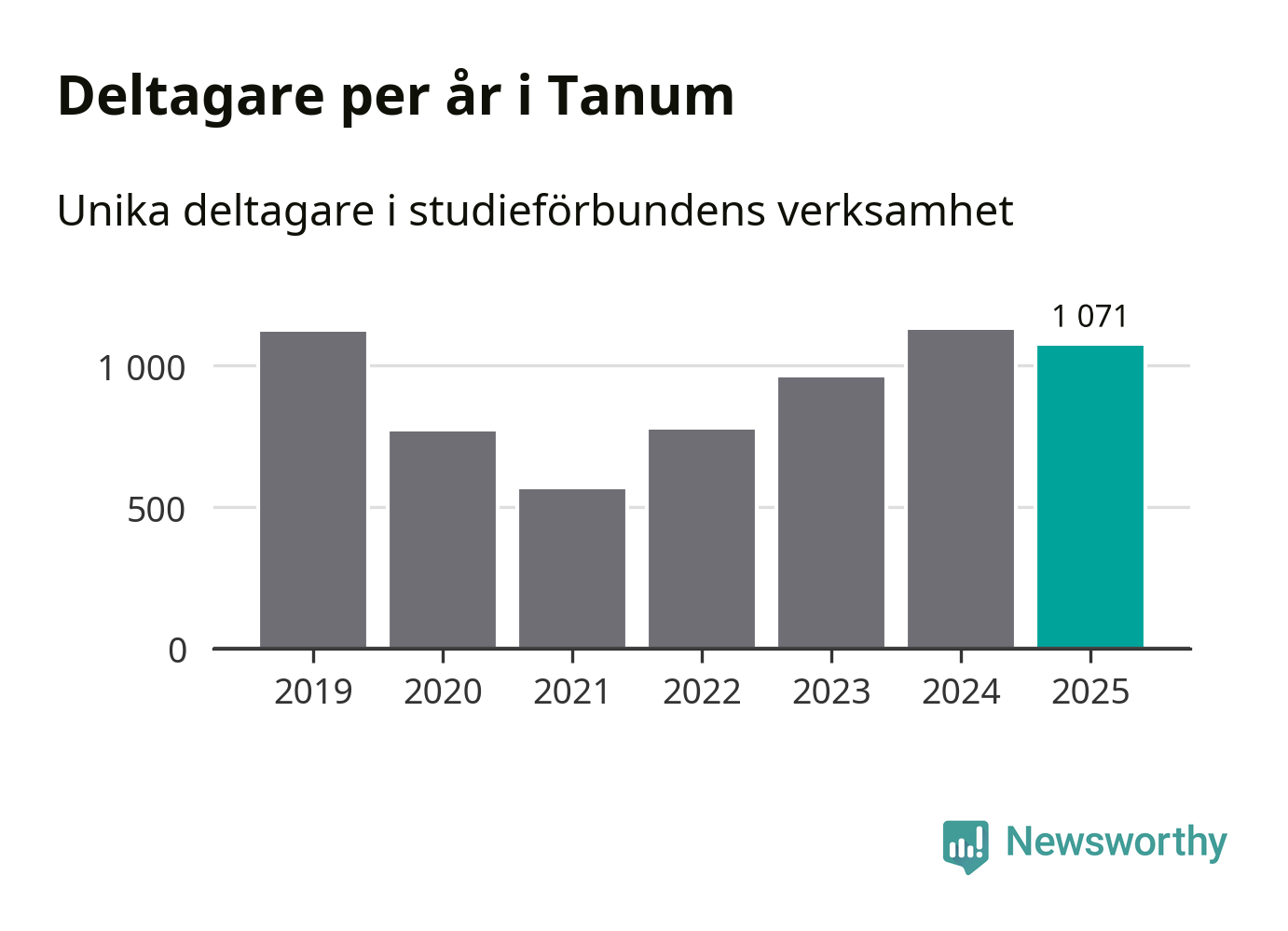 Även sett till unika deltagare är folkbildningen på tillbakagång i Tanum. 2025 deltog 1 071 personer i studieförbundens verksamhet, vilket är en minskning med fem procent jämfört med året innan. Det innebär att åtta procent av befolkningen i kommunen deltog i studieförbundens verksamhet under 2025, vilket är högre än rikssnittet.