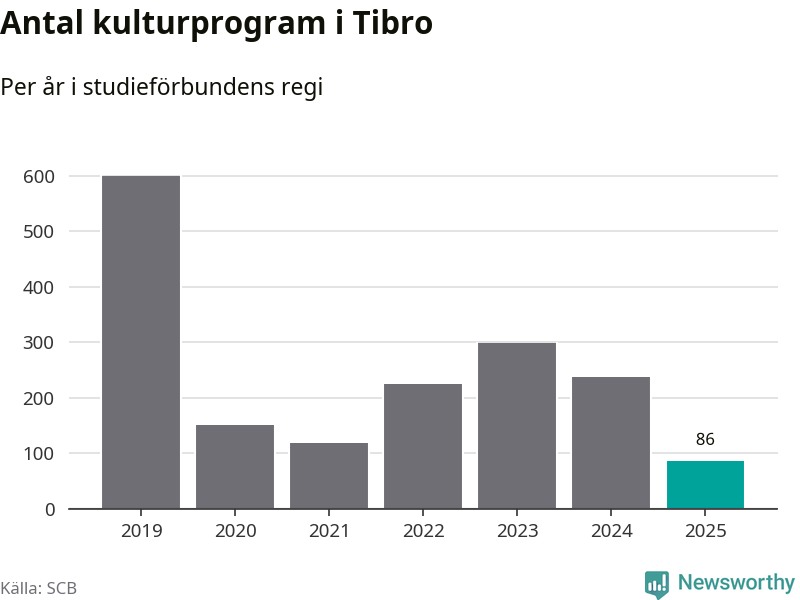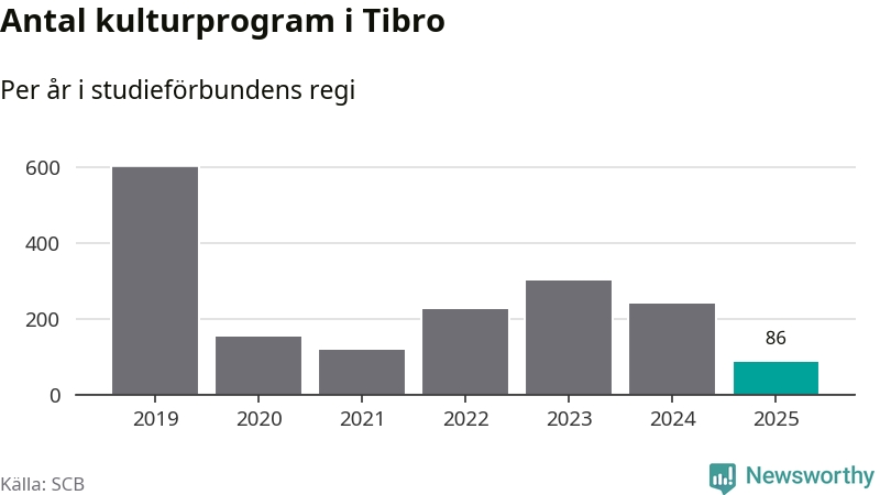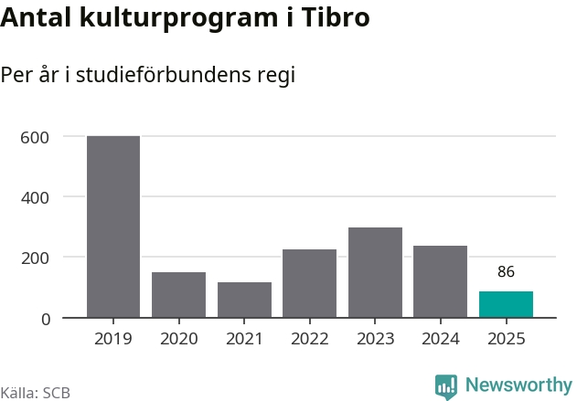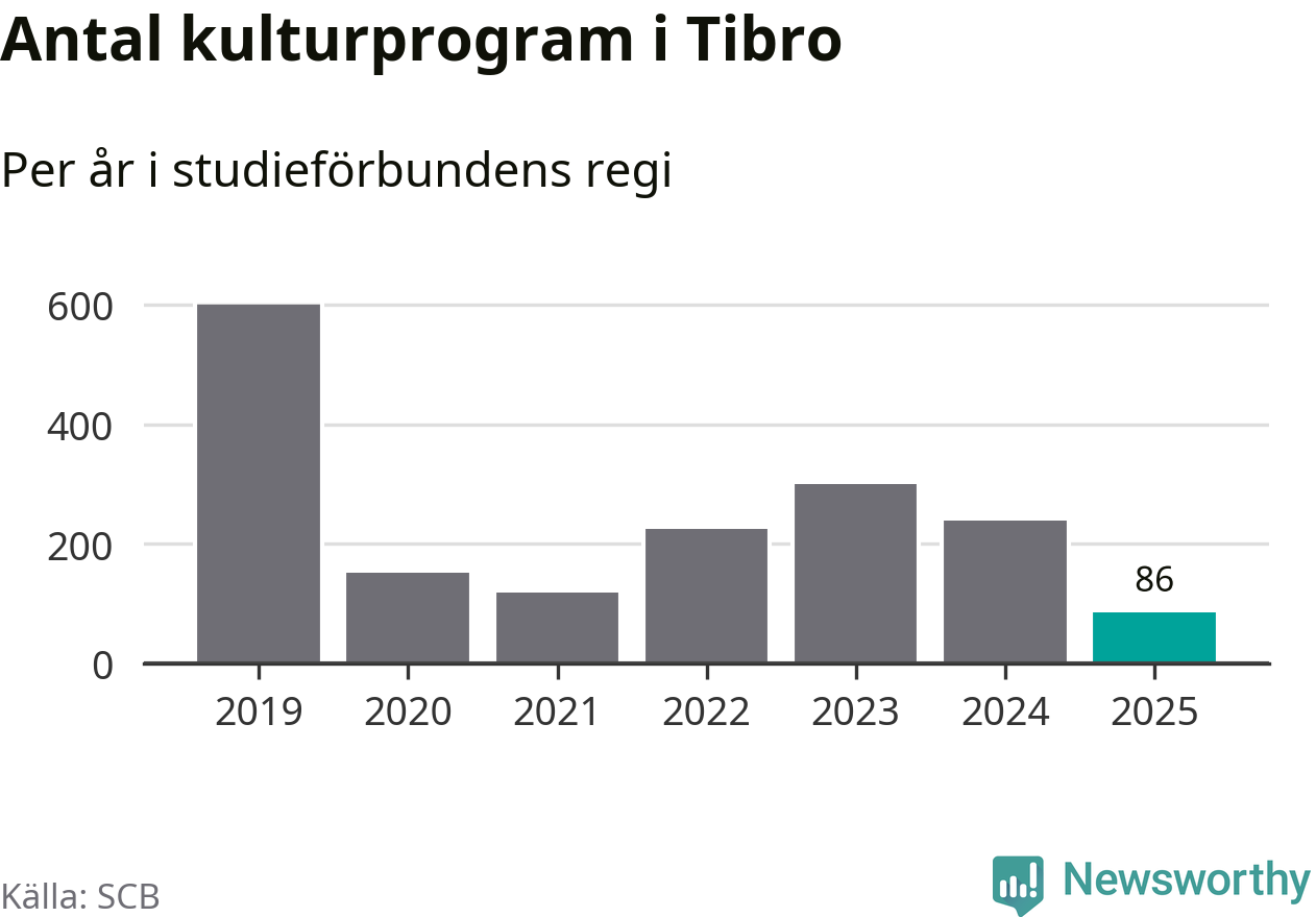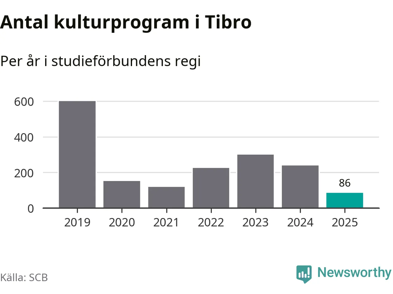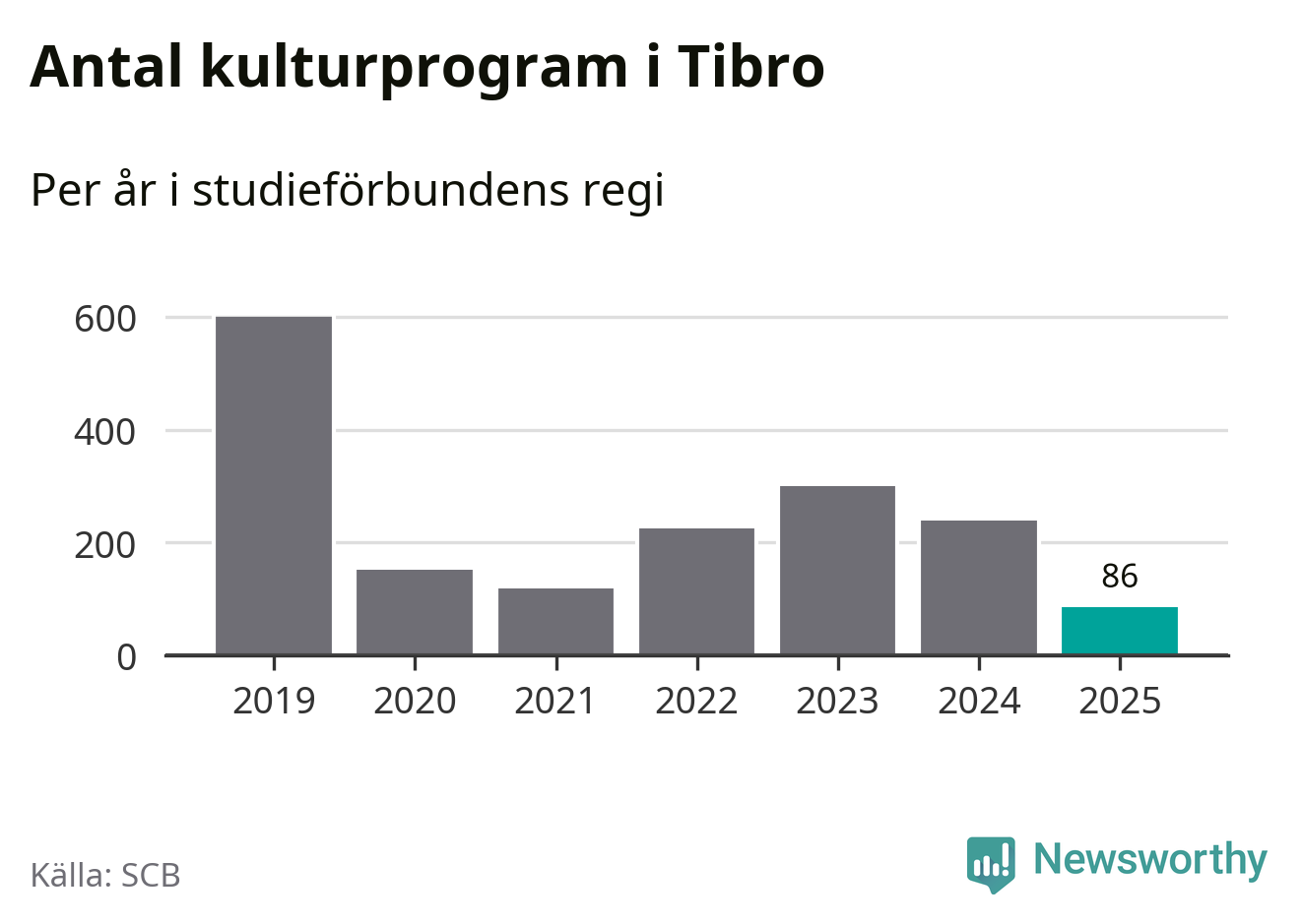 I Tibro är minskningen ännu större: förra året hade studieförbunden omkring 4 400 studietimmar i kommunen, vilket är en minskning med 18 procent jämfört med året innan. Även antalet kulturprogram i studieförbundens regi minskade, från 238 till 86 stycken.