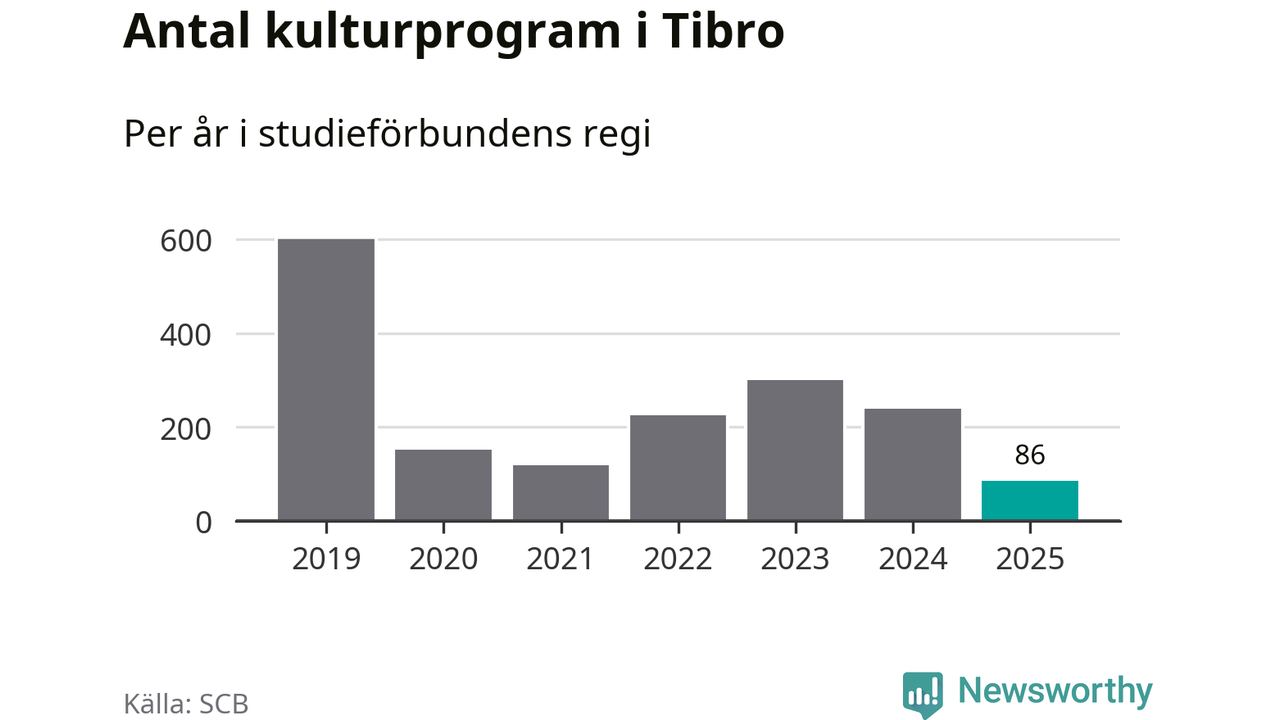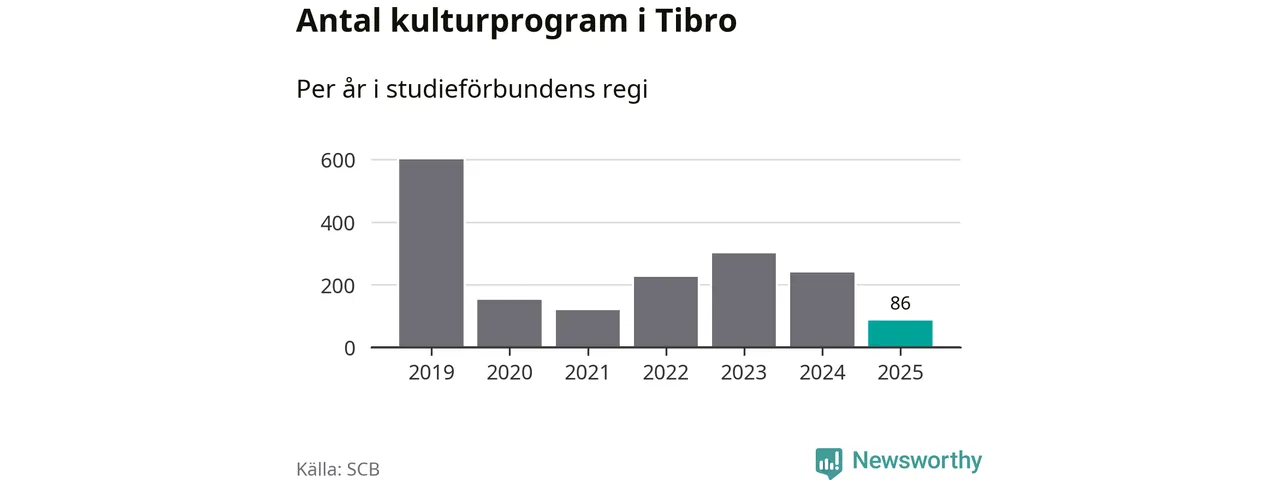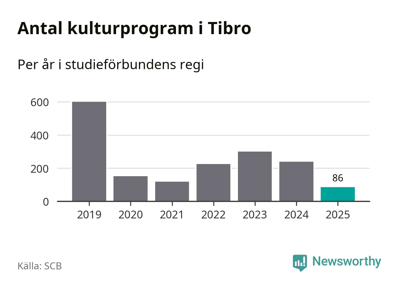 Åtta av de studieförbund som 2025 fick bidrag från Folkbildningsrådet har haft någon form av verksamhet – antingen studiecirkel, annan folkbildning eller kulturprogram – i Tibro under de två senaste åren. Under 2025 ökade Folkuniversitetet och Bilda antalet studietimmar i kommunen jämfört med året innan, medan de sex andra förbunden i kommunen noterade färre timmar.