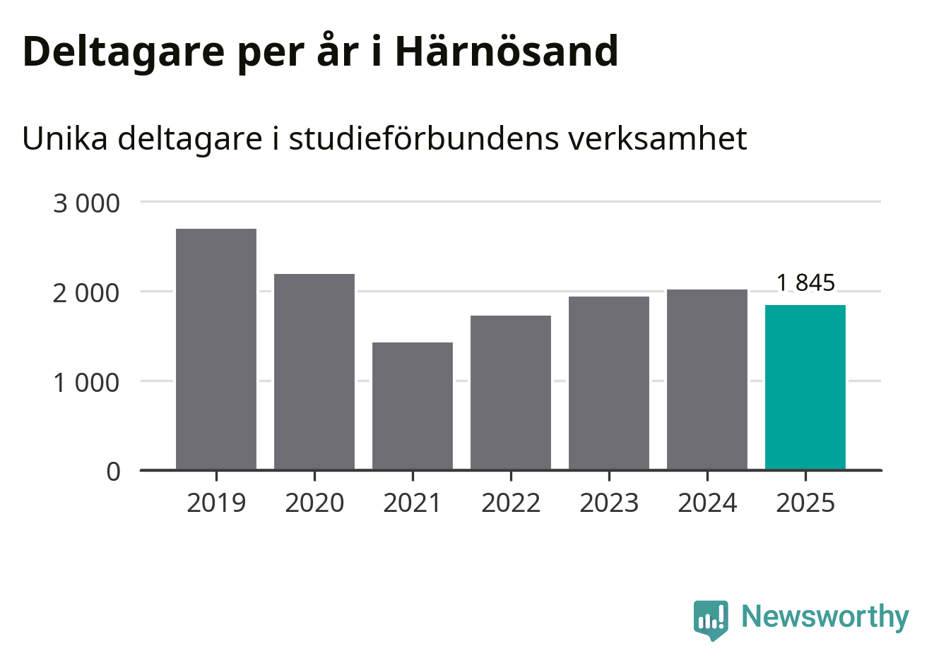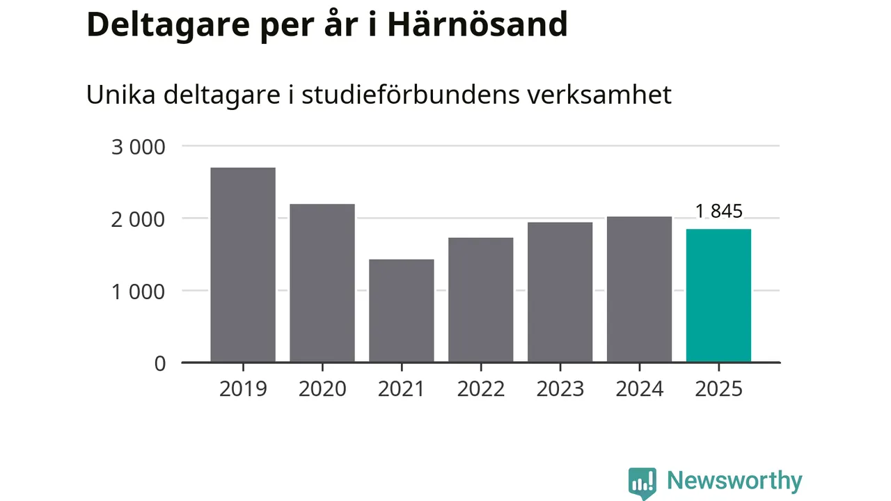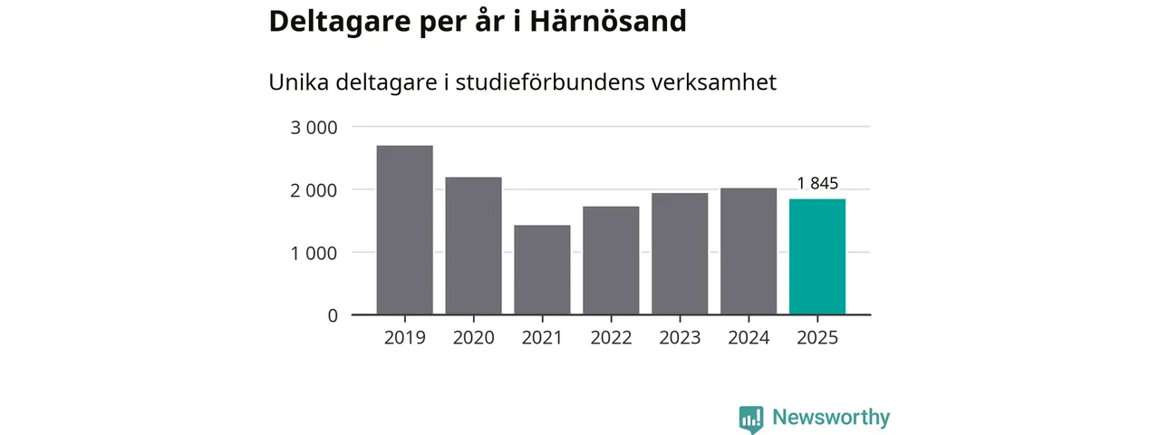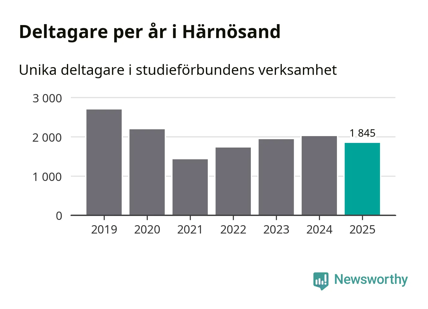 Även sett till unika deltagare är folkbildningen på tillbakagång i Härnösand. 2025 deltog 1 845 personer i studieförbundens verksamhet, vilket är en minskning med åtta procent jämfört med året innan. Det innebär att åtta procent av befolkningen i kommunen deltog i studieförbundens verksamhet under 2025. Det är den näst högsta andelen i Västernorrland.