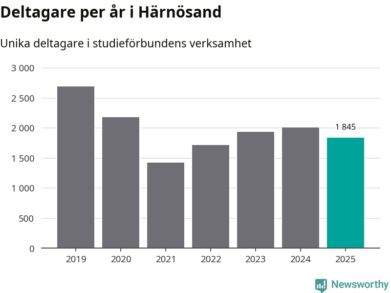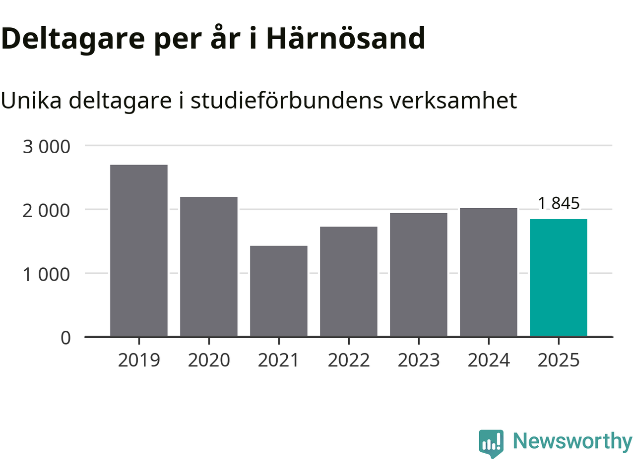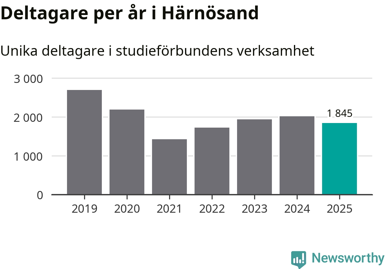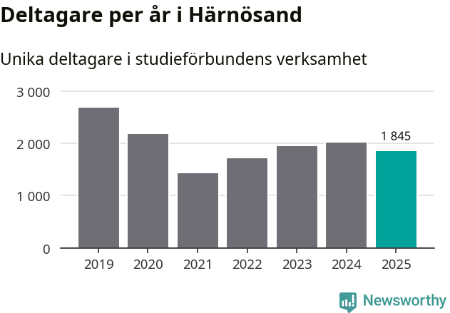 Även sett till unika deltagare är folkbildningen på tillbakagång i Härnösand. 2025 deltog 1 845 personer i studieförbundens verksamhet, vilket är en minskning med åtta procent jämfört med året innan. Det innebär att åtta procent av befolkningen i kommunen deltog i studieförbundens verksamhet under 2025. Det är den näst högsta andelen i Västernorrland.