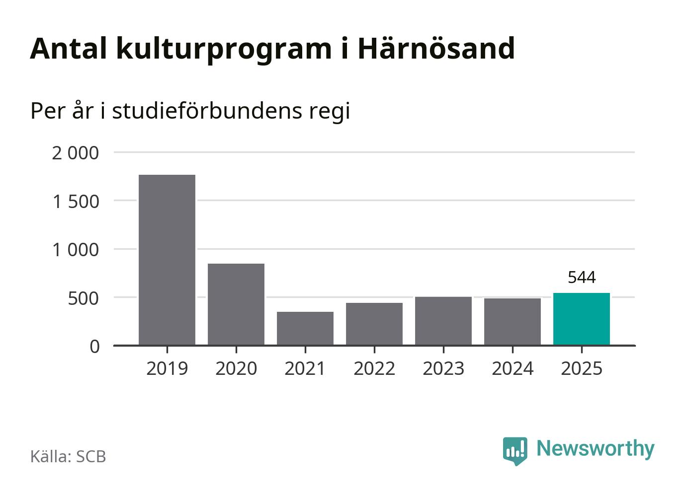 Utvecklingen ser ungefär likadan ut i Härnösand, förra året hade studieförbunden omkring 8 200 studietimmar i kommunen jämfört med omkring 8 800 året innan, en minskning med sju procent. Men medan studiecirklar och annan folkbildningsverksamhet minskade ökade faktiskt antalet kulturarrangemang i studieförbundens regi från omkring 490 till omkring 540.